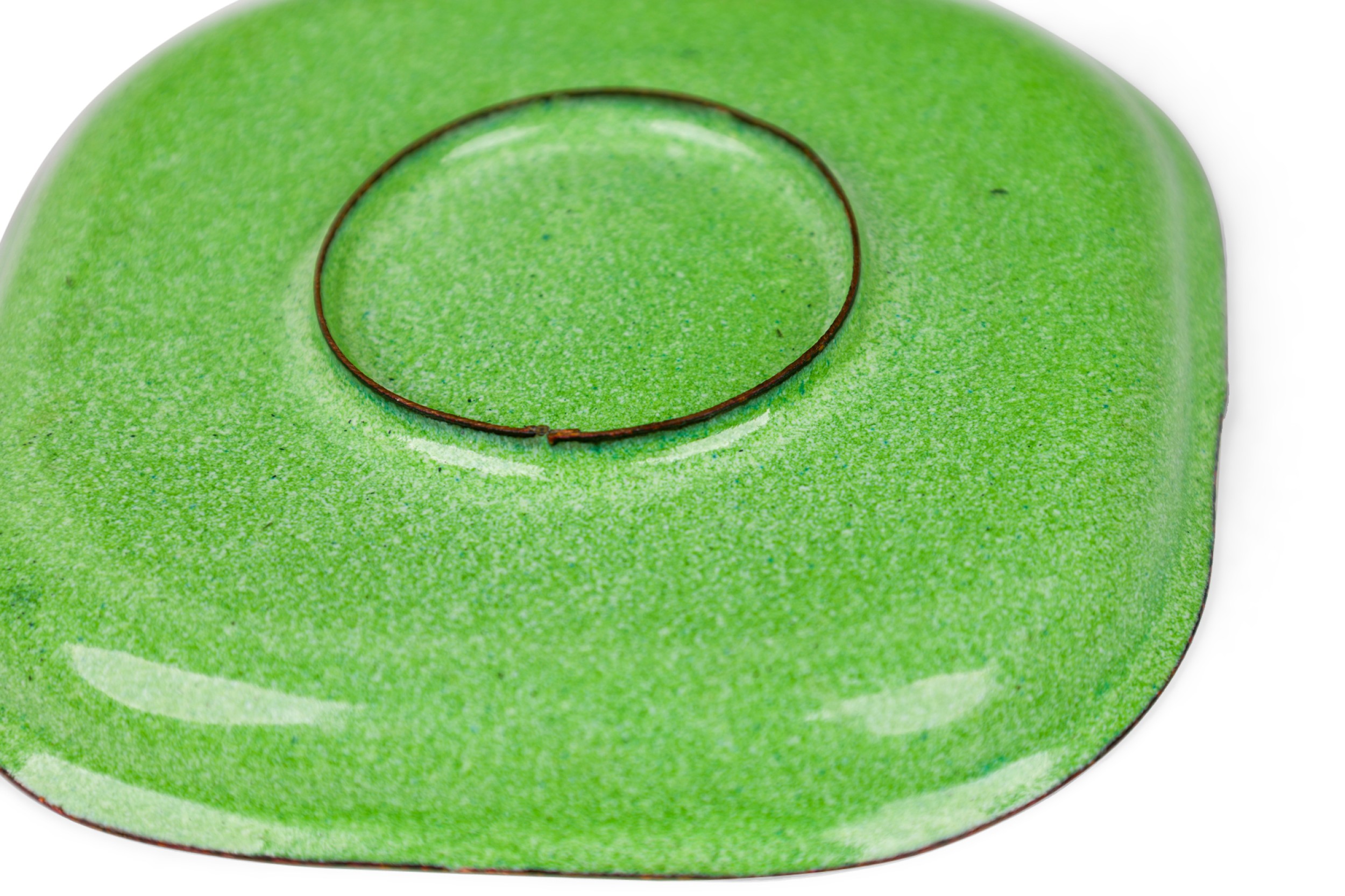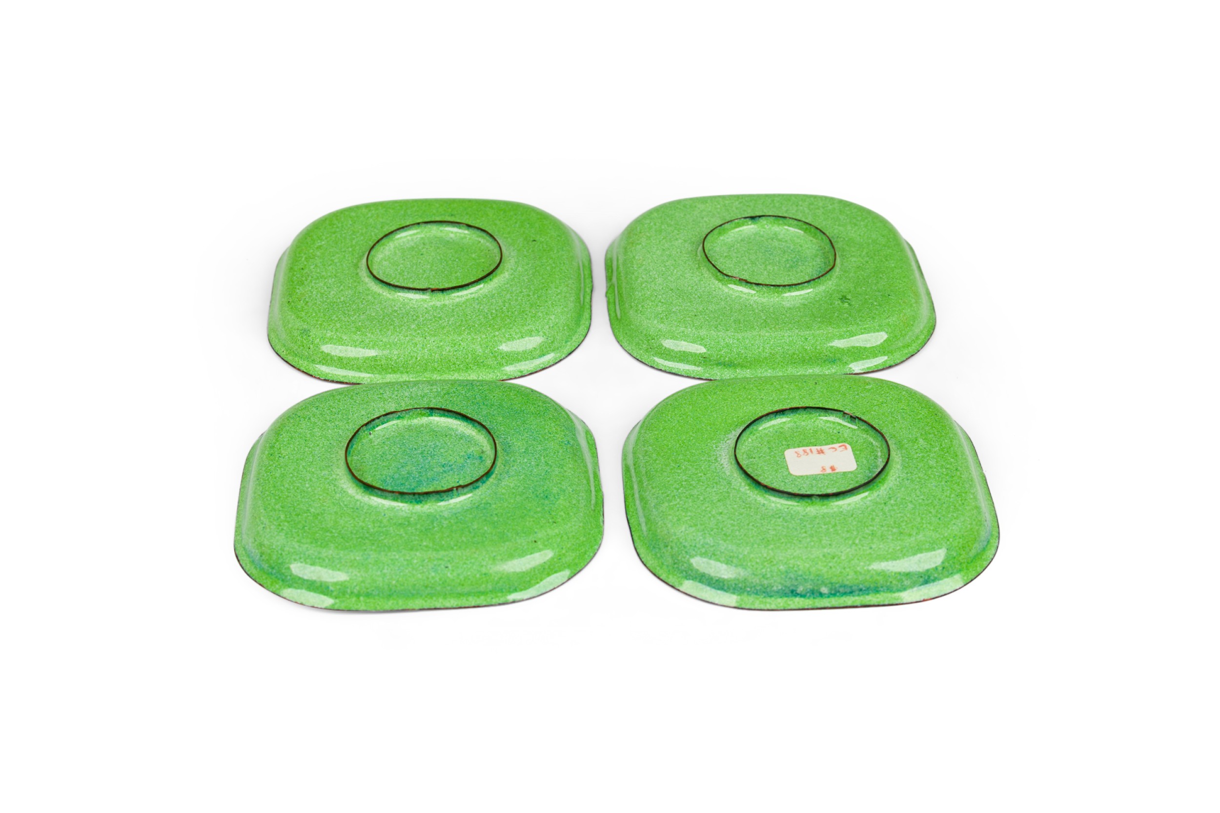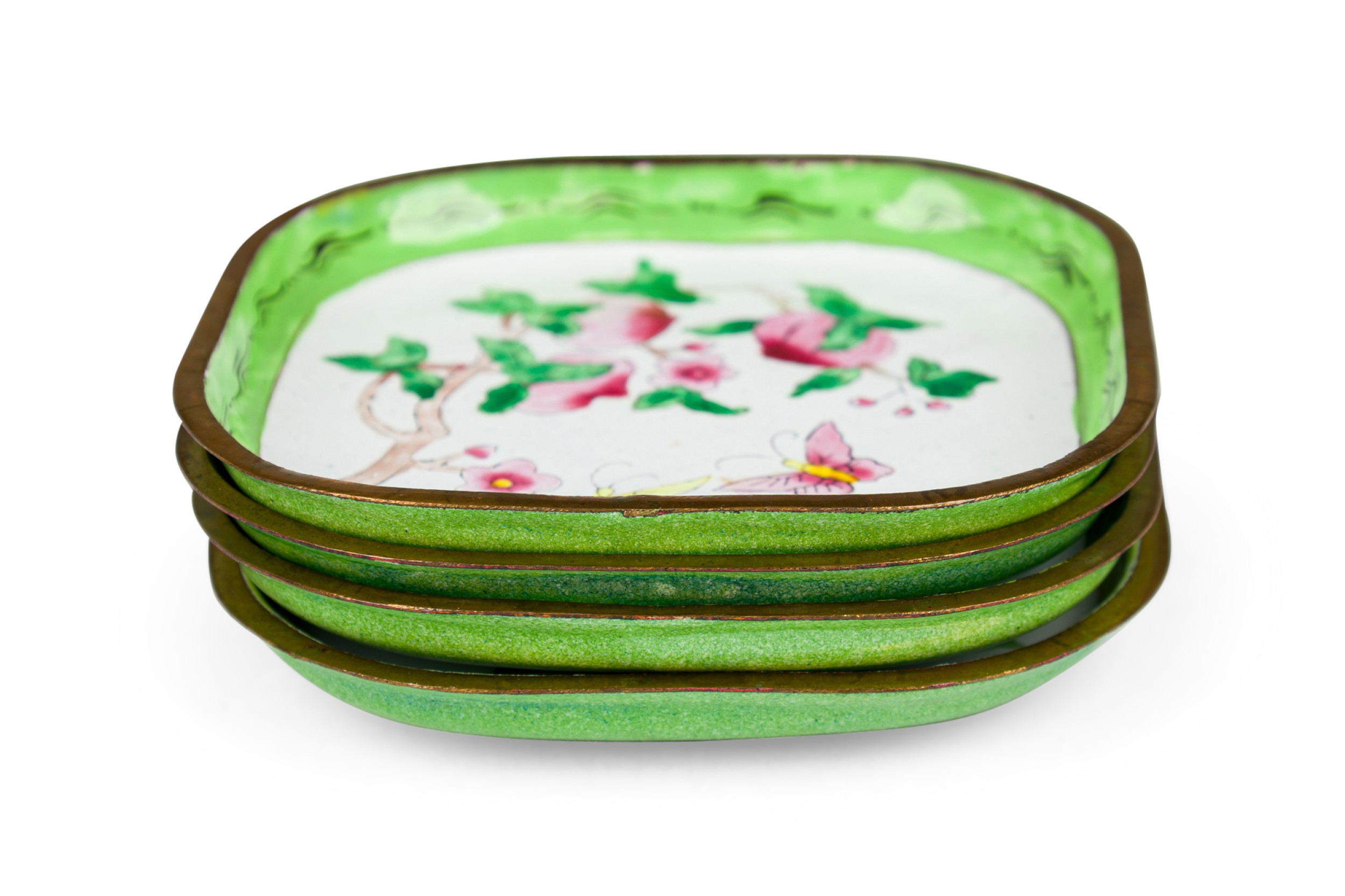 SET of 4 French Victorian green and white enamel on copper square shaped plates with a floral design (PRICED AS SET)