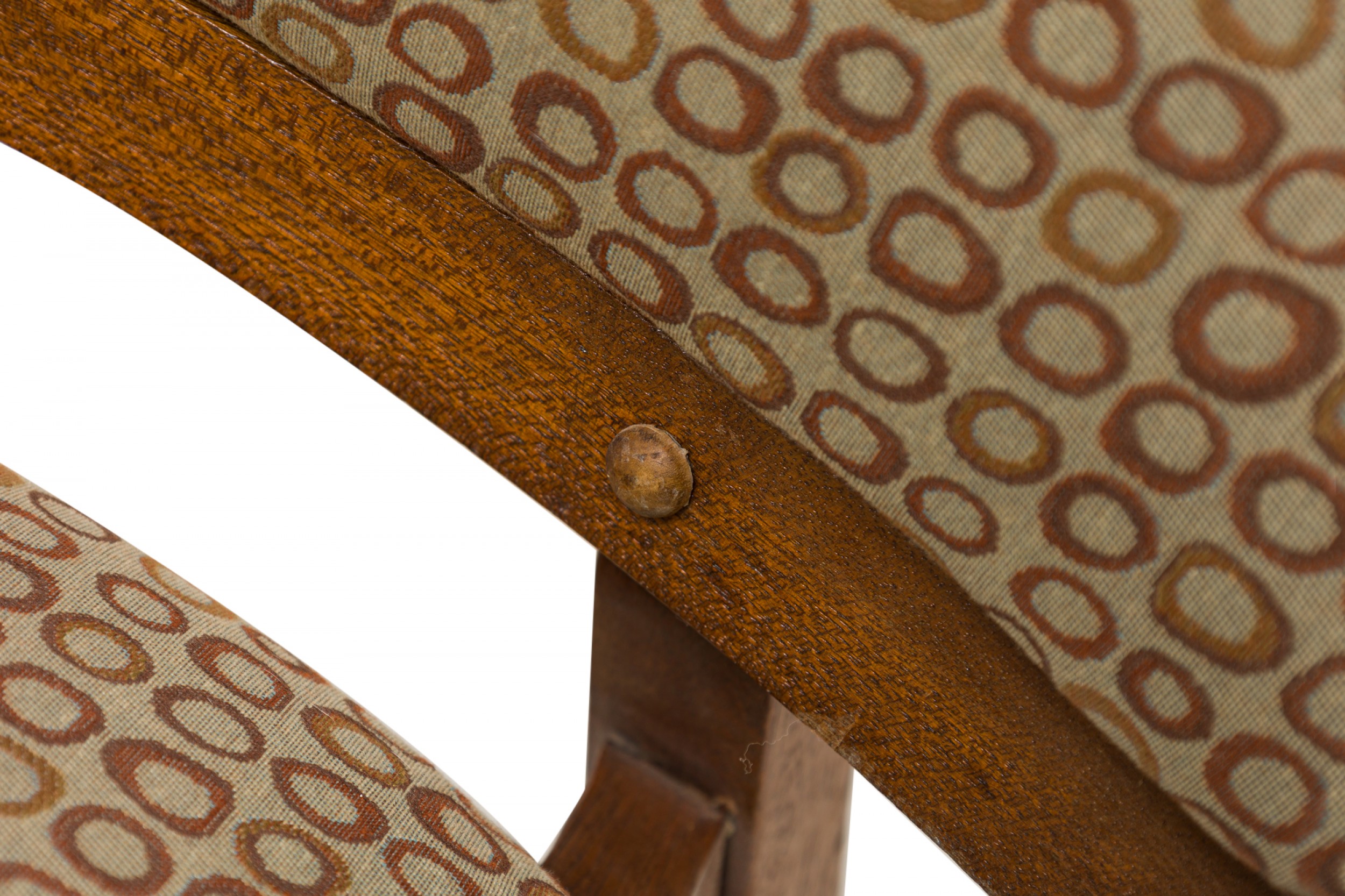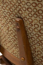 Style: Mid-Century Materials & Techniques: Fabric, upholstered, wood Category: Seating, Dining Room Condition: One has a detached back, one has a detached seat. Wear to finish on wood from age & use. Good; Minor losses