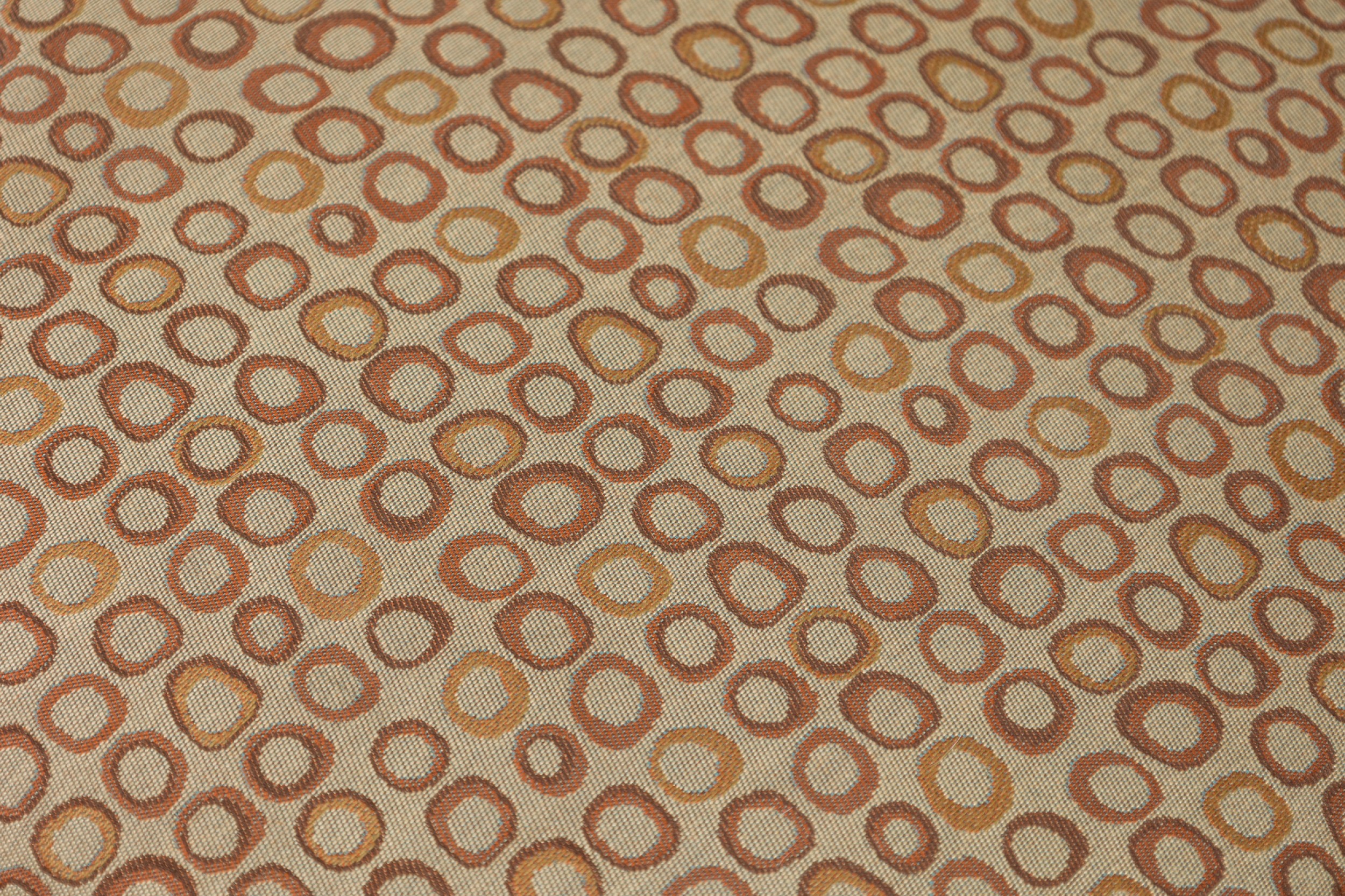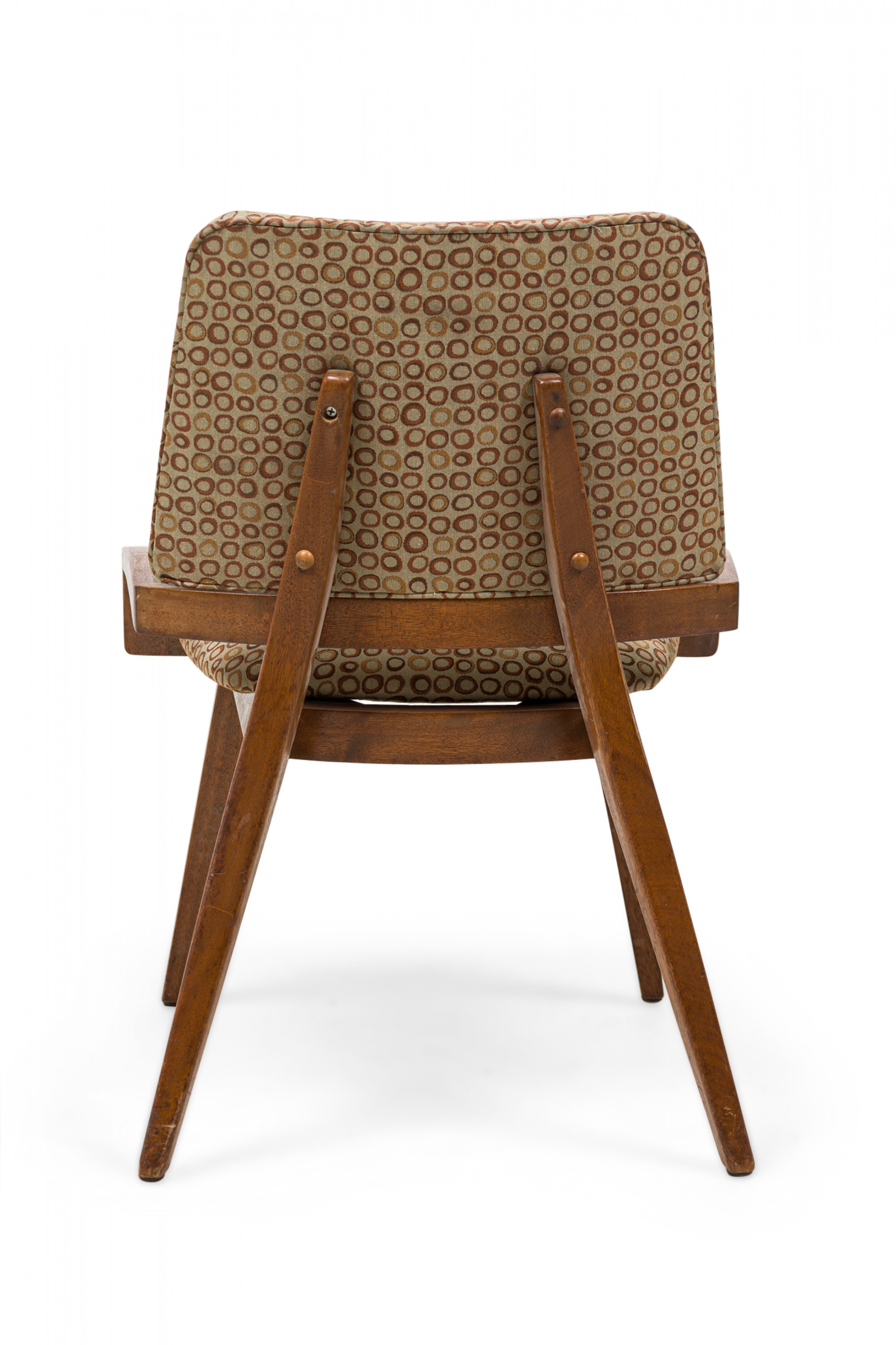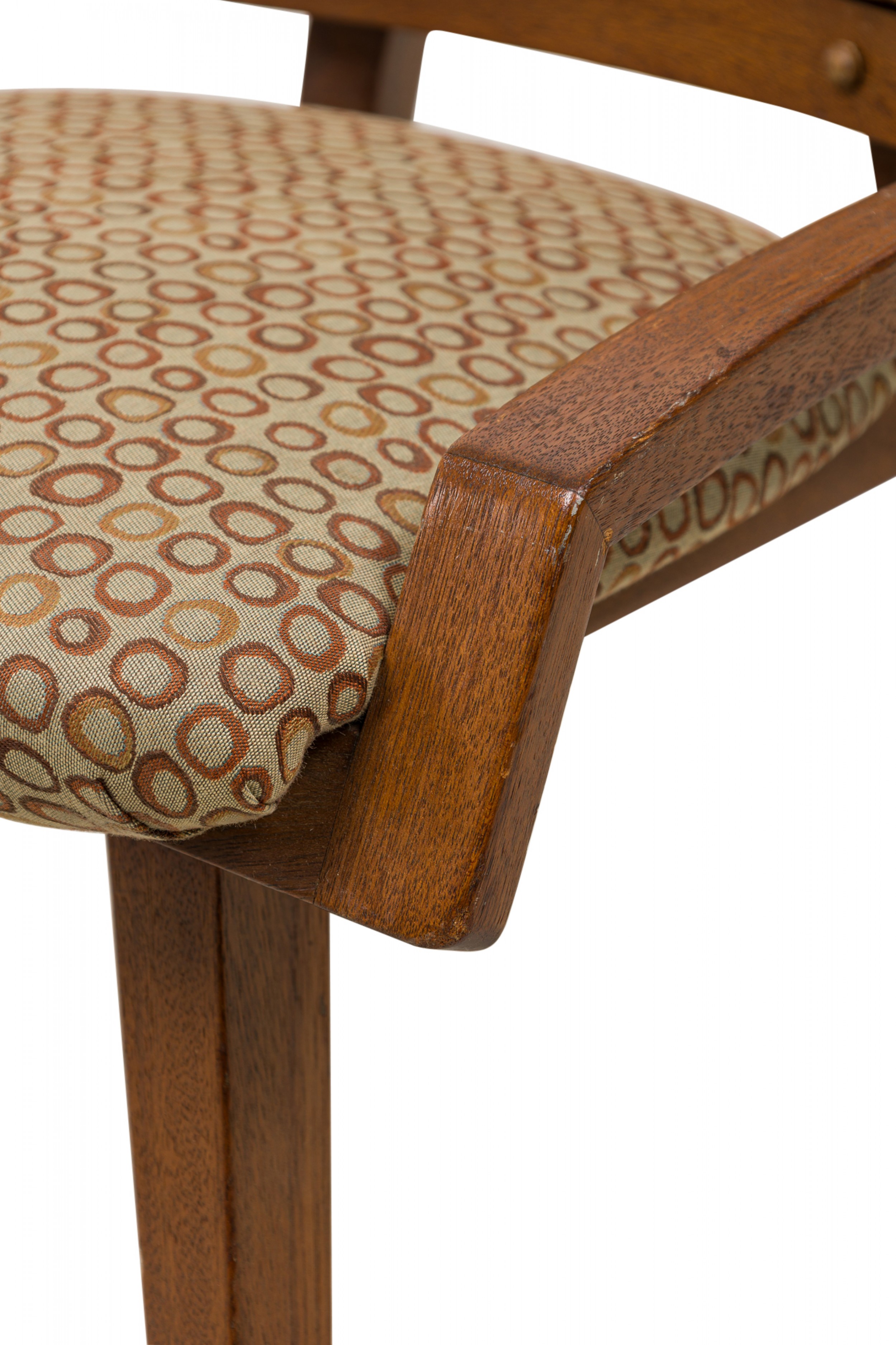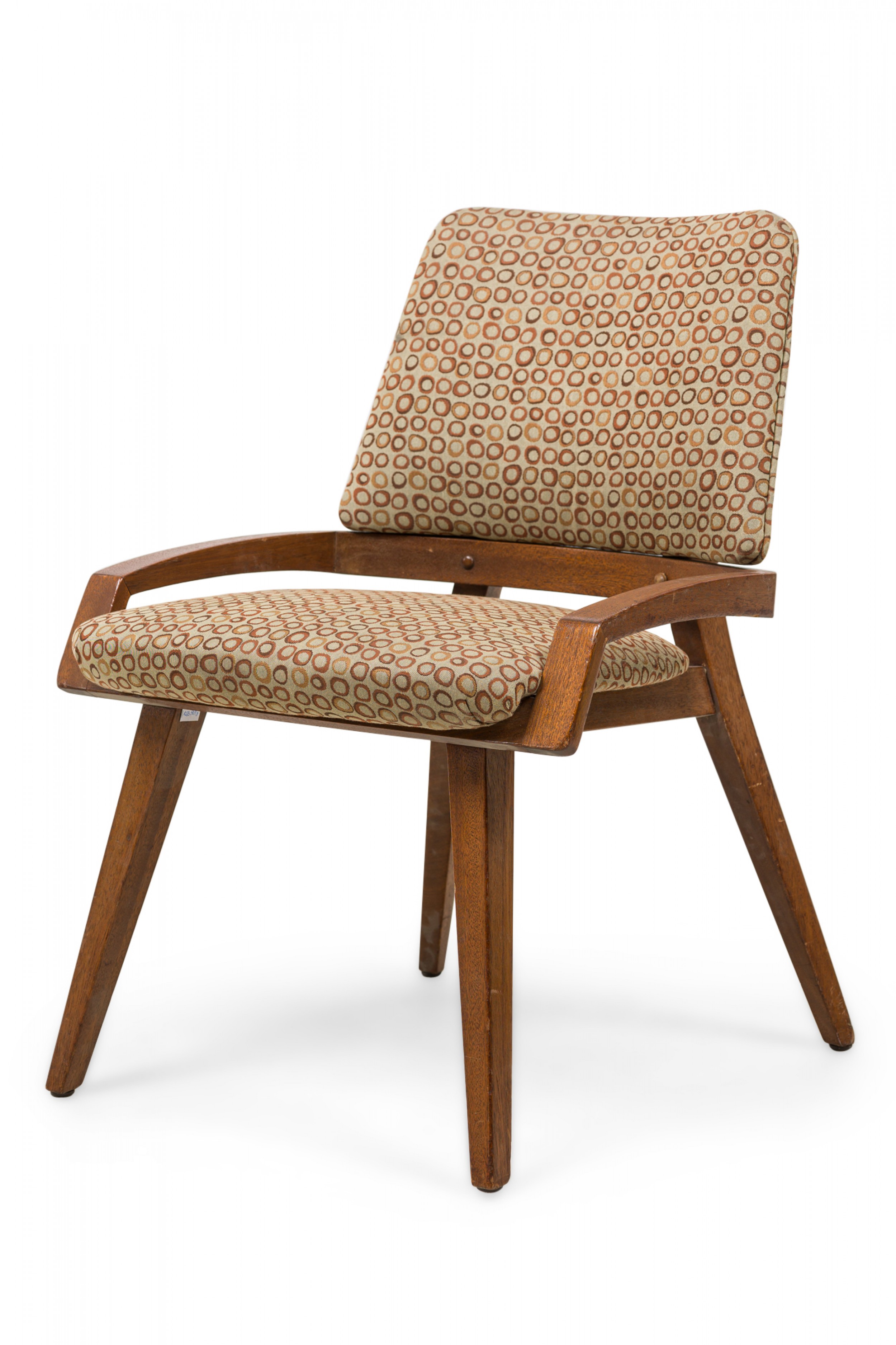 SET of 4 Mid-Century American Modern (1950s) armchairs with stylized low arms with the back and seat upholstered in a beige / taupe circular patterned fabric and standing on 4 tapered splayed legs (JOHN KEAL) (PRICED AS SET)