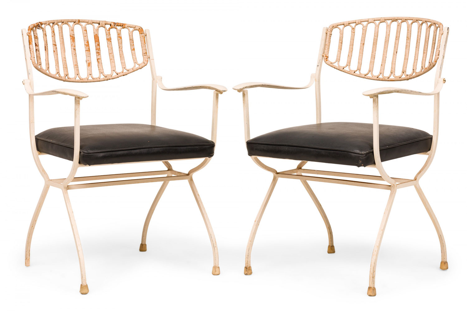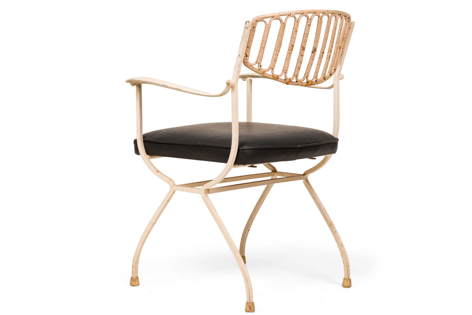 SET of 4 Mid-Century metal dining armchairs with openwork, wrapped rope-form metal backs with beige painted finish and black vinyl seats. (JOHN SALTERINI)(PRICED AS SET)
