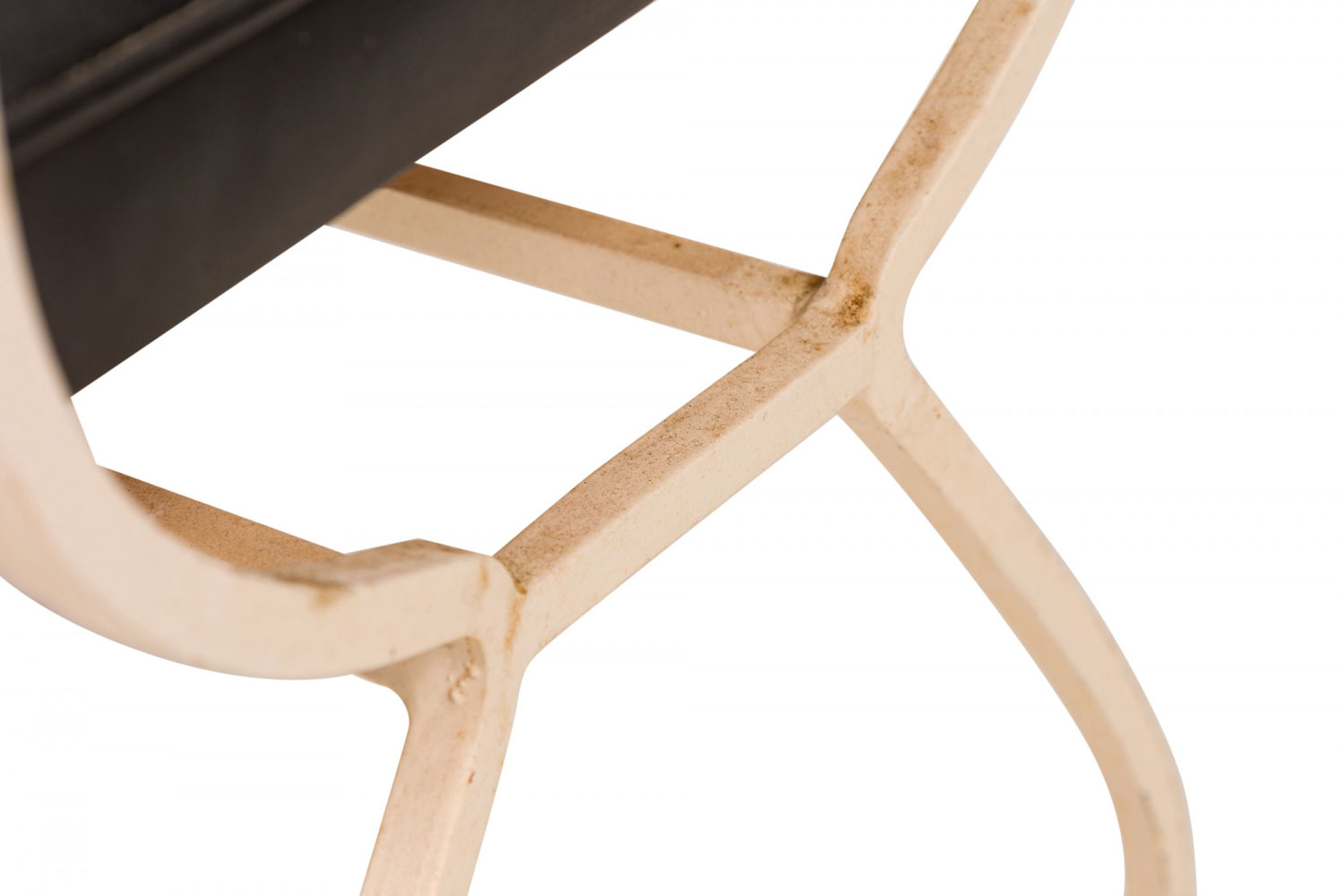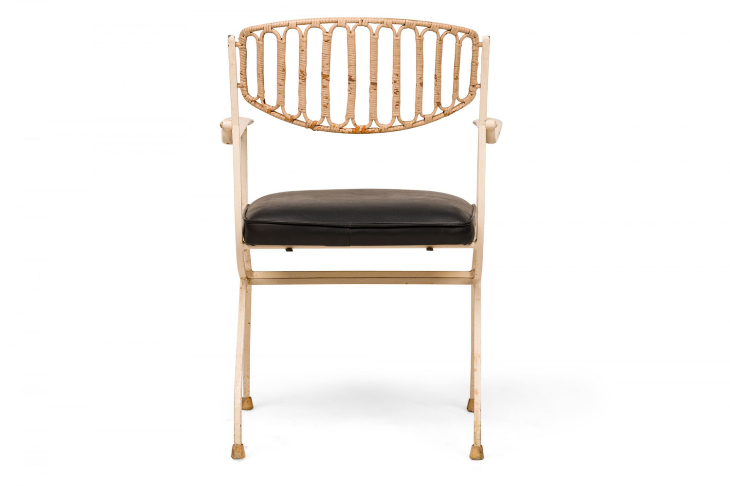 SET of 4 Mid-Century metal dining armchairs with openwork, wrapped rope-form metal backs with beige painted finish and black vinyl seats. (JOHN SALTERINI)(PRICED AS SET).