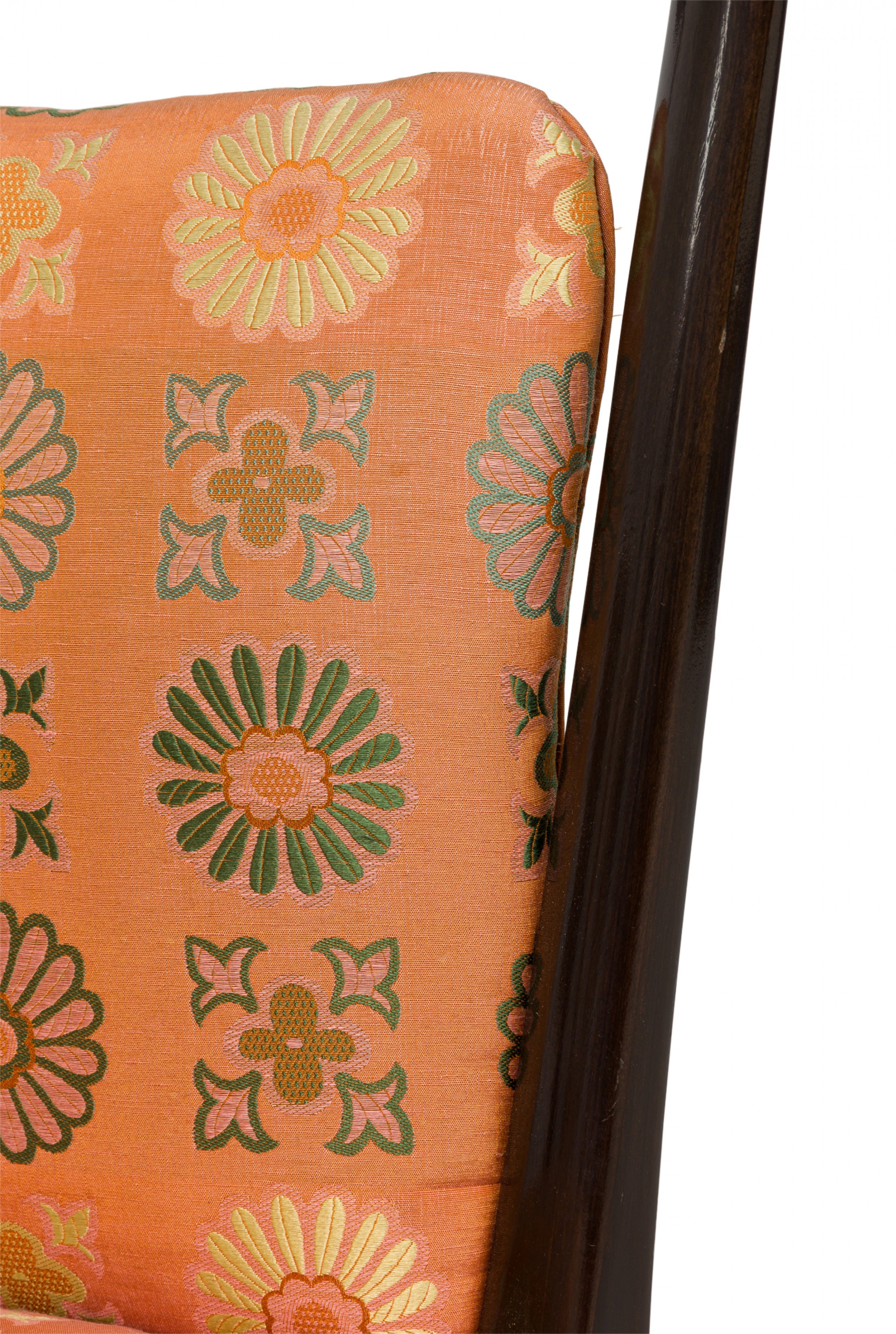 Style: Mid-Century Materials & Techniques: Fabric, upholstered, wood Category: Seating, Dining Room Condition: Some wear to finish on the frames, some wear & tear to under-seat facing. Good; Wear consistent with age and use