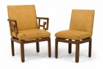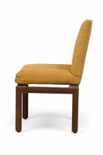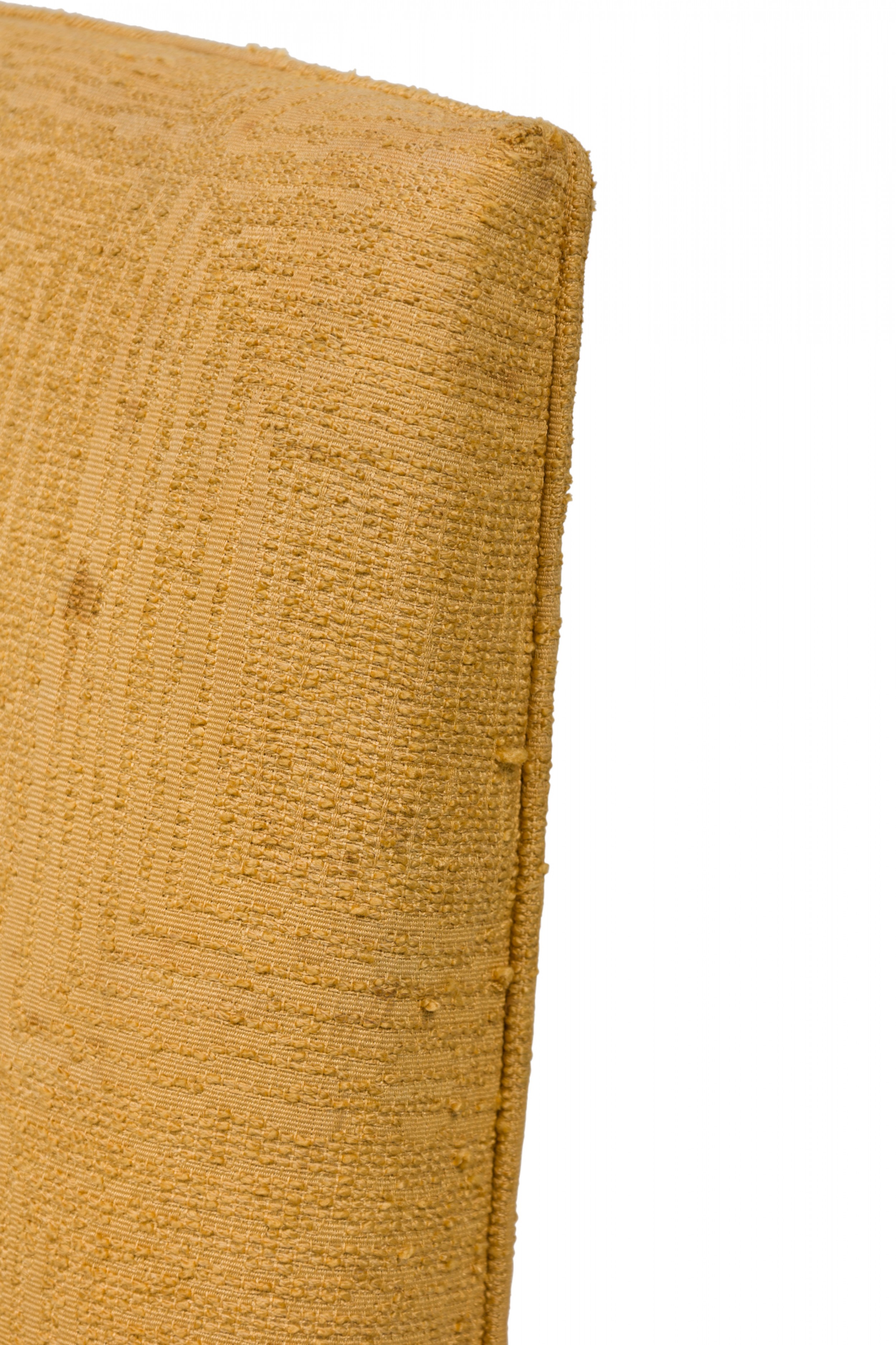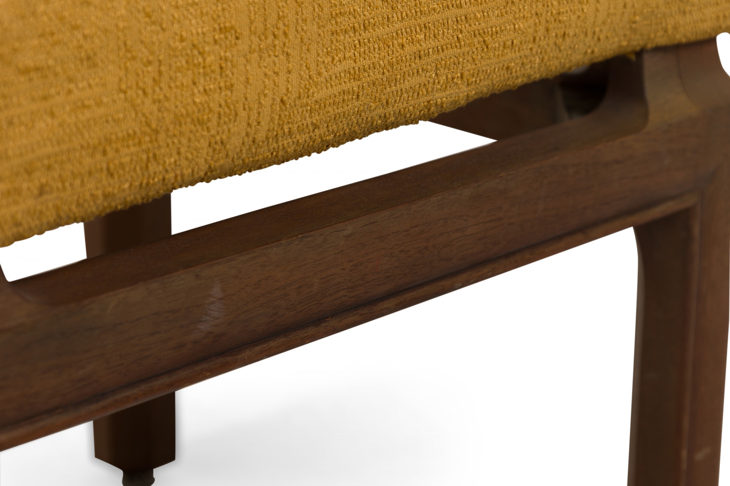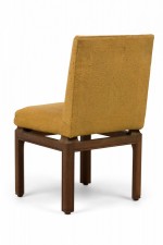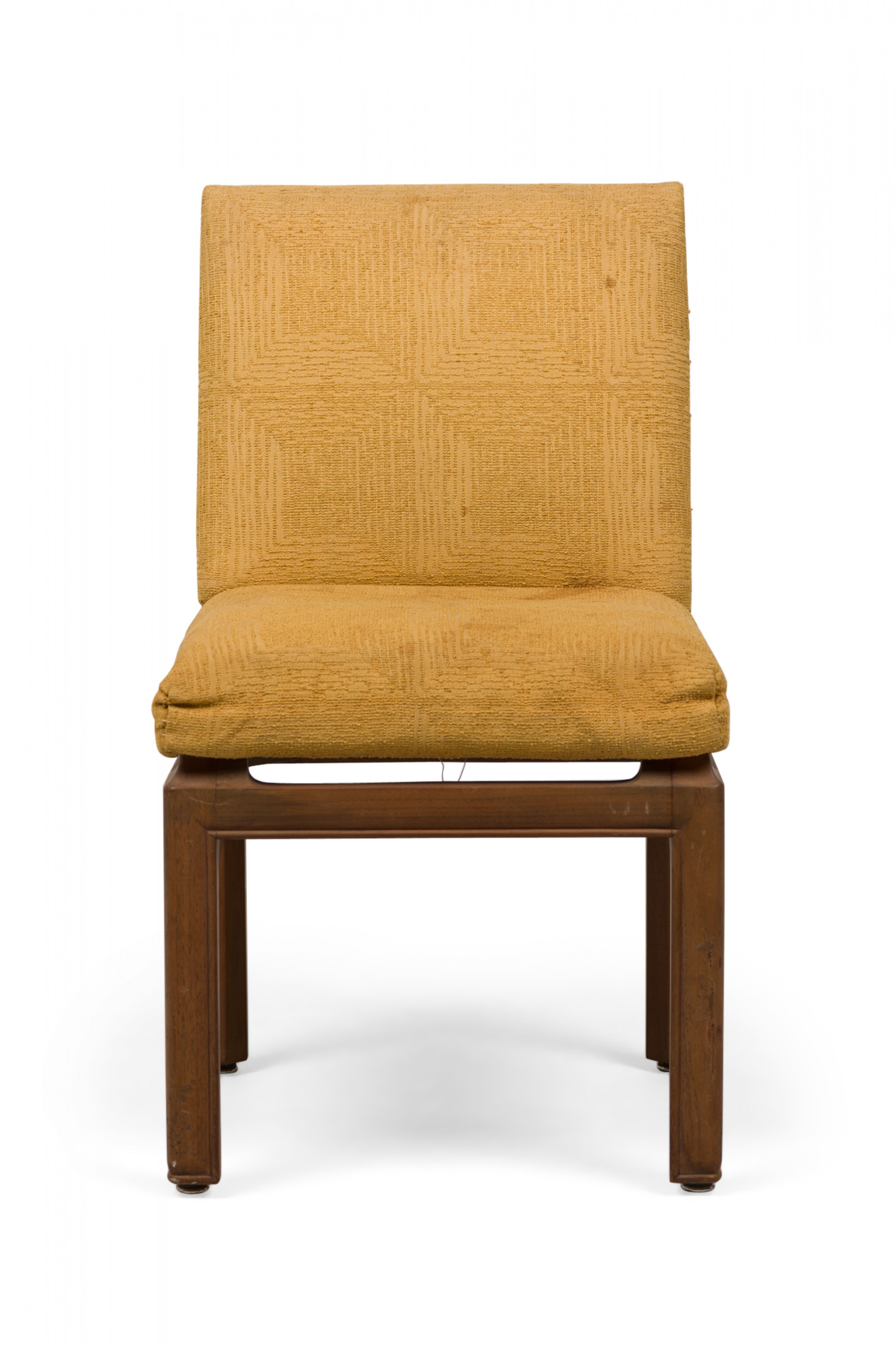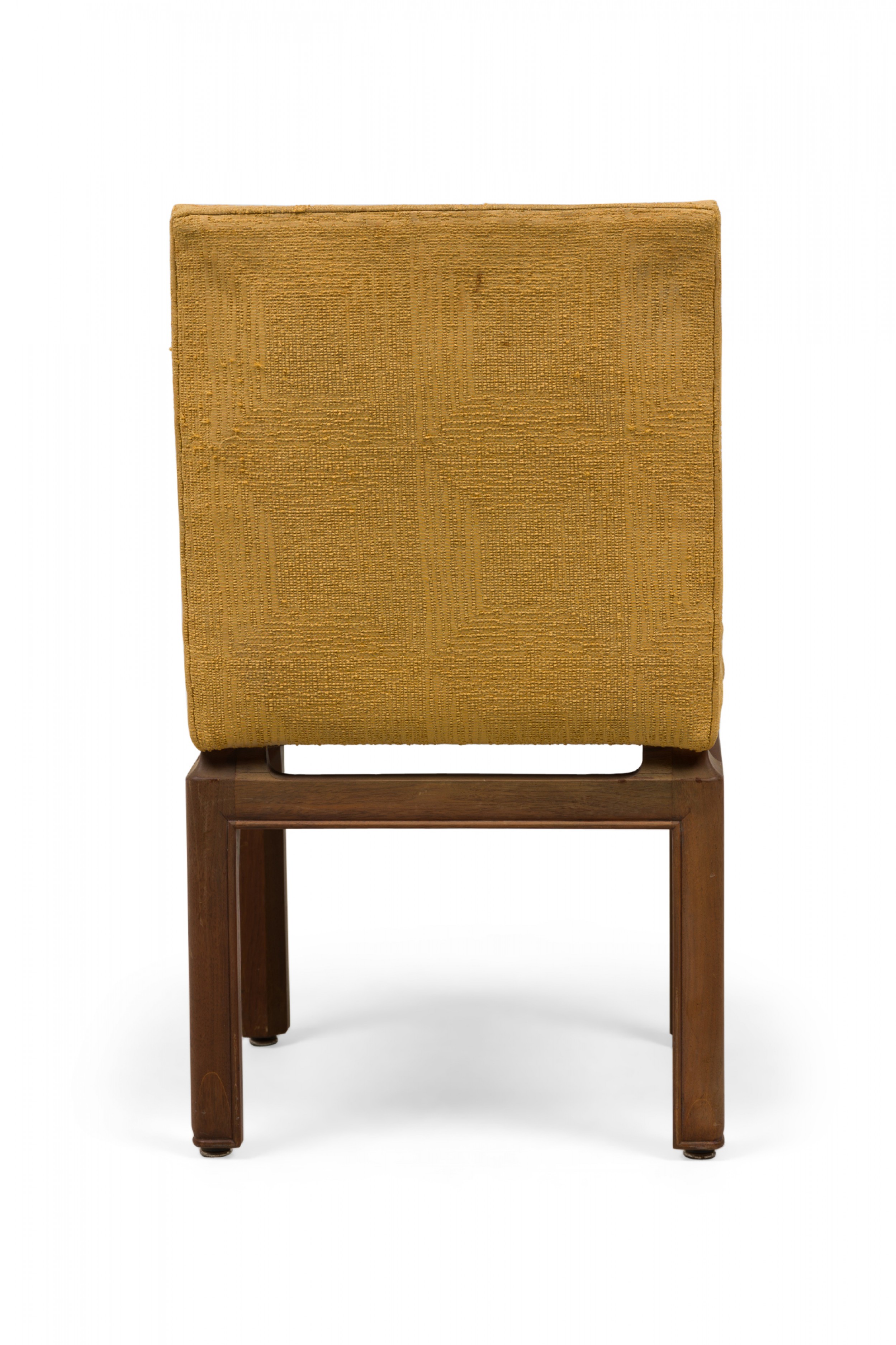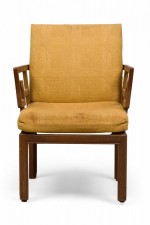 SET of 4 Mid-Century American Modern (1950s) "Far East" mahogany dining chairs (2 armchairs, 2 side chairs) featuring slightly splayed keyfret arms, the back and seat upholstered in a square-patterned textured gold fabric, standing on 4 molded legs. (MICHAEL TAYLOR FOR BAKER FURNITURE) (PRICED AS SET)