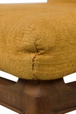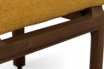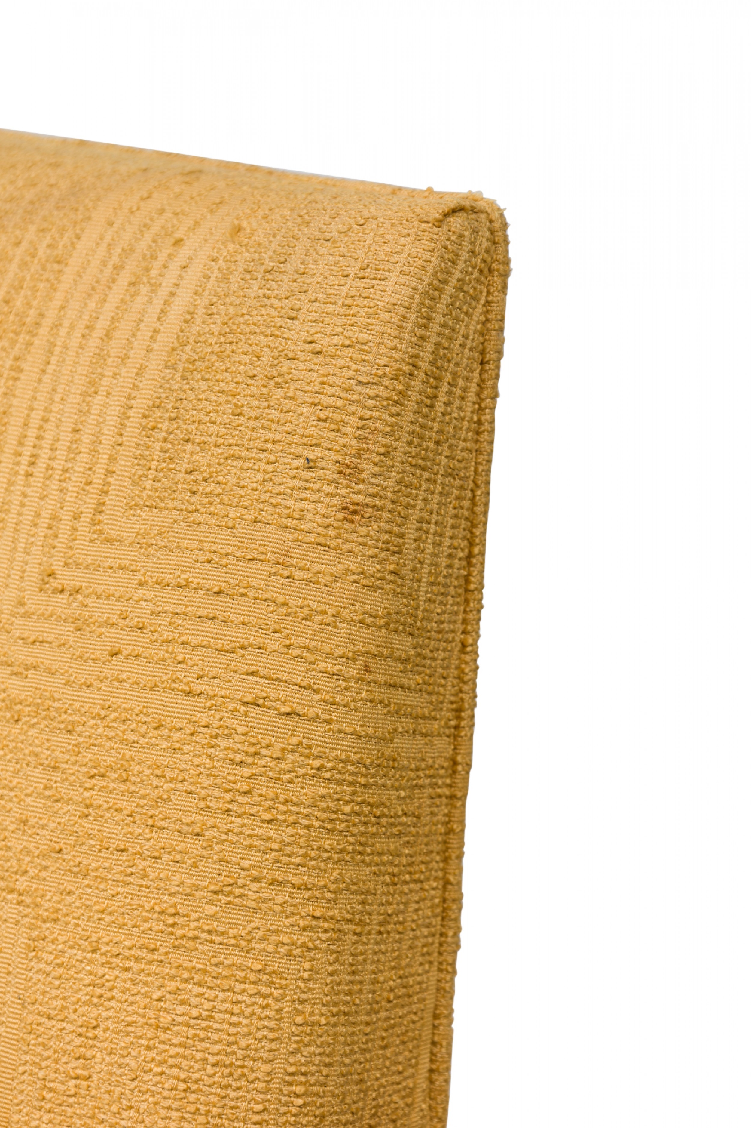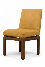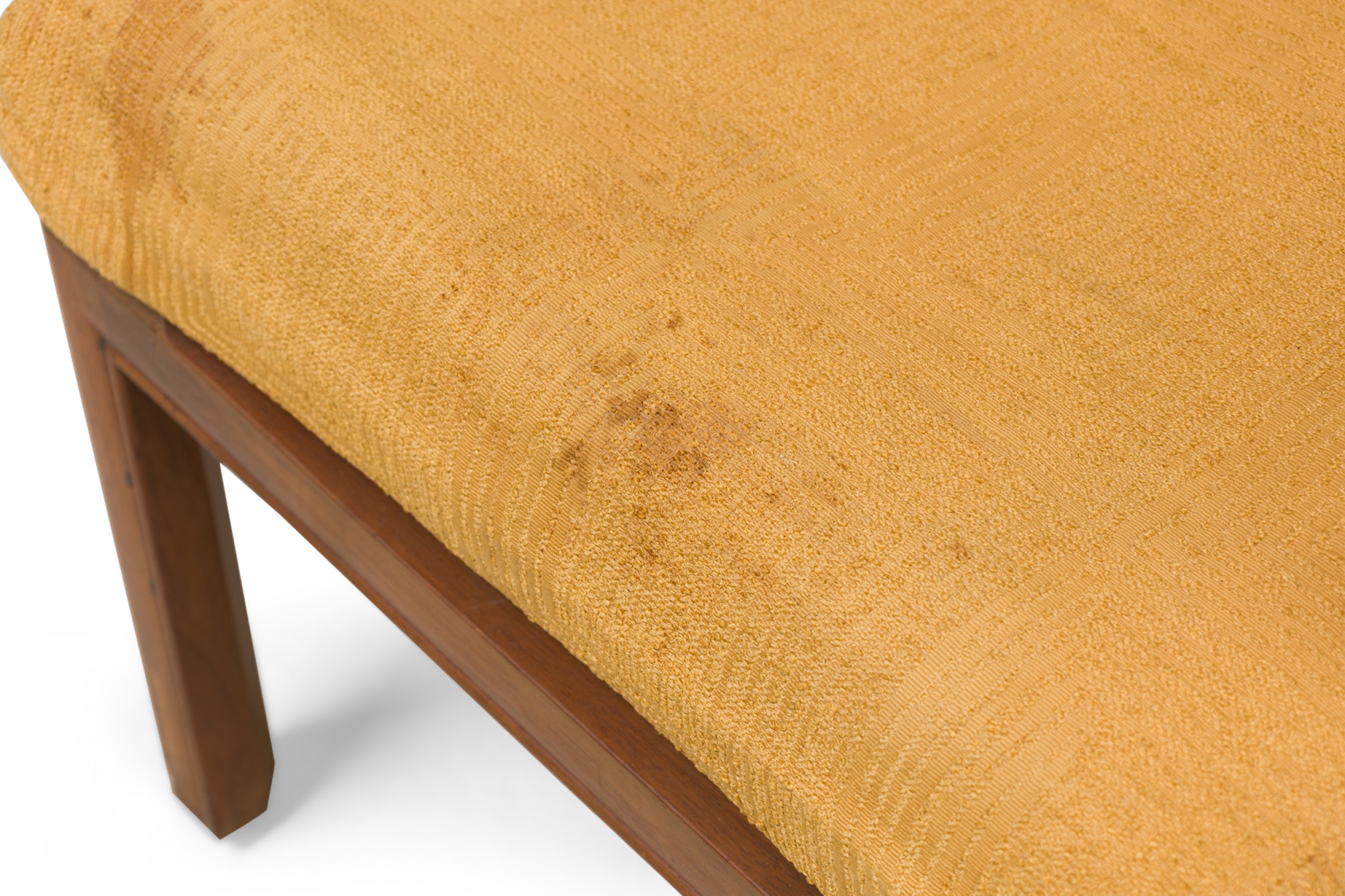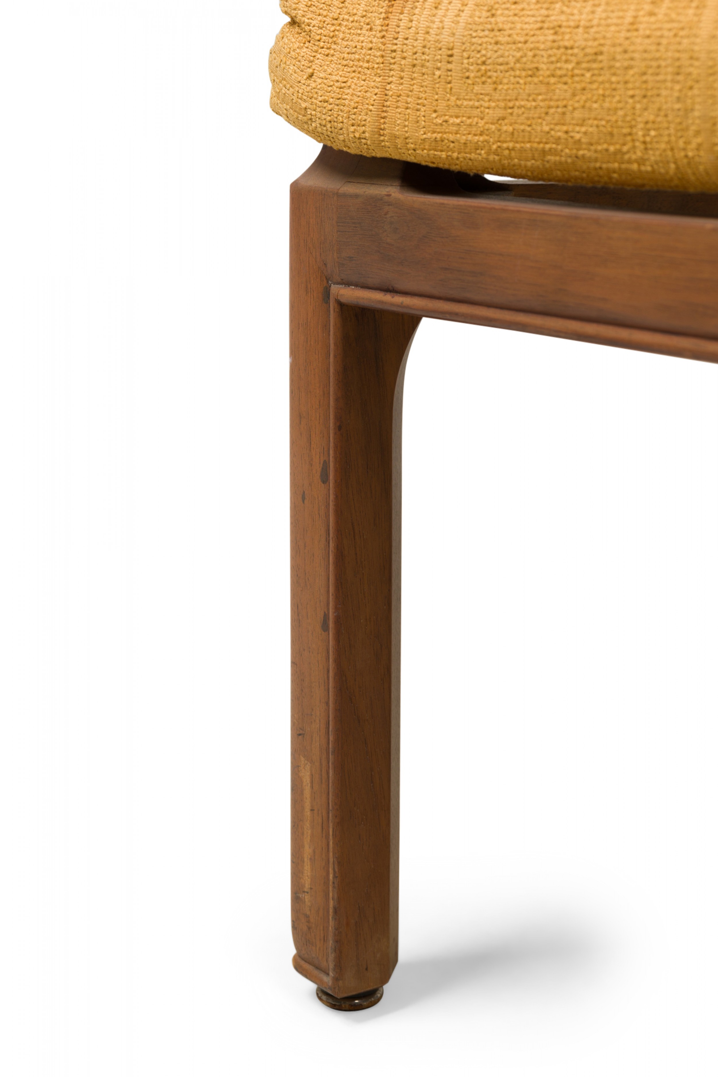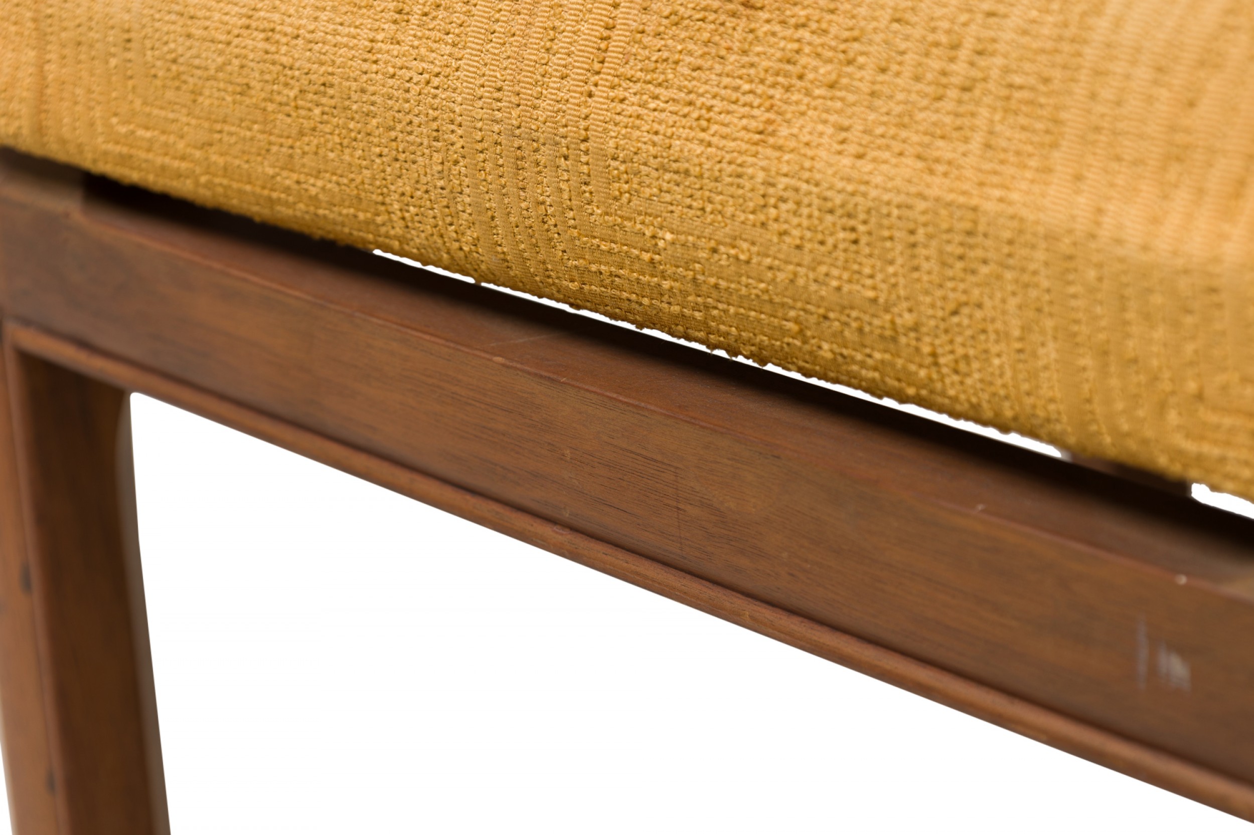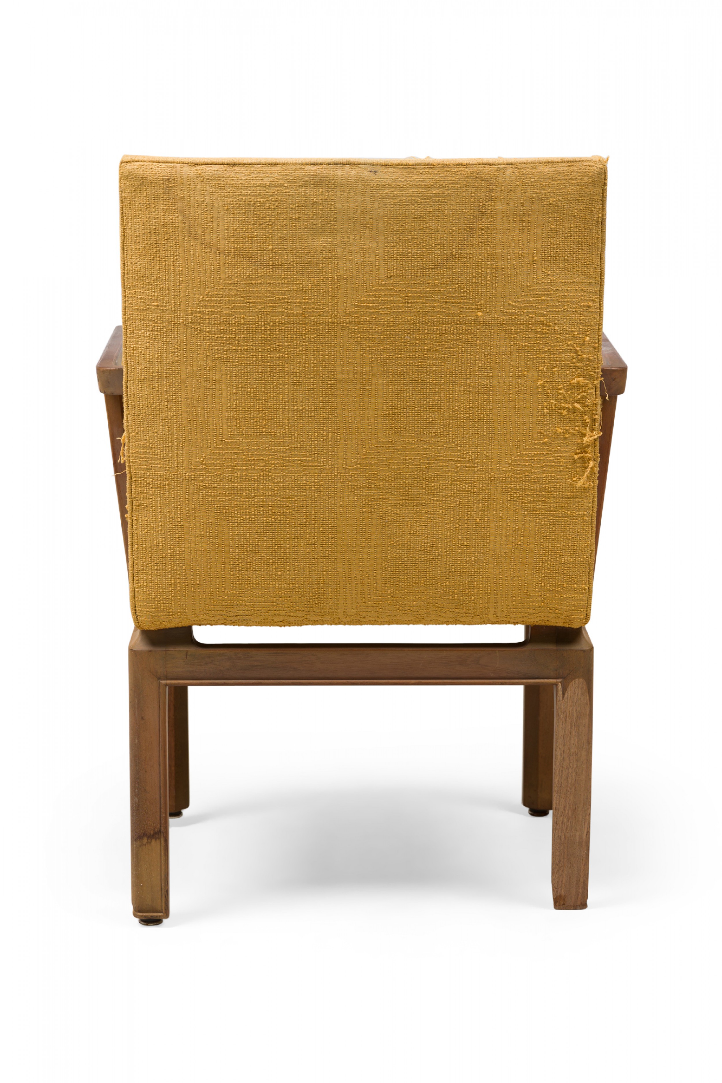 SET of 4 Mid-Century American Modern (1950s) "Far East" mahogany dining chairs (2 armchairs, 2 side chairs) featuring slightly splayed keyfret arms, the back and seat upholstered in a square-patterned textured gold fabric, standing on 4 molded legs. (MICHAEL TAYLOR FOR BAKER FURNITURE) (PRICED AS SET)