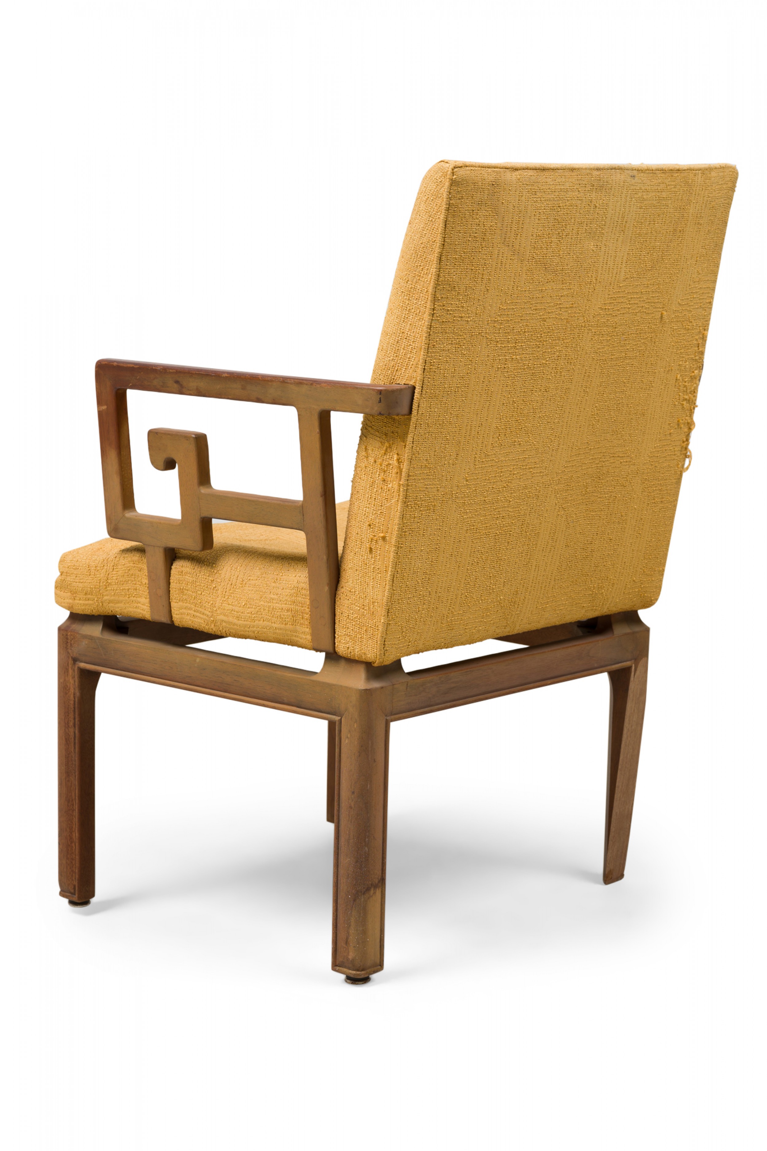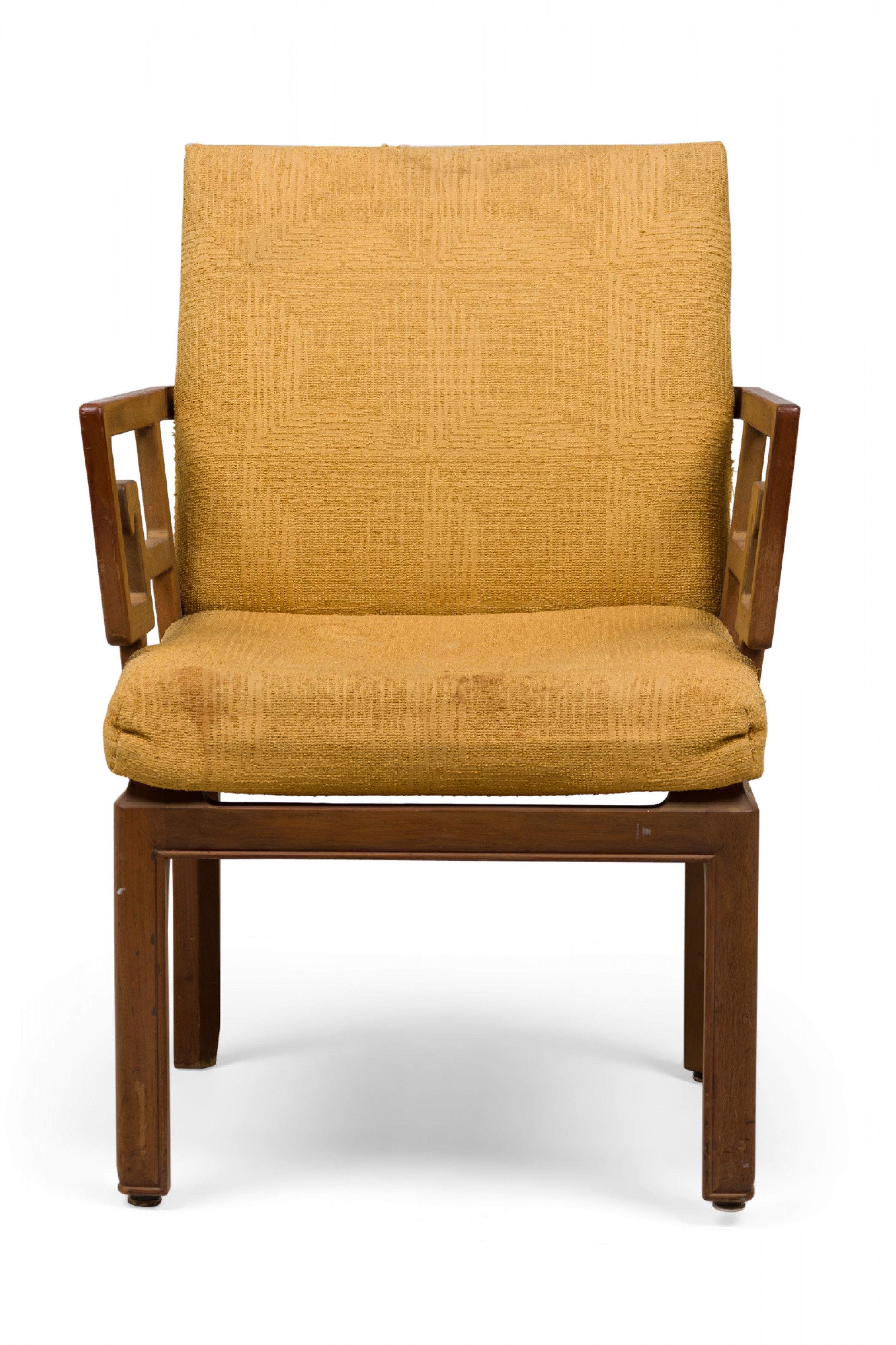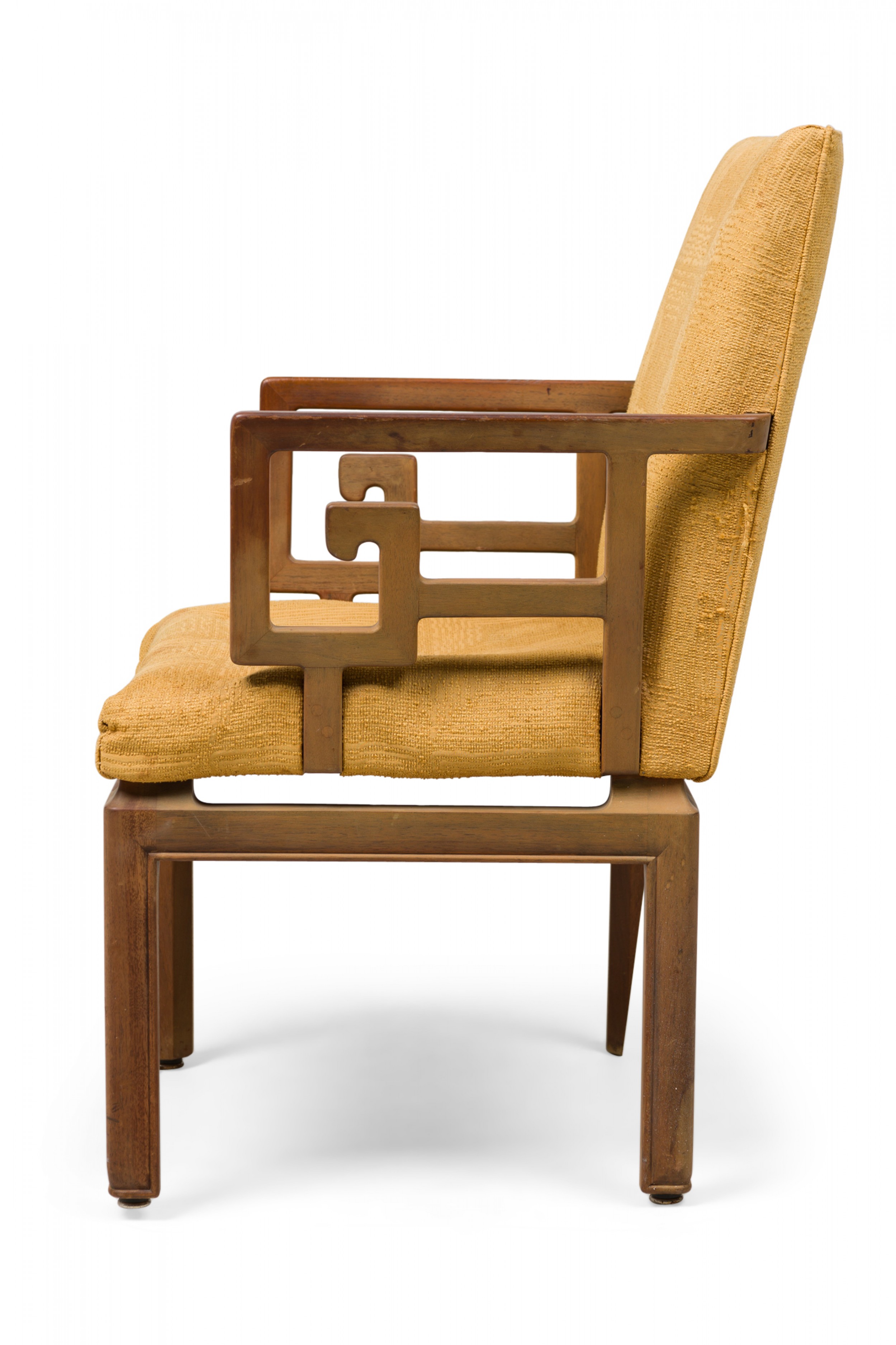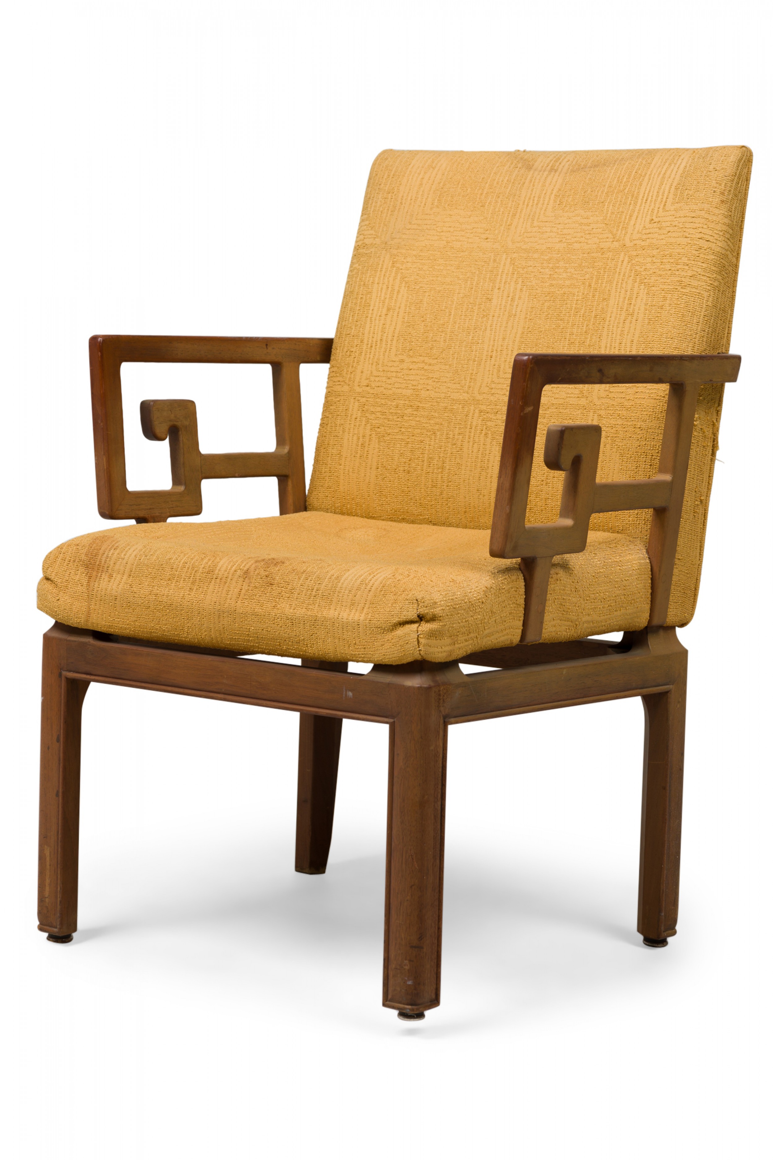 SET of 4 Mid-Century American Modern (1950s) "Far East" mahogany dining chairs (2 armchairs, 2 side chairs) featuring slightly splayed keyfret arms, the back and seat upholstered in a square-patterned textured gold fabric, standing on 4 molded legs. (MICHAEL TAYLOR FOR BAKER FURNITURE) (PRICED AS SET).