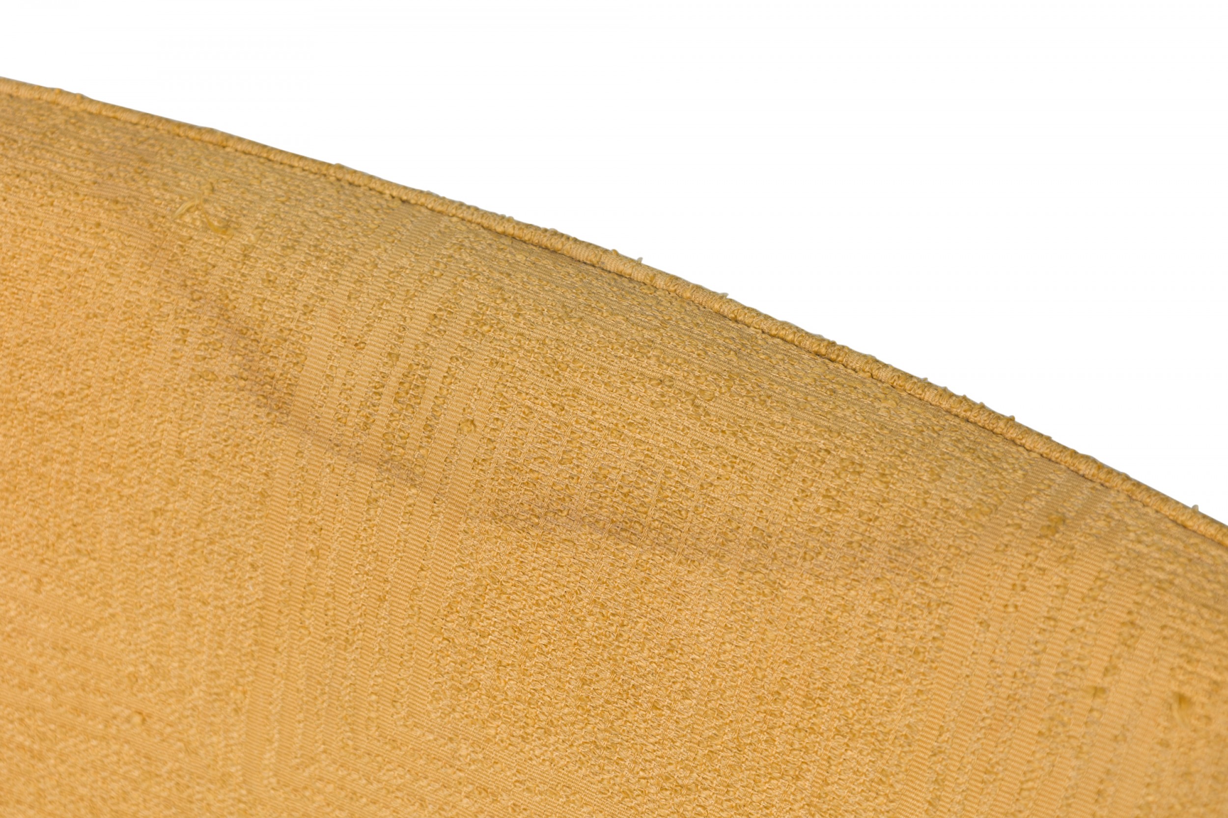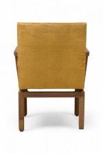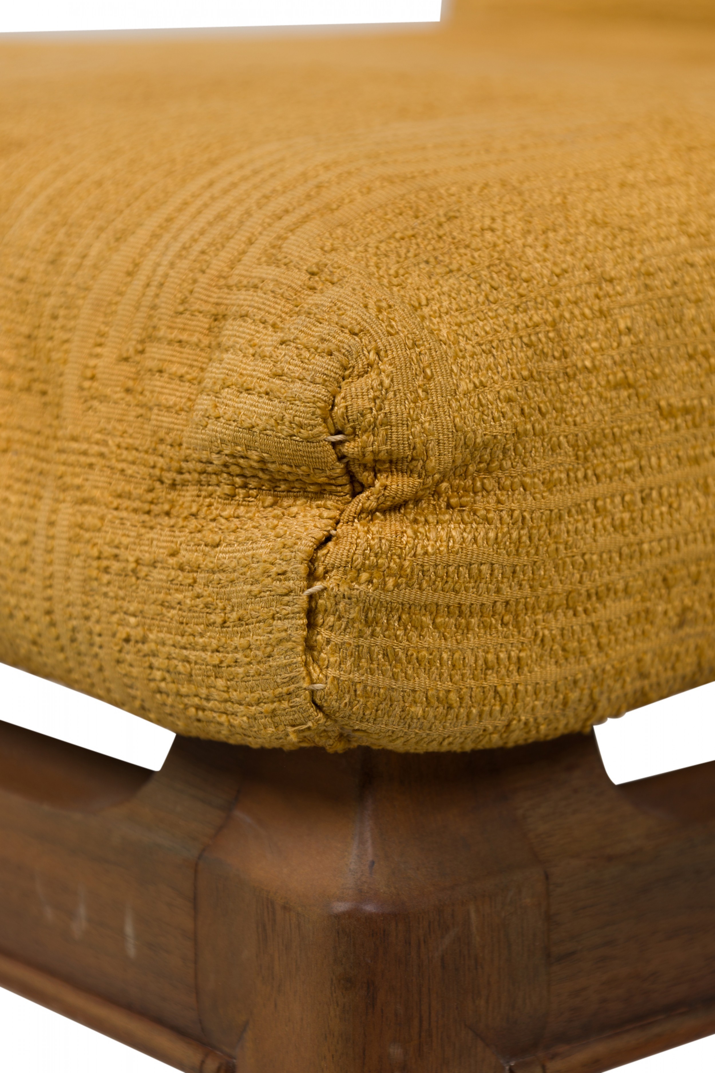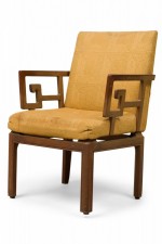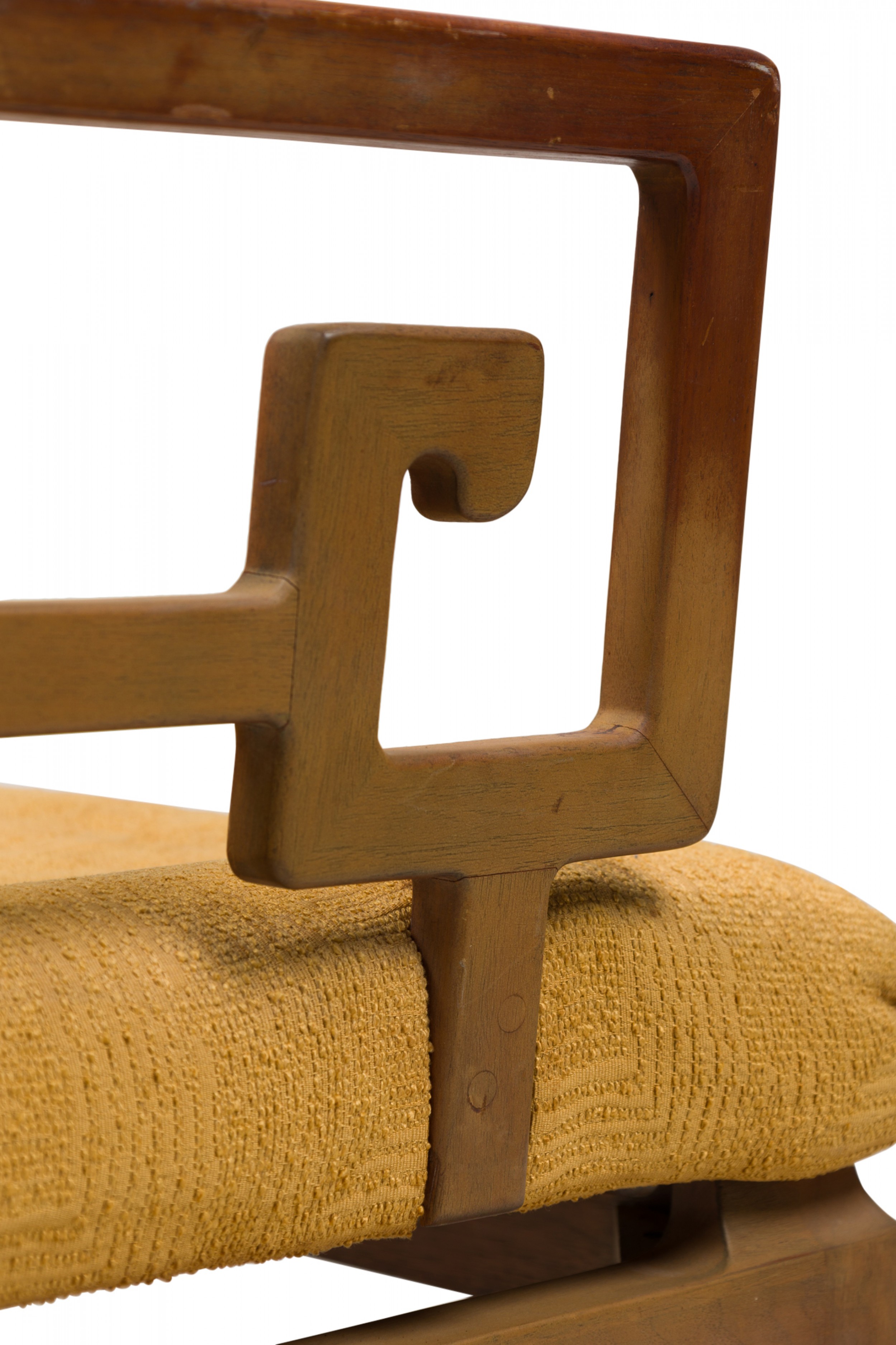 SET of 4 Mid-Century American Modern (1950s) "Far East" mahogany dining chairs (2 armchairs, 2 side chairs) featuring slightly splayed keyfret arms, the back and seat upholstered in a square-patterned textured gold fabric, standing on 4 molded legs. (MICHAEL TAYLOR FOR BAKER FURNITURE) (PRICED AS SET).