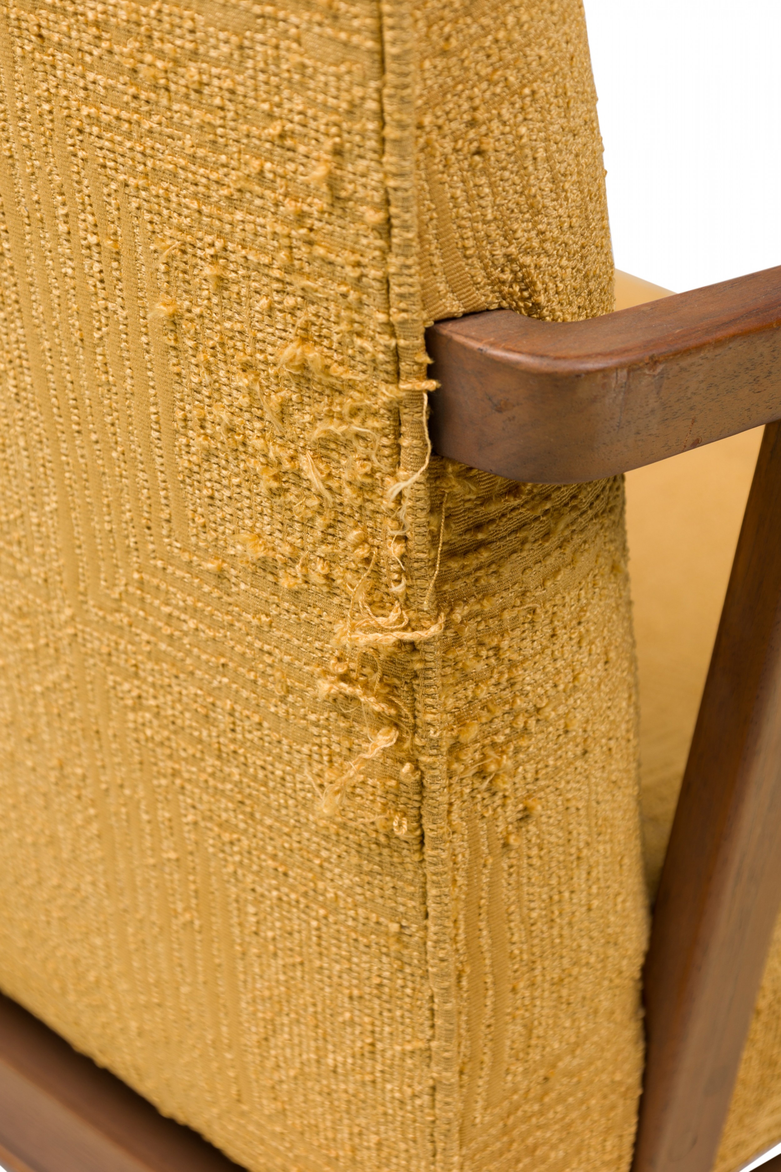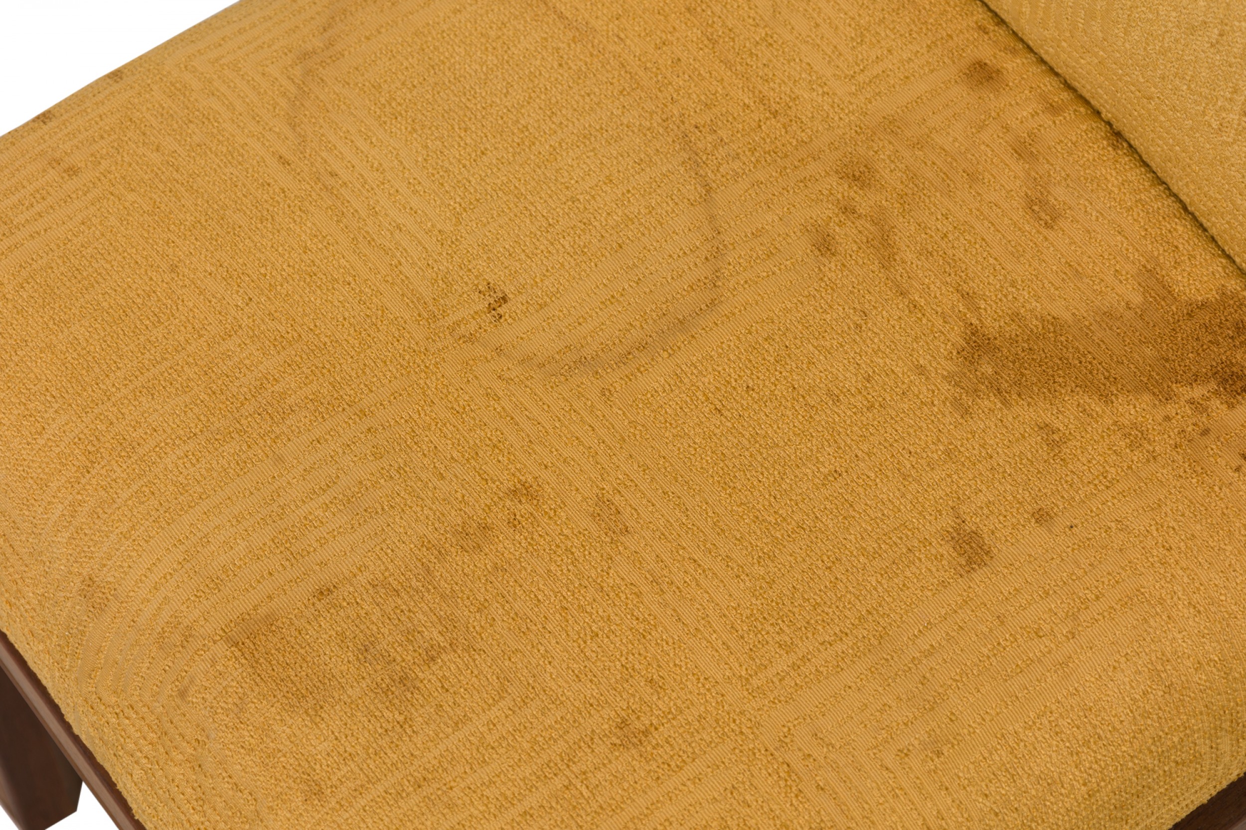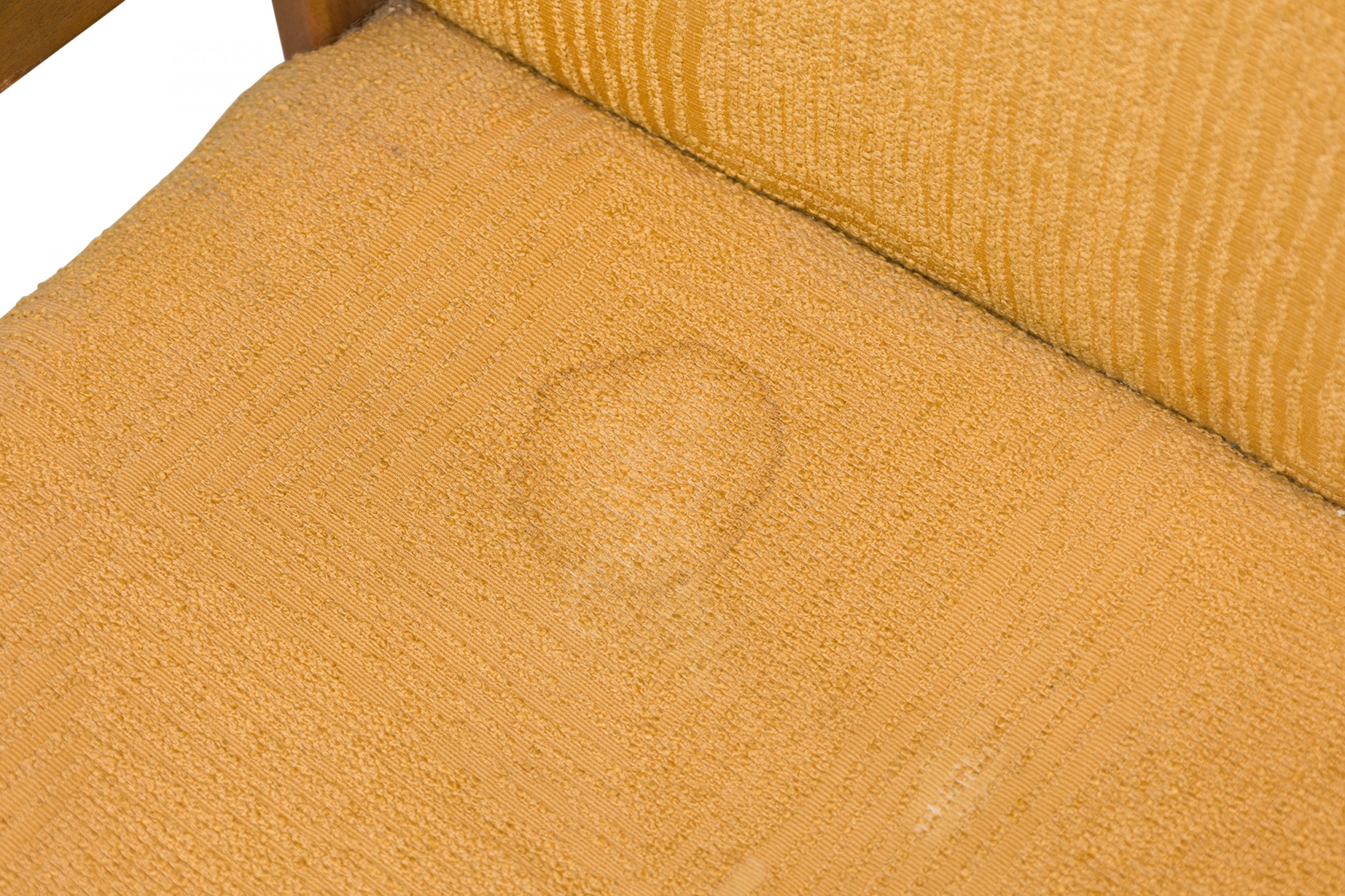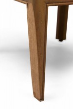 Style: Mid-Century Materials & Techniques: Fabric, mahogany, upholstered, wood Category: Dining Room Condition: One armchair leg comes up short. One side chair leg broken. Wear to finish, wear & stains on upholstery with wear & tear on bottoms. Good; Minor losses
