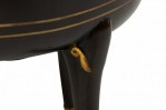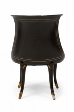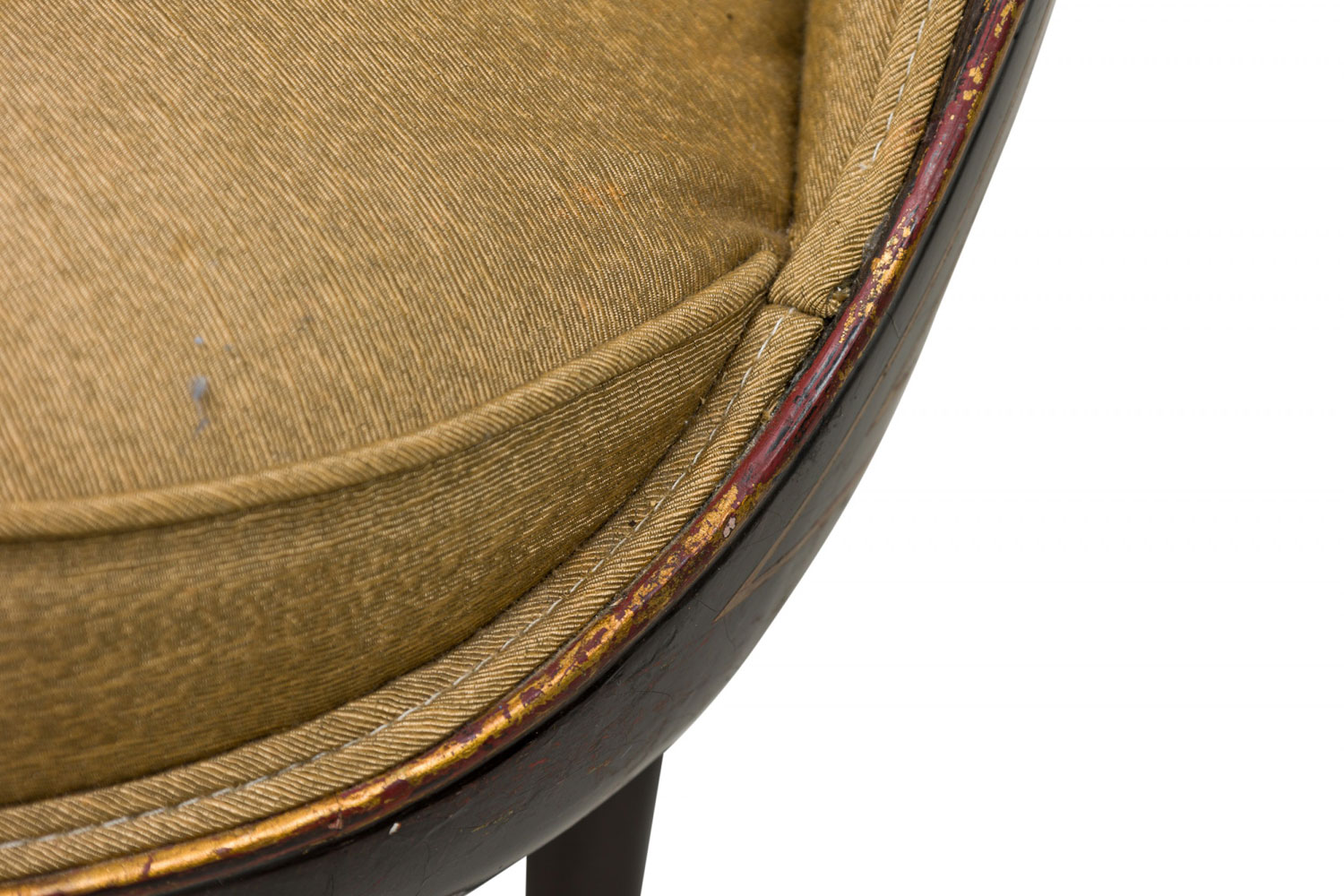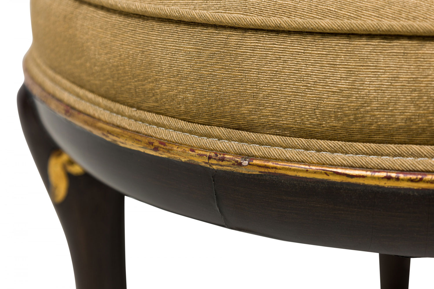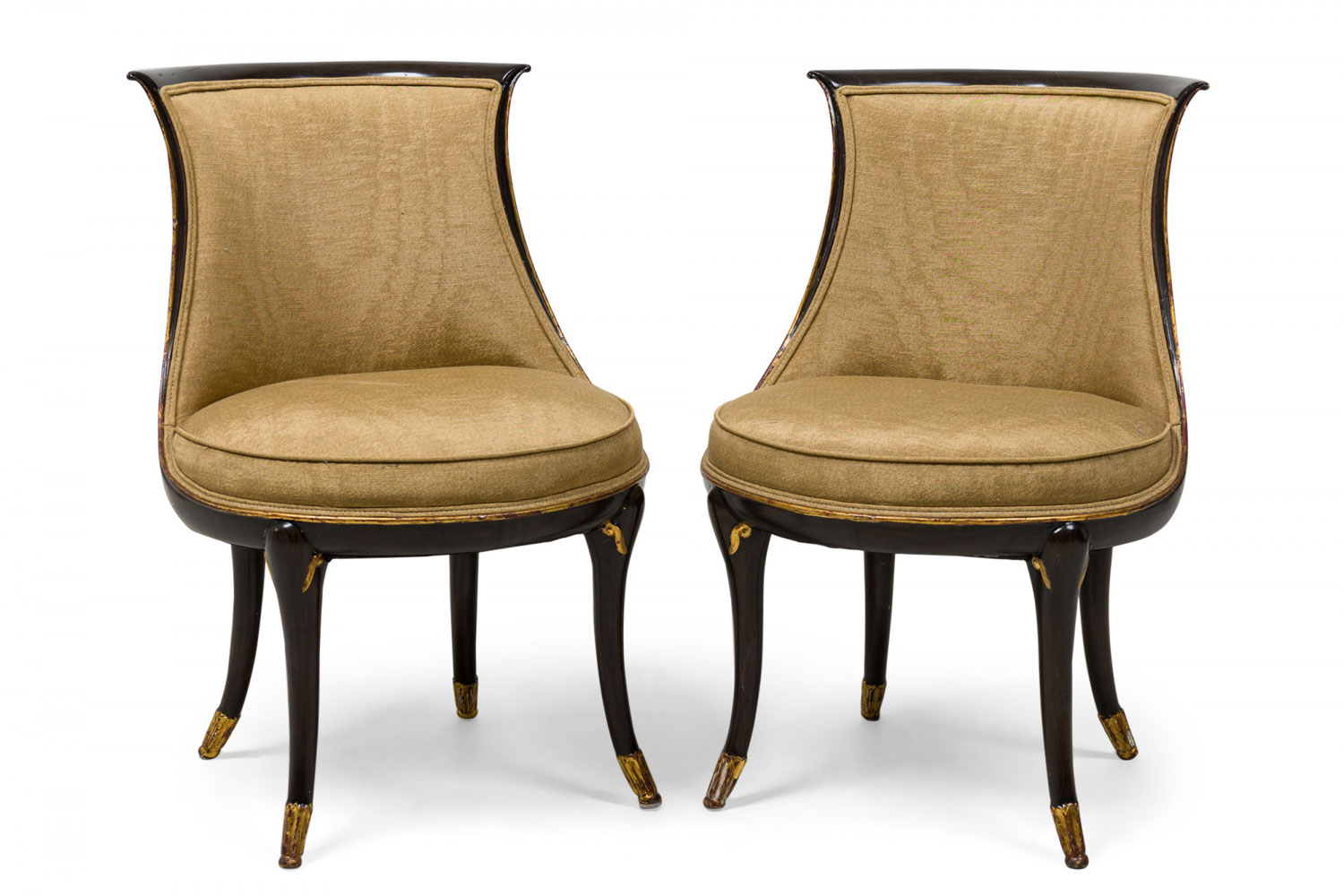 SET of 4 Mid-Century (1950s) American walnut painted and parcel-gilt dining chairs with concave tapered backs inlaid with a parallel brass double border, upholstered in a beige and gold fabric, the splayed legs topped by decorative gilt-highlighted, carved embellishments, ending in gilt fluted and carved feet. (MICHAEL TAYLOR) (PRICED AS SET)