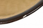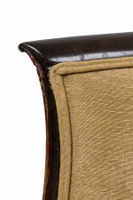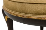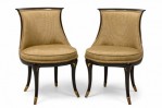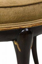Style: Mid-Century Materials & Techniques: Brass, fabric, gilt / giltwood, inlaid, inlay, metal, painted, upholstered, walnut, wood Category: Seating Condition: Wear to finish on wood. One chair has significant paint loss to frame. Good; Minor losses