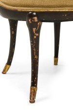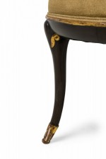 SET of 4 Mid-Century (1950s) American walnut painted and parcel-gilt dining chairs with concave tapered backs inlaid with a parallel brass double border, upholstered in a beige and gold fabric, the splayed legs topped by decorative gilt-highlighted, carved embellishments, ending in gilt fluted and carved feet. (MICHAEL TAYLOR) (PRICED AS SET).