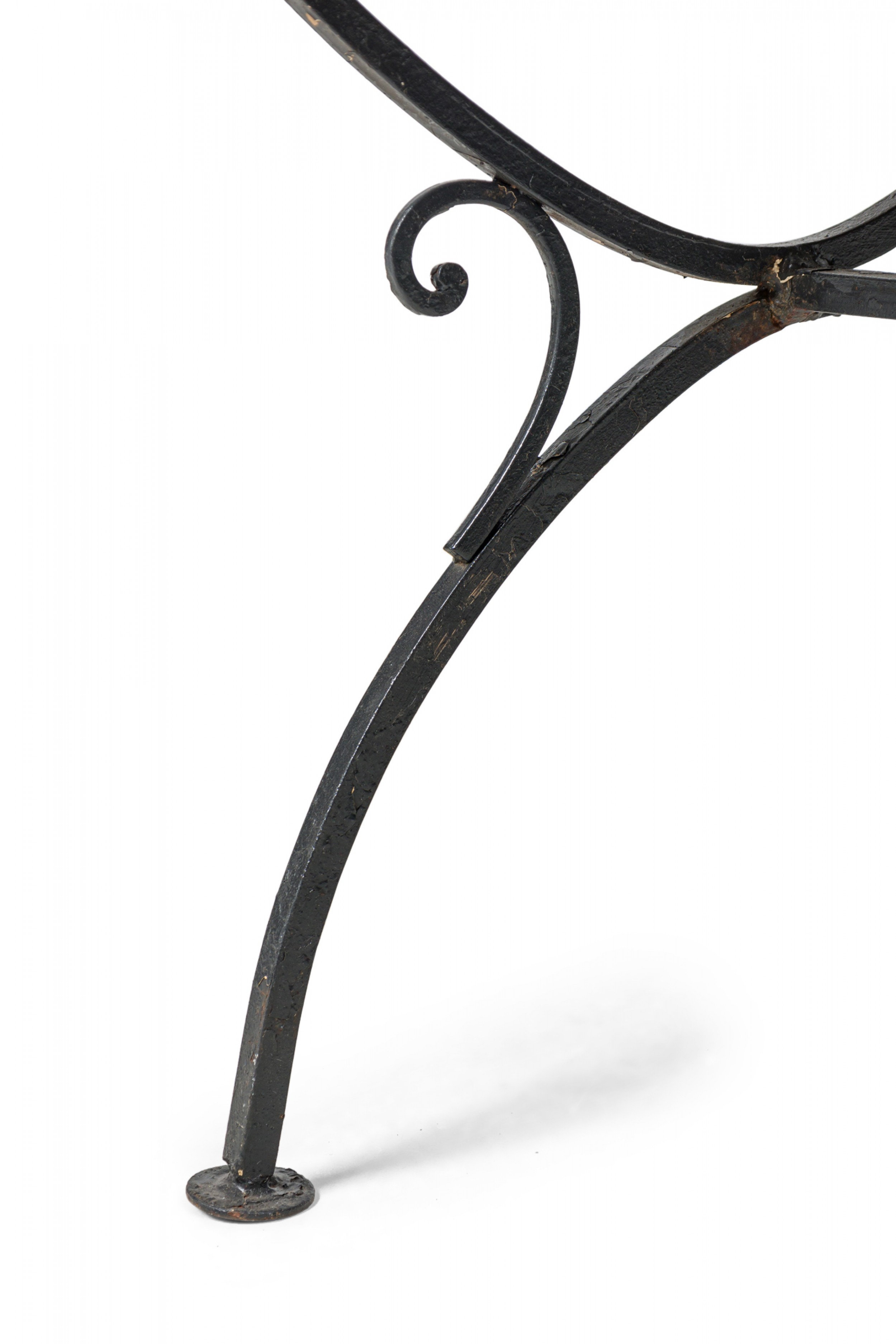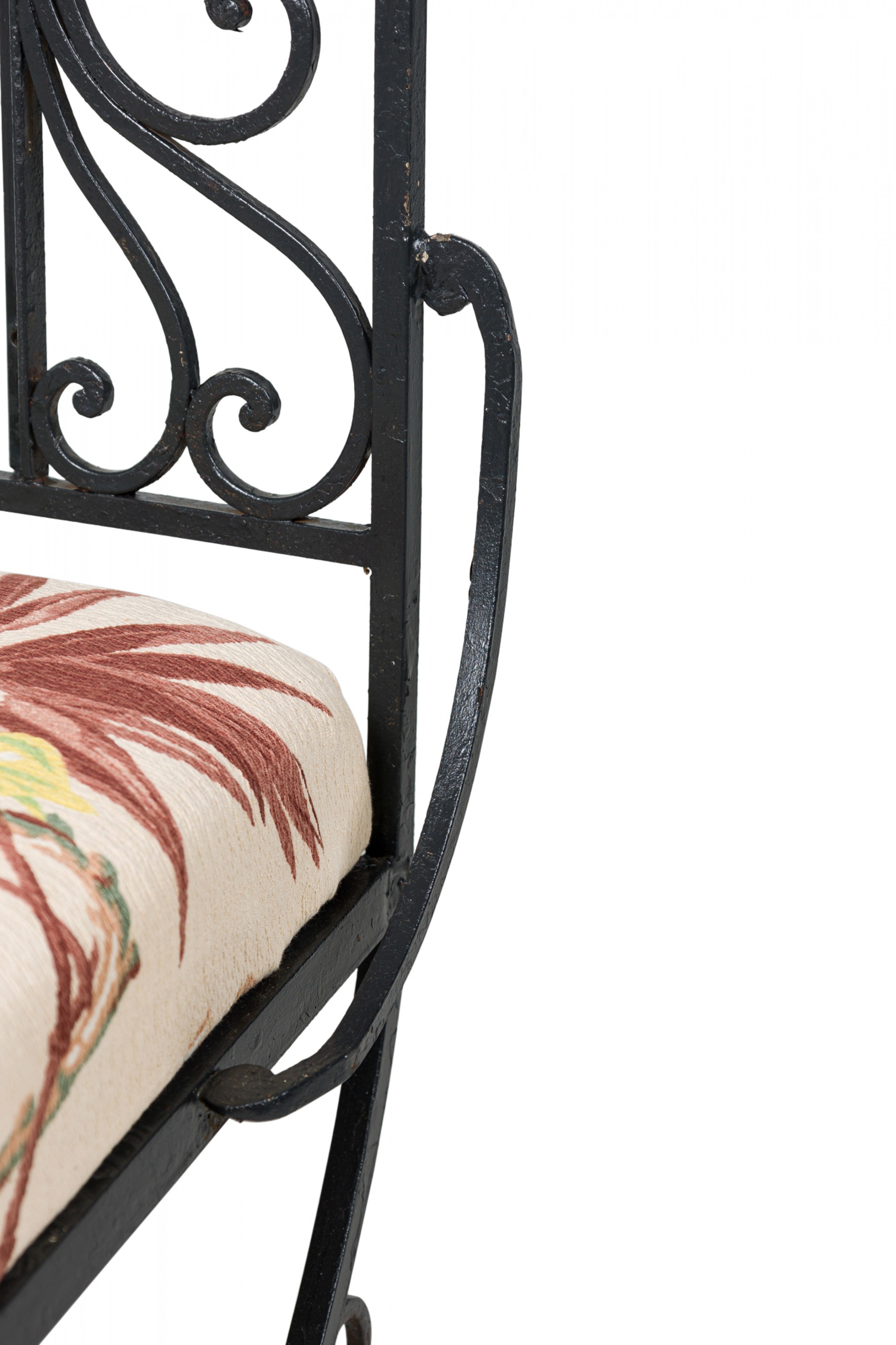 SET of 4 American Mid-Century side chairs with scroll design black wrought iron frames with beige, green, brown, and red floral upholstered fabric removable slip seats. (PRICED AS SET)