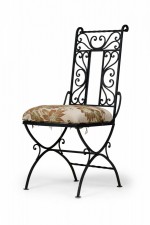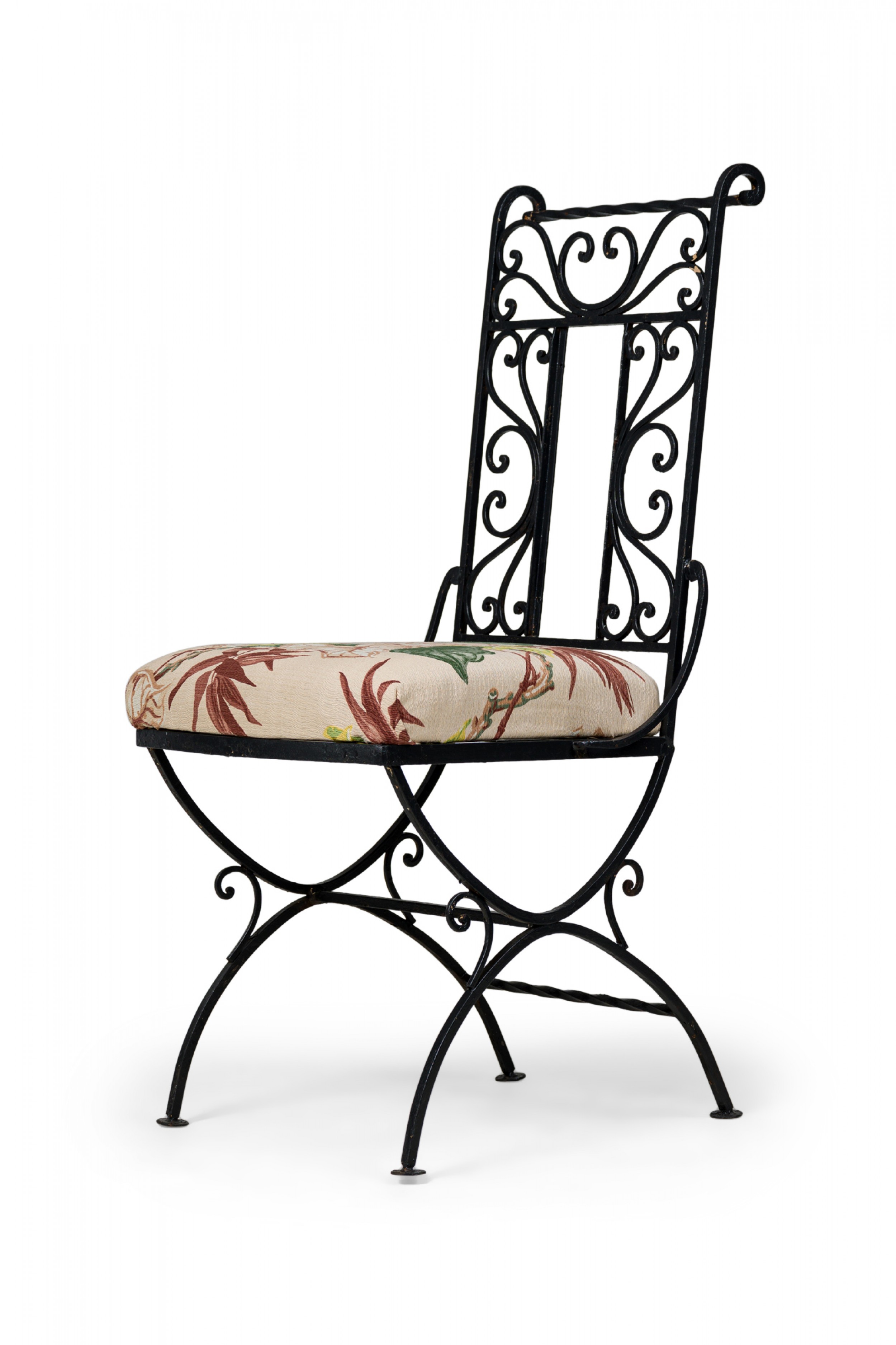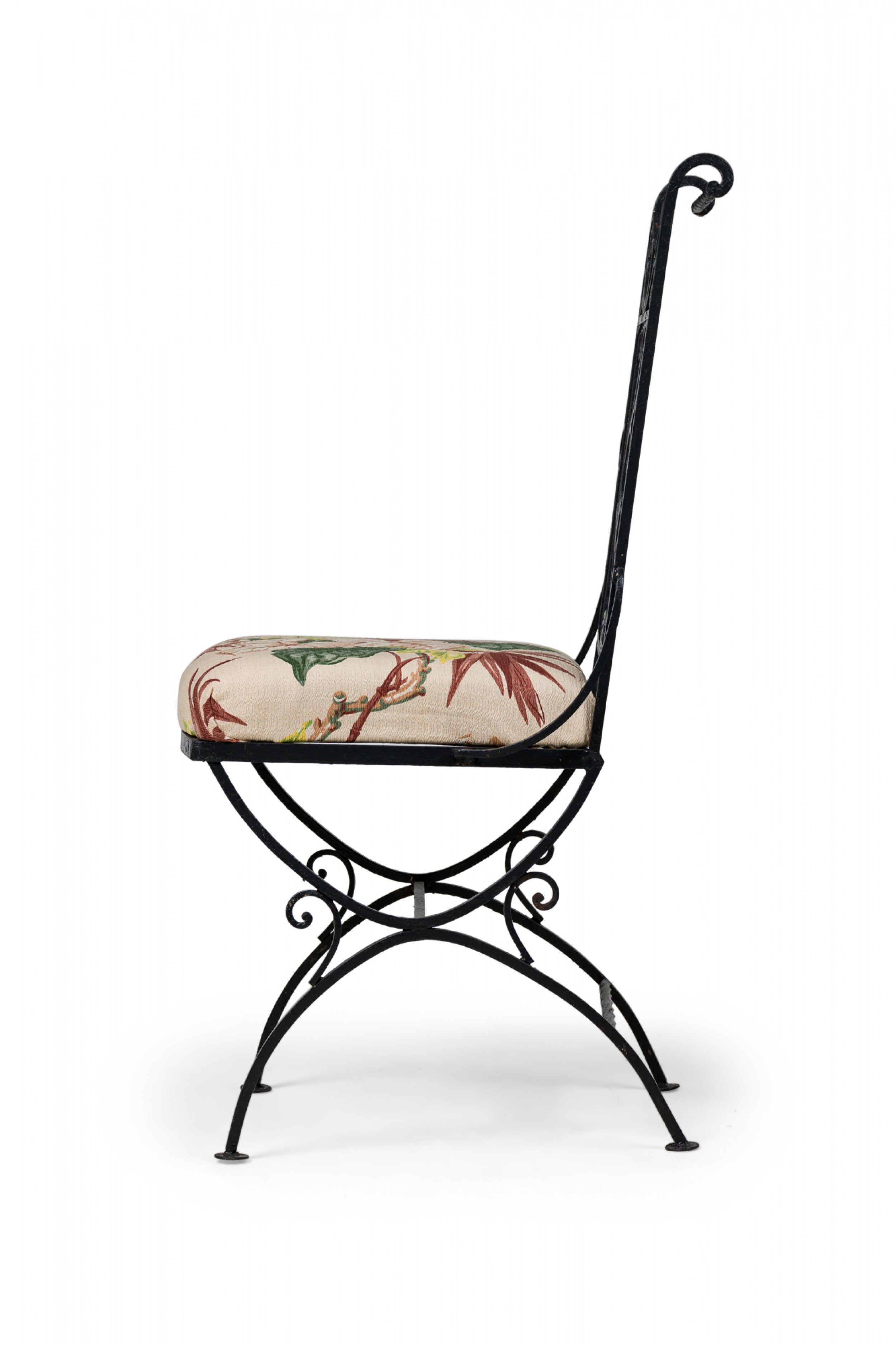 SET of 4 American Mid-Century side chairs with scroll design black wrought iron frames with beige, green, brown, and red floral upholstered fabric removable slip seats. (PRICED AS SET).