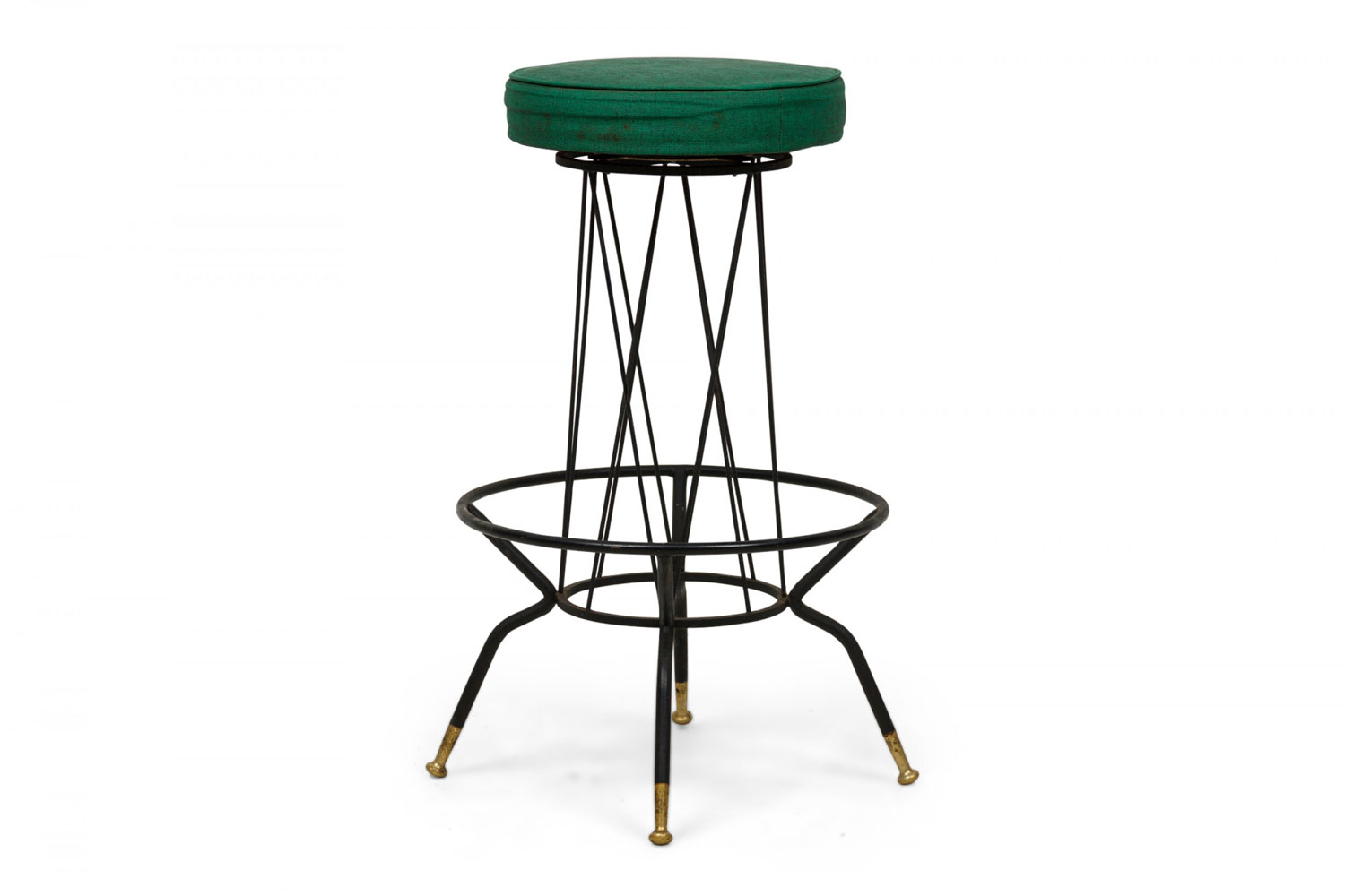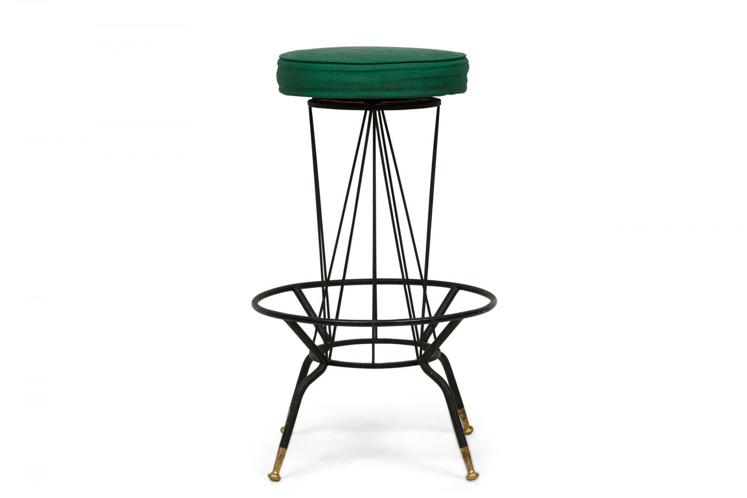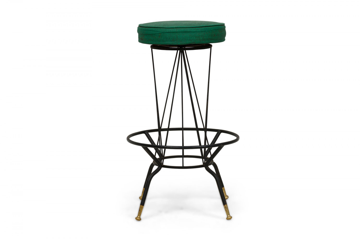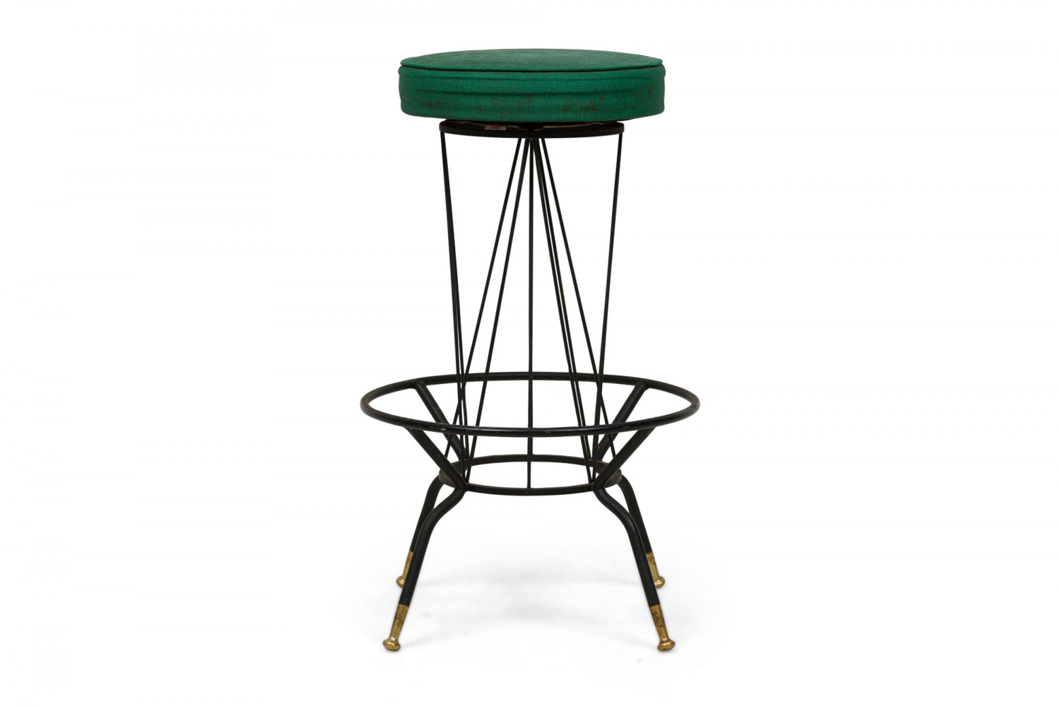 SET of 4 Mid-Century American black metal swivel bar stools with green upholstered circular seats, supported by conical, wire frames with upturned foot rings and slightly incurved splayed legs capped by brass feet. (TROY SUNSHADE) (PRICED AS SET)