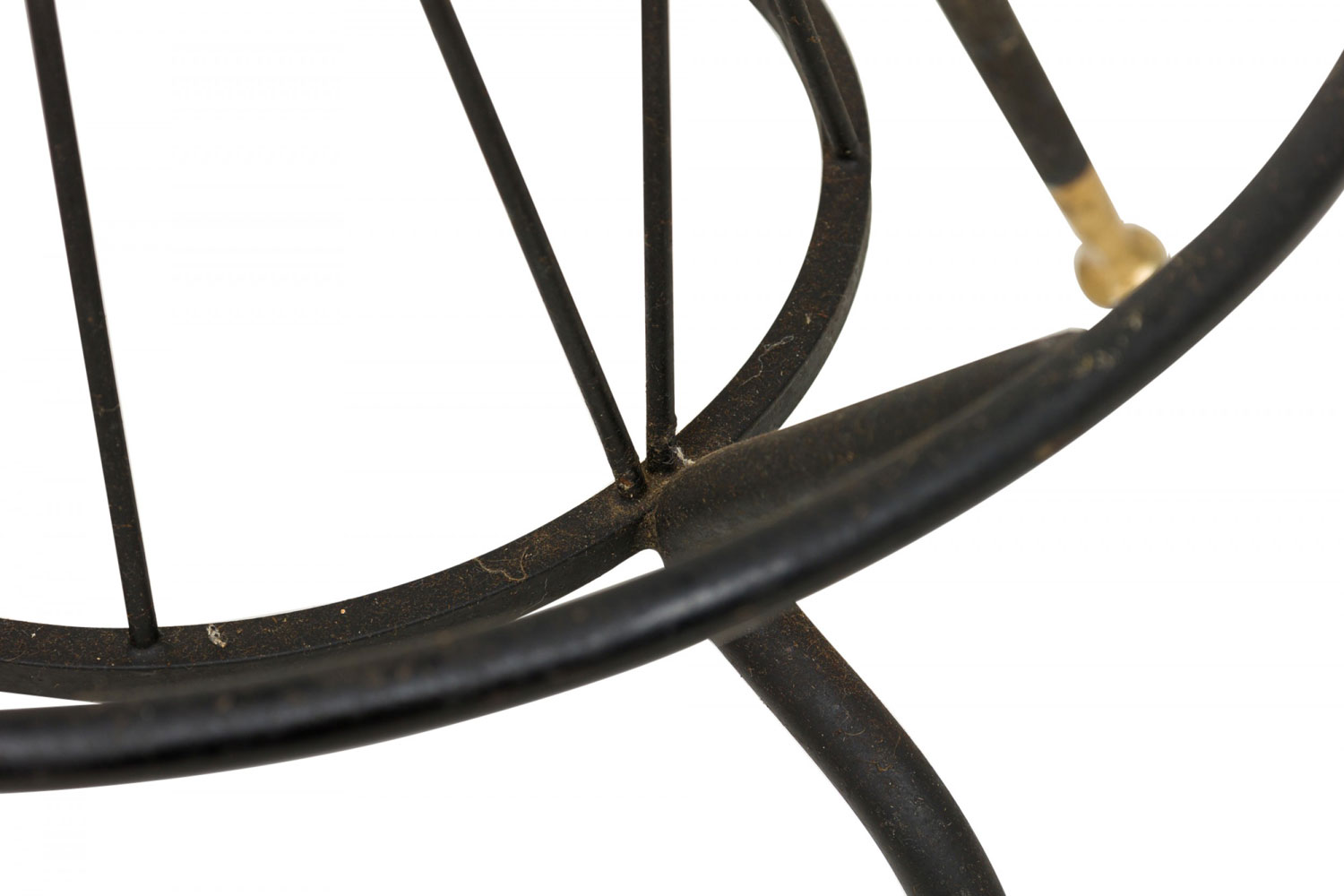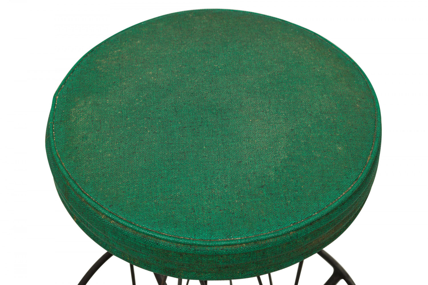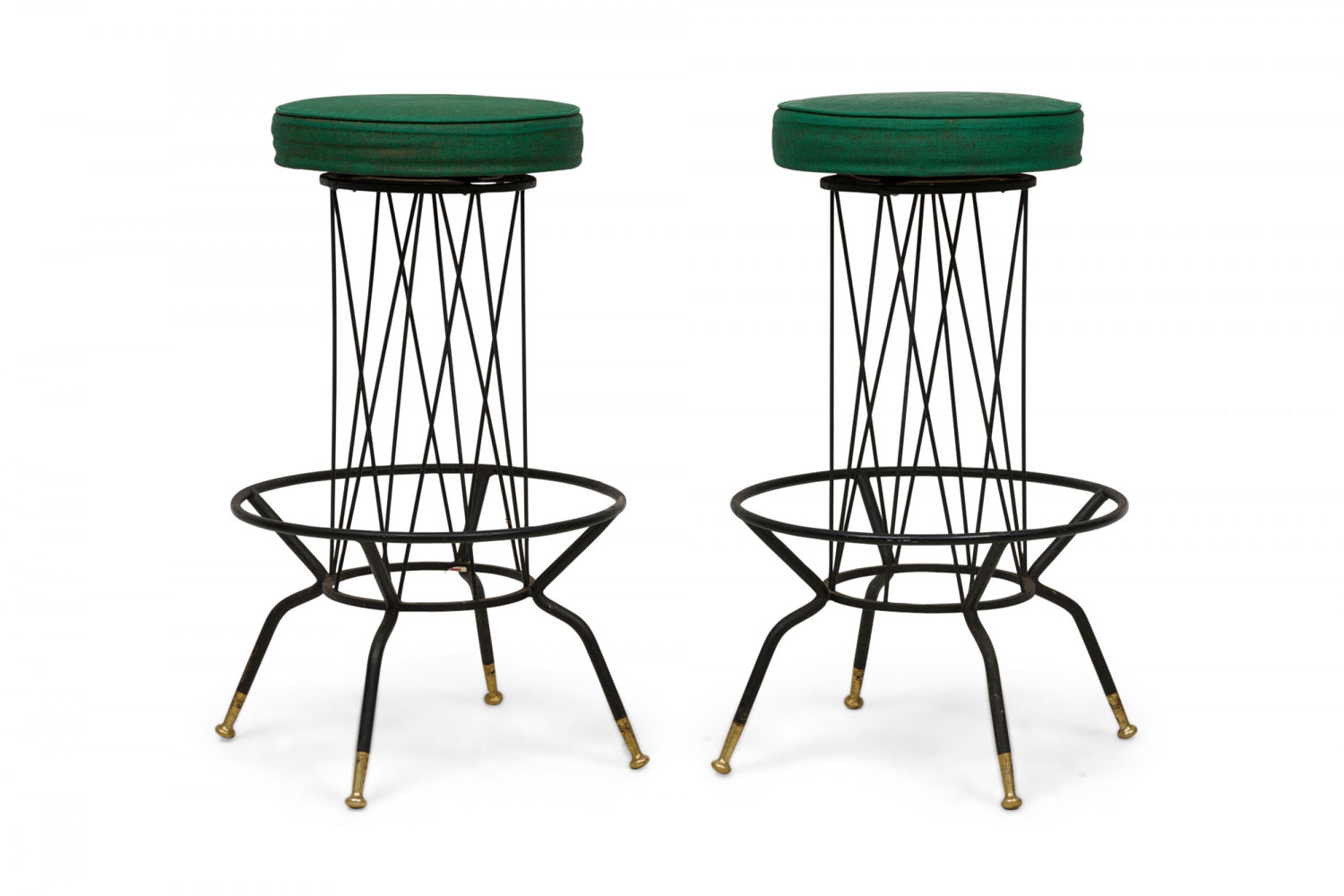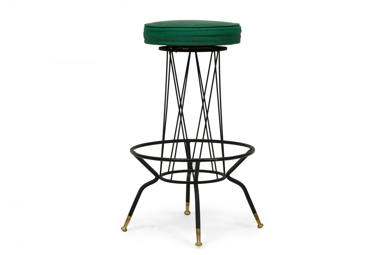 SET of 4 Mid-Century American black metal swivel bar stools with green upholstered circular seats, supported by conical, wire frames with upturned foot rings and slightly incurved splayed legs capped by brass feet. (TROY SUNSHADE) (PRICED AS SET)