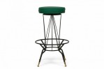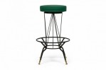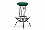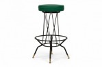 SET of 4 Mid-Century American black metal swivel bar stools with green upholstered circular seats, supported by conical, wire frames with upturned foot rings and slightly incurved splayed legs capped by brass feet. (TROY SUNSHADE) (PRICED AS SET).