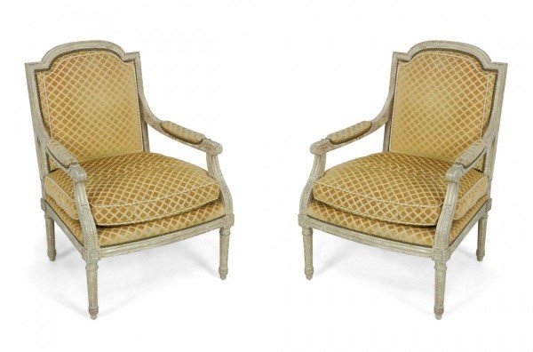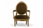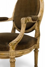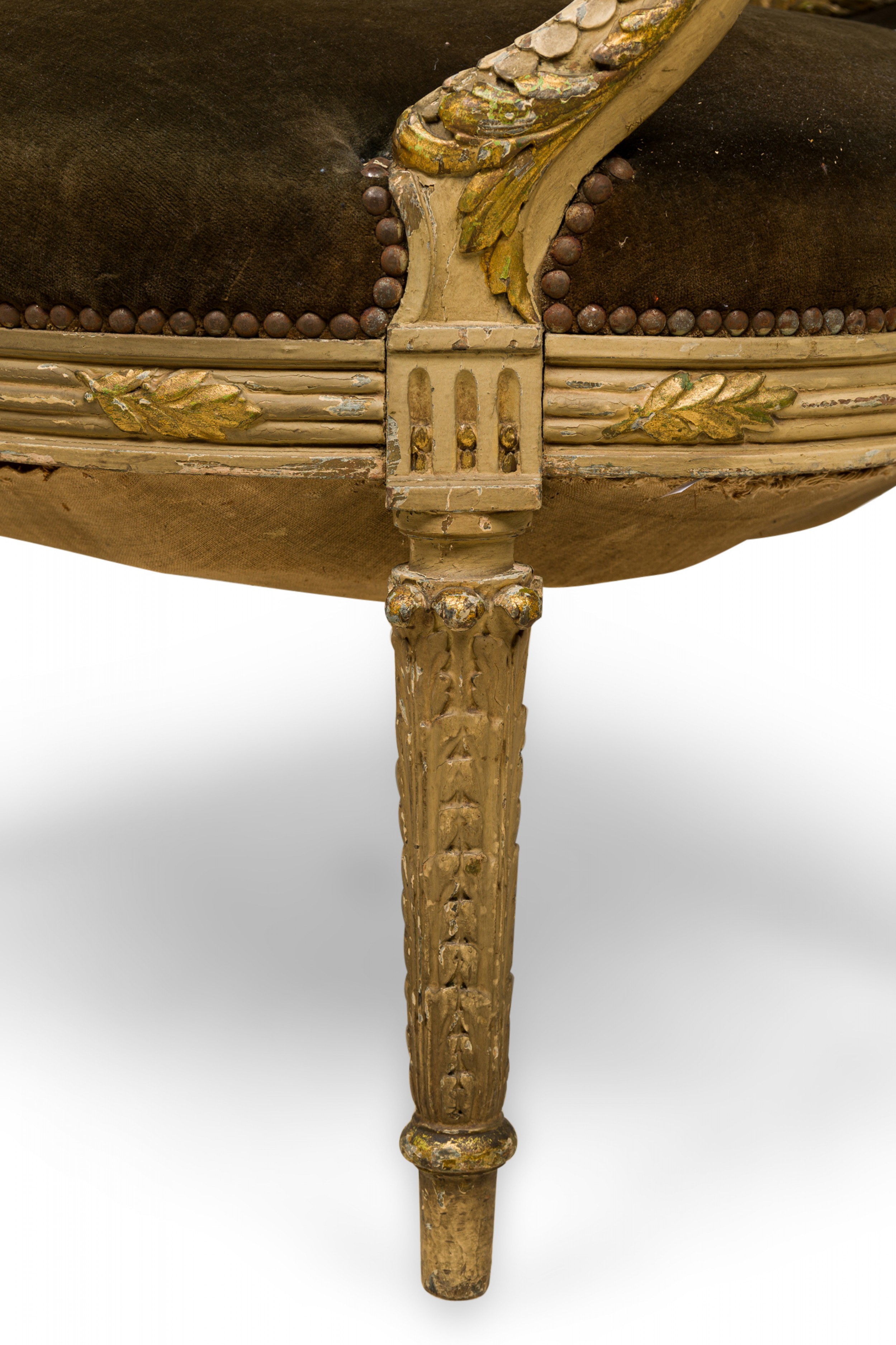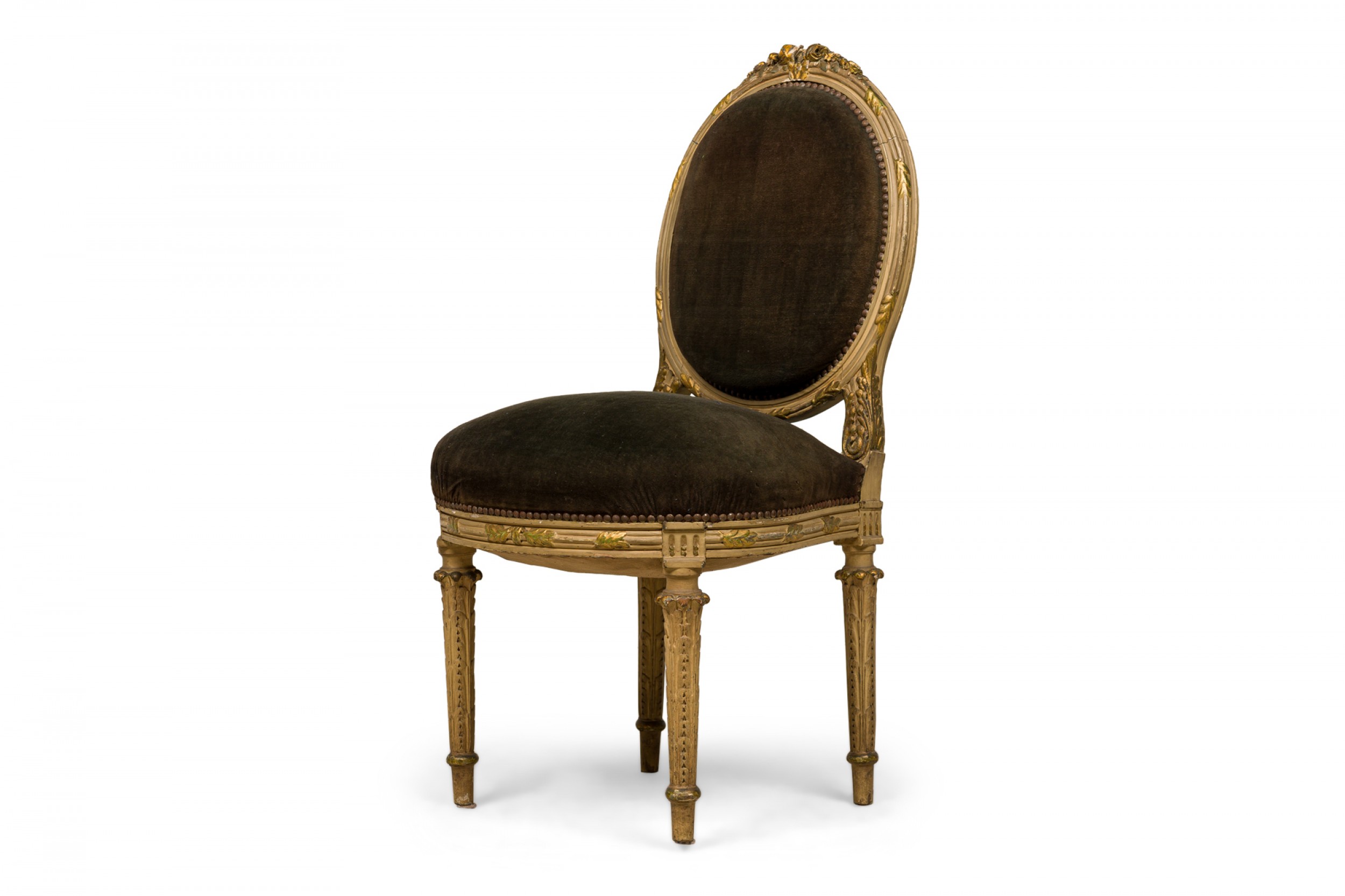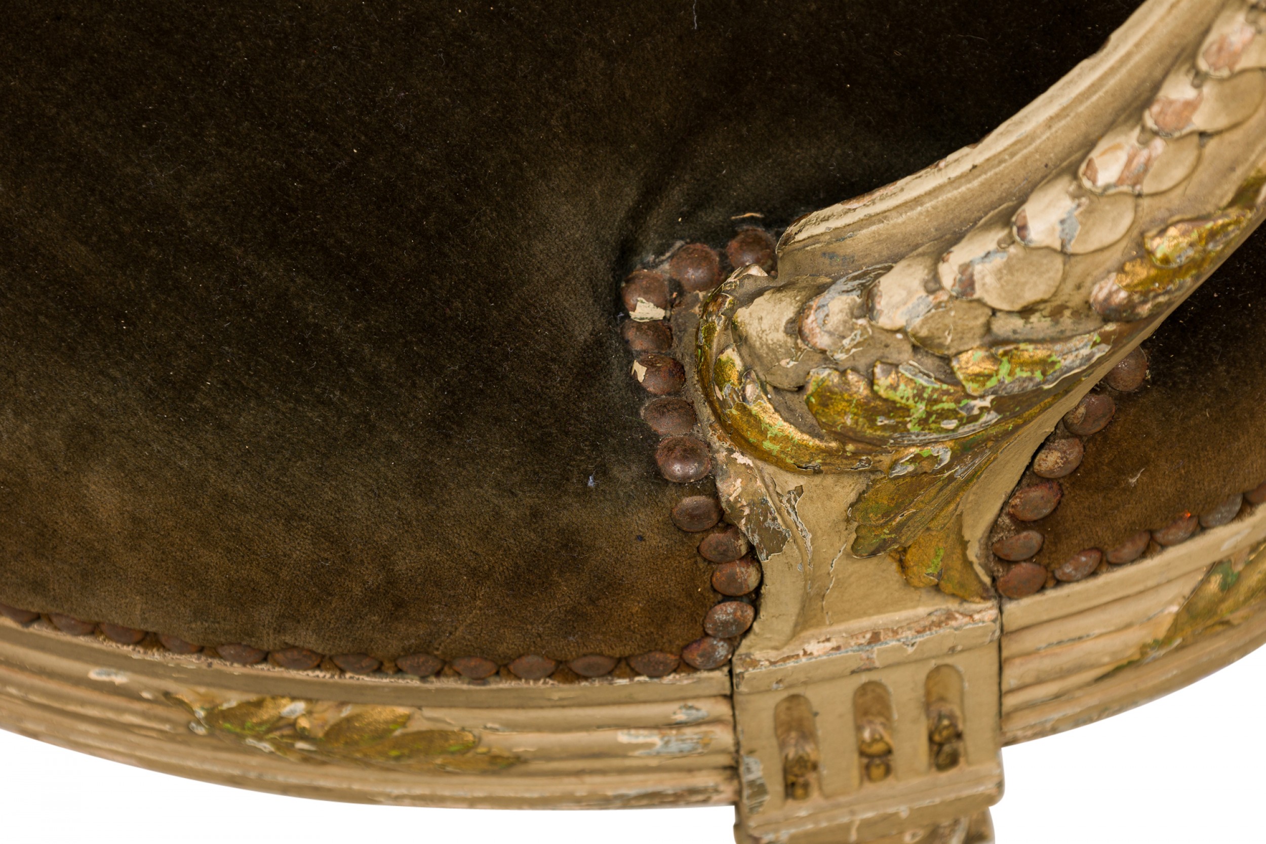 SET of 5 French Louis XVI-style (19/20th Century) dining /salon set of chair comprised of 1 armchair and 4 sides having green velvet upholstered oval backs, nailhead trim, and frames with distressed grey painted finish and gilt trim with carved leafed pattern topped by rose crests, standing on tapered legs. (PRICED AS SET)(Available individually, armchair: 063613A, side chairs: 063613B)