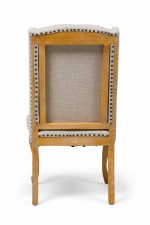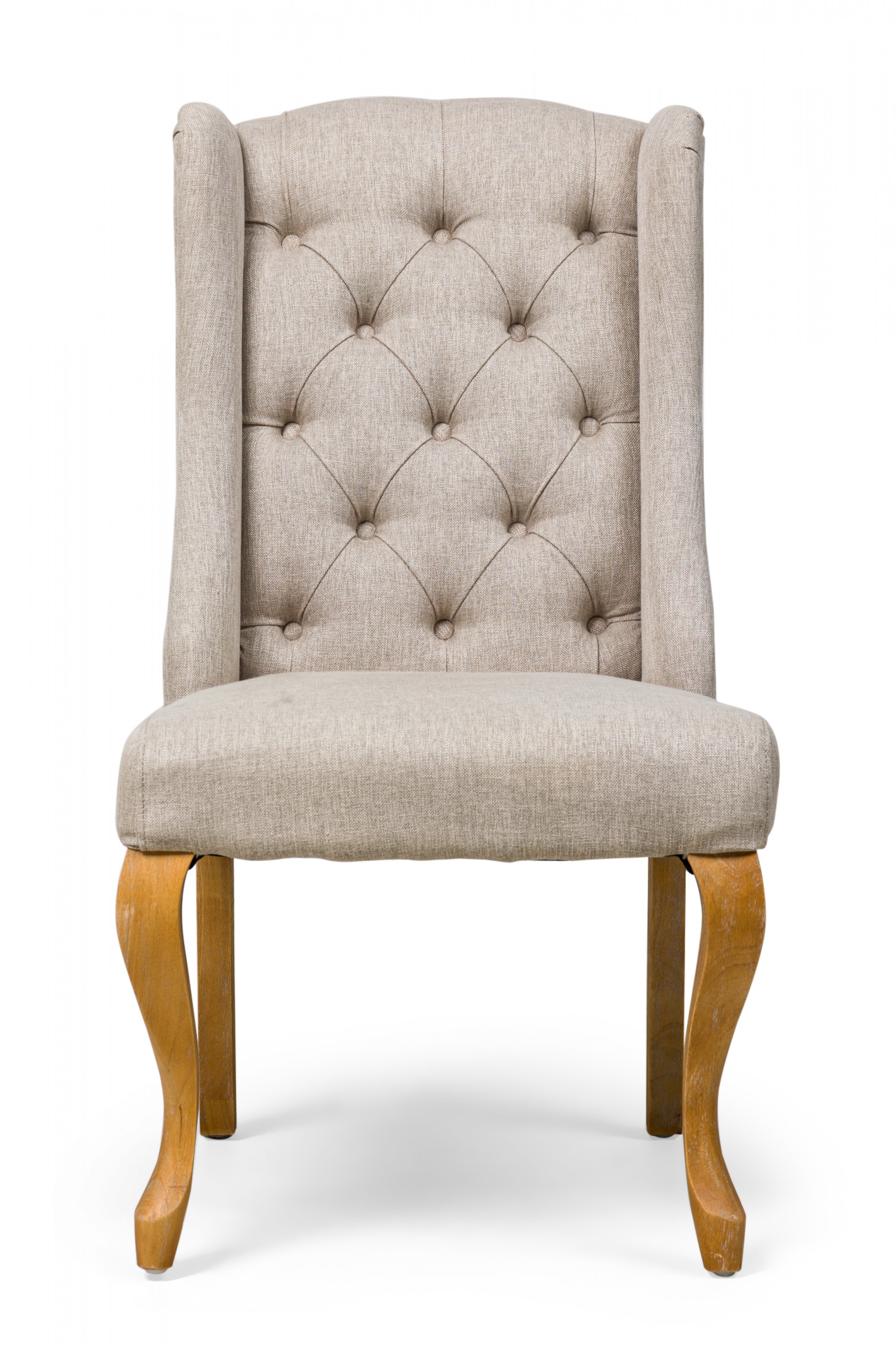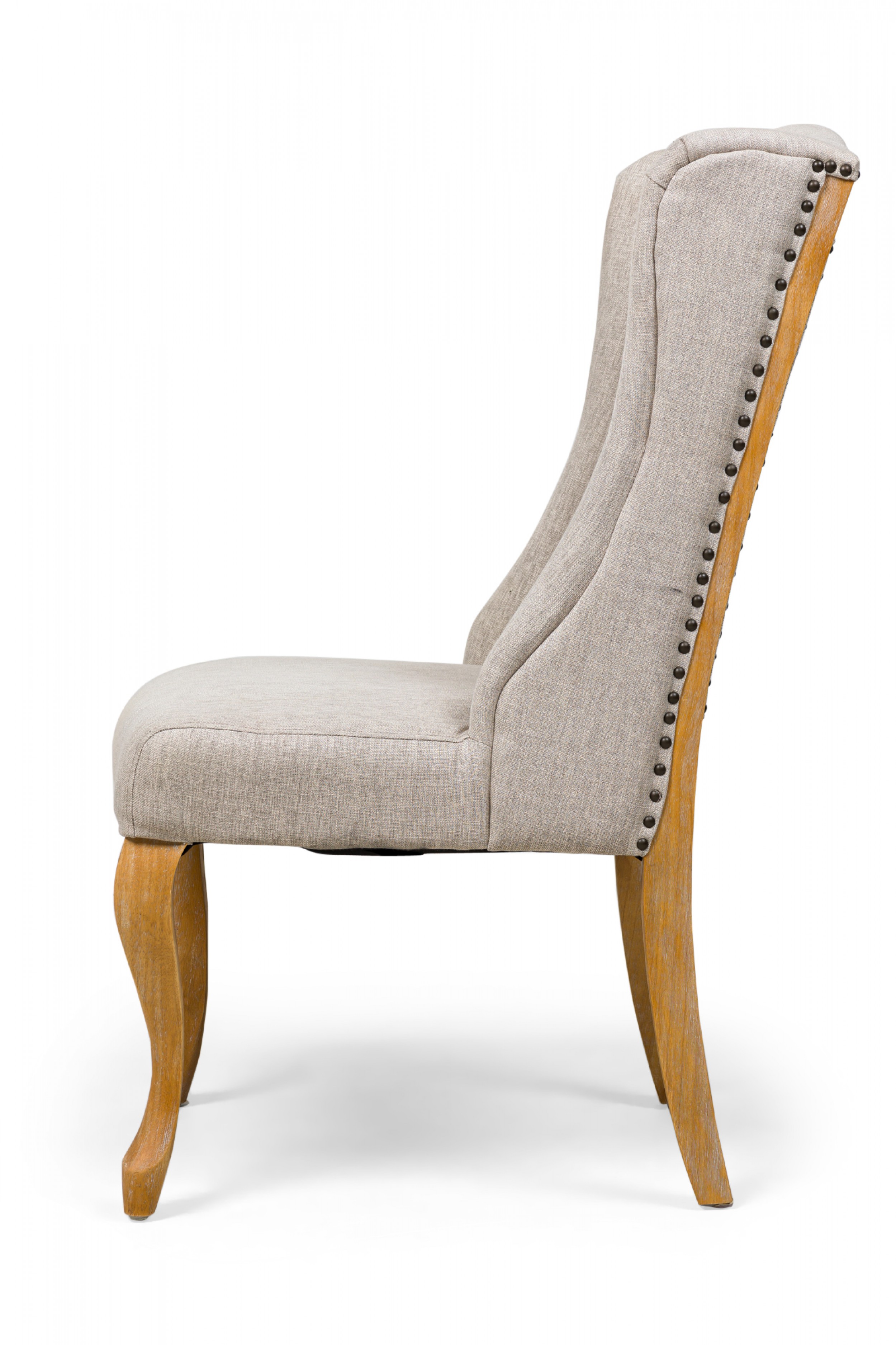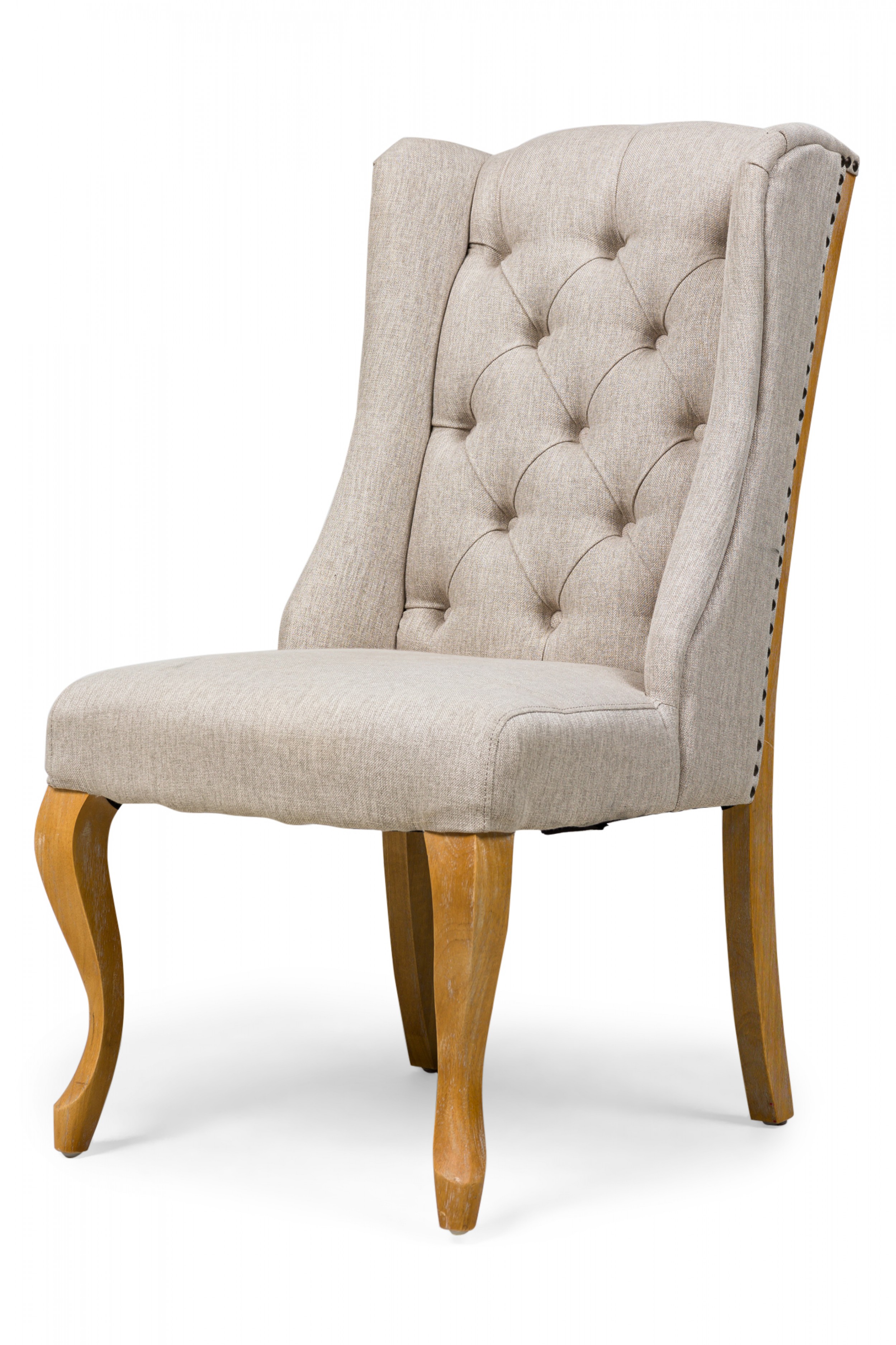 5 Contemporary American dining side chairs with wing-style sloped backs, button tufted light gray woven upholstery, gun metal gray nailhead trim, standing on 2 blond wood cabriole front legs and splayed back legs. (PRICED EACH)
