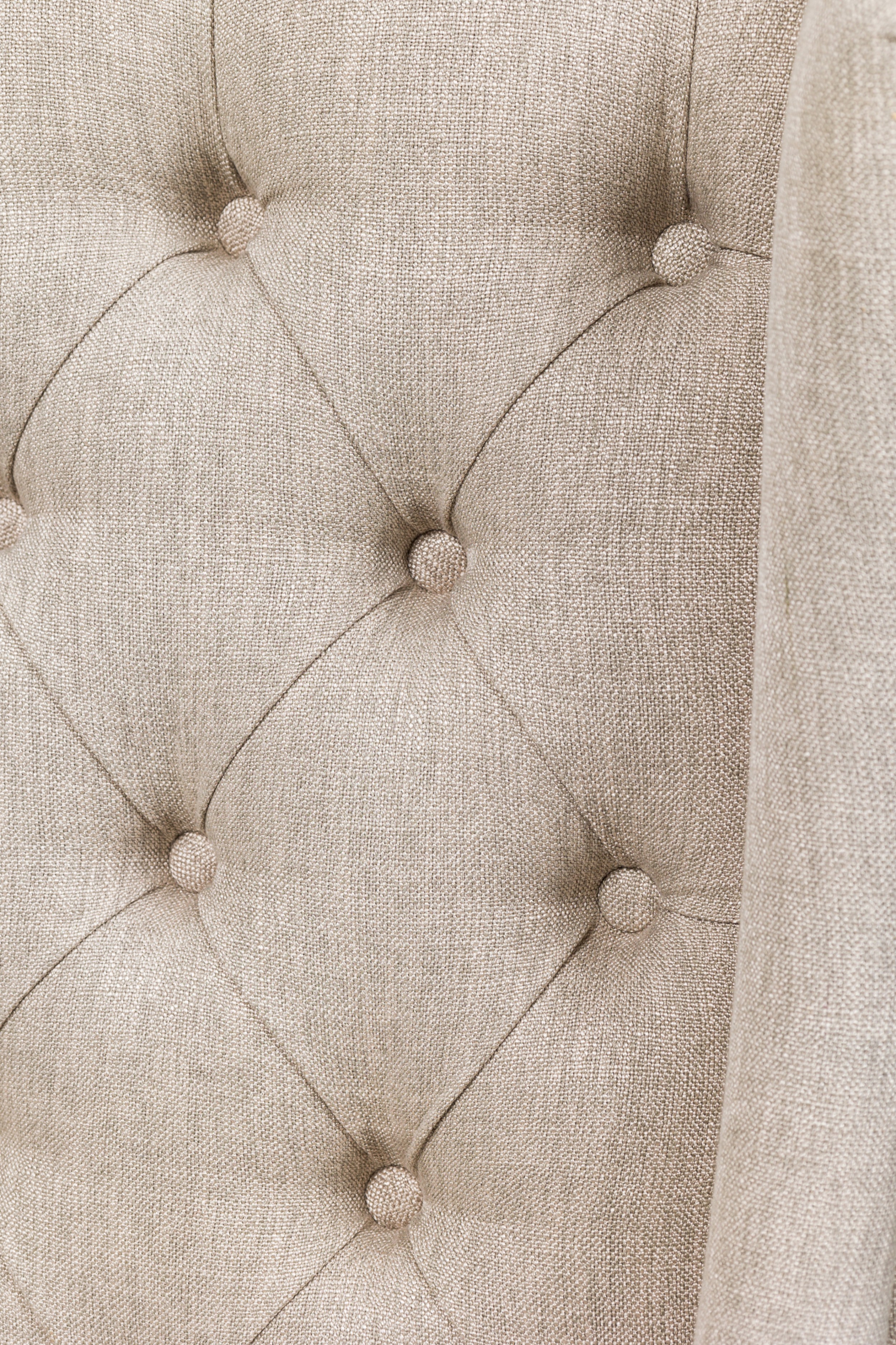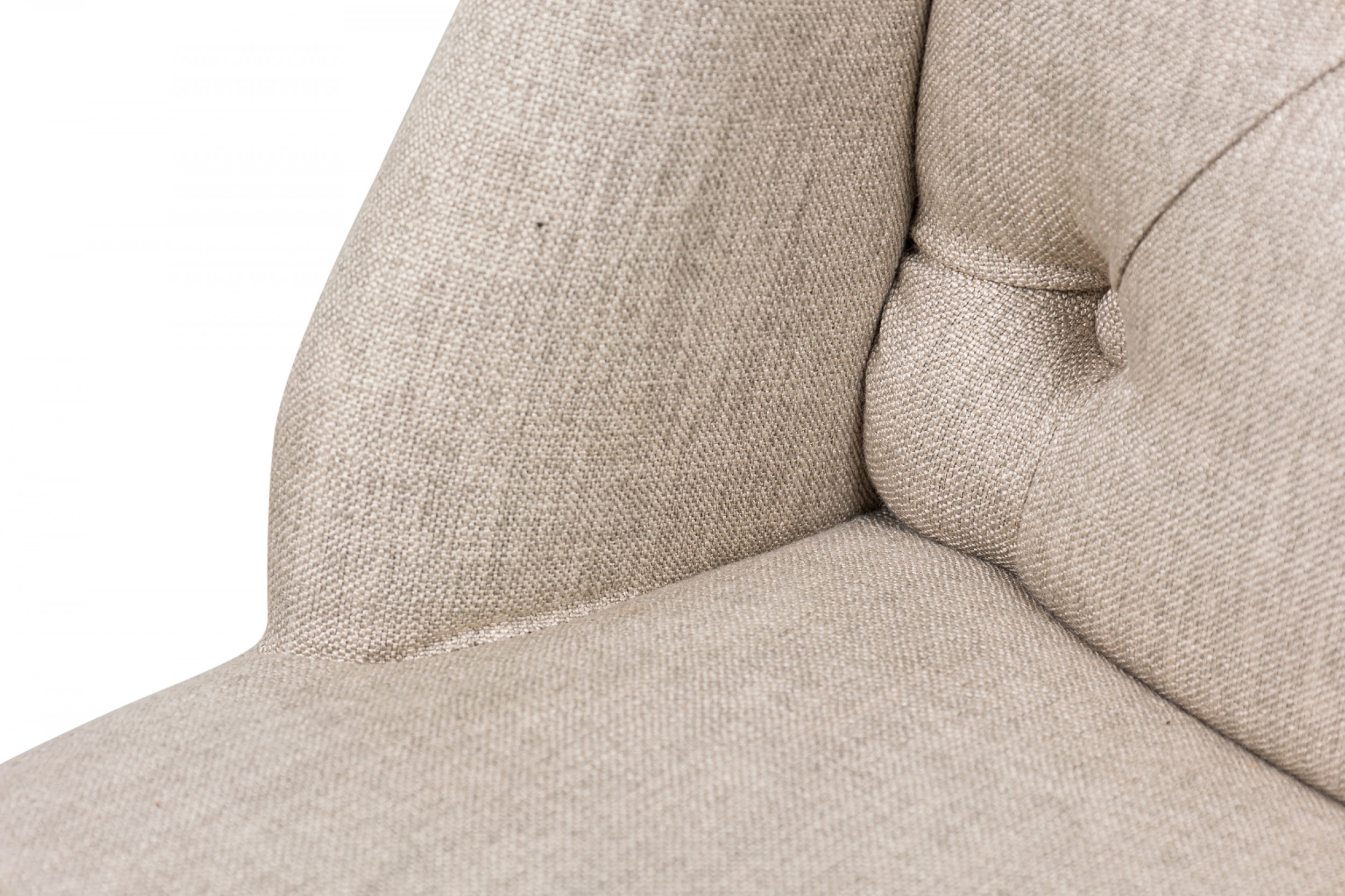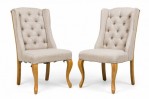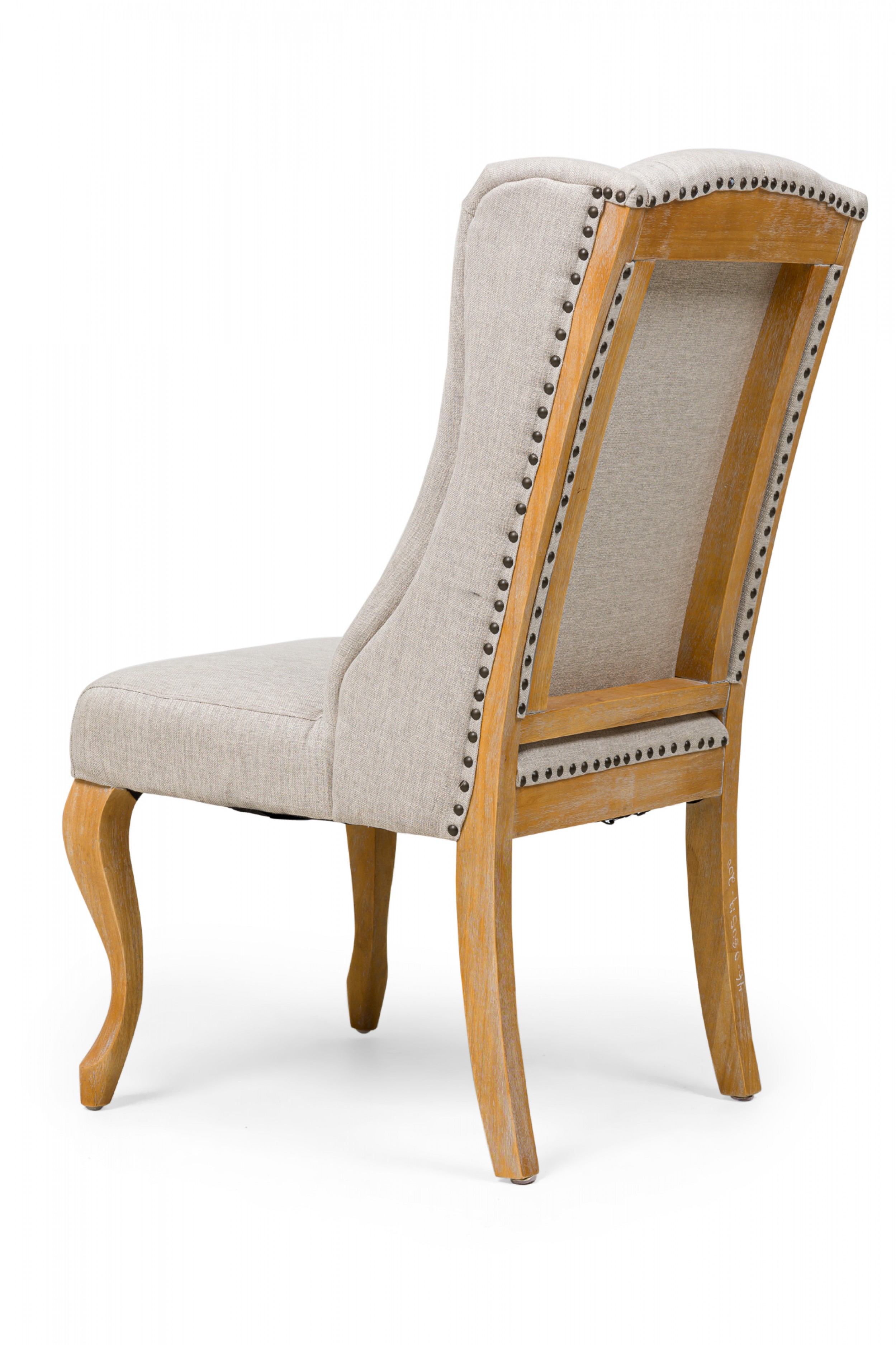 5 Contemporary American dining side chairs with wing-style sloped backs, button tufted light gray woven upholstery, gun metal gray nailhead trim, standing on 2 blond wood cabriole front legs and splayed back legs. (PRICED EACH)
