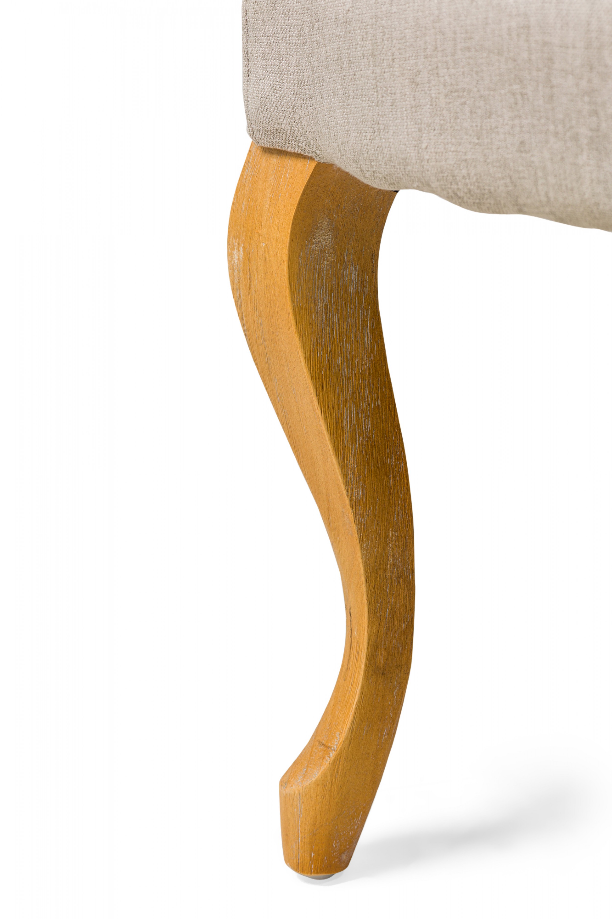 5 Contemporary American dining side chairs with wing-style sloped backs, button tufted light gray woven upholstery, gun metal gray nailhead trim, standing on 2 blond wood cabriole front legs and splayed back legs. (PRICED EACH).