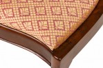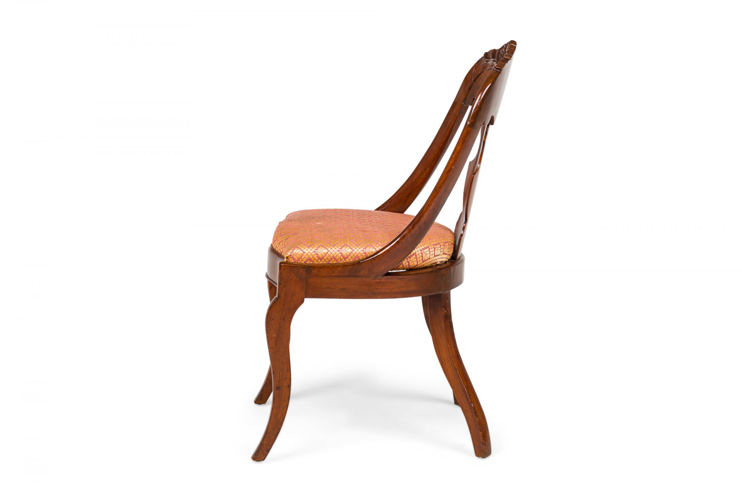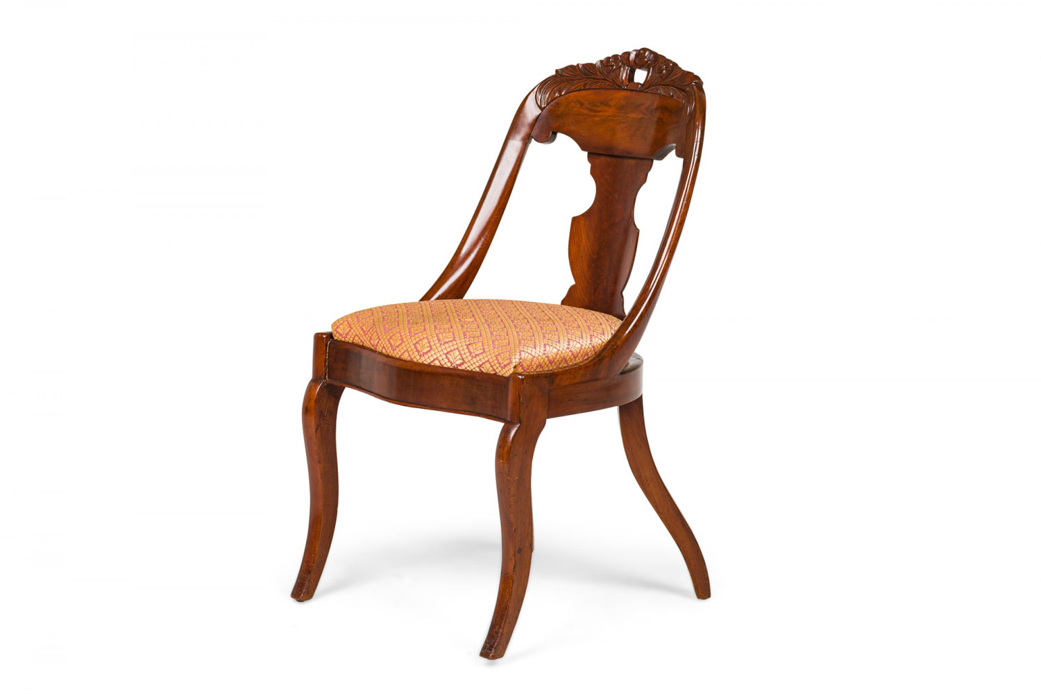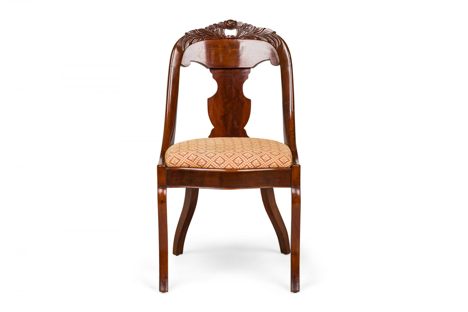 Set of 6 American Empire wood dining chairs in mahogany veneer with sloped gondola backs with an openwork, urn-form center topped by a carved foliate neoclassical crown, upholstered in a stylized red and gold acanthus leaf weave and resting on curved shaped legs. (PRICED AS SET).