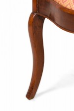 Style: American Materials & Techniques: Carved, fabric, upholstered, wood Category: Seating Good; Wear consistent with age and use