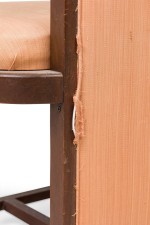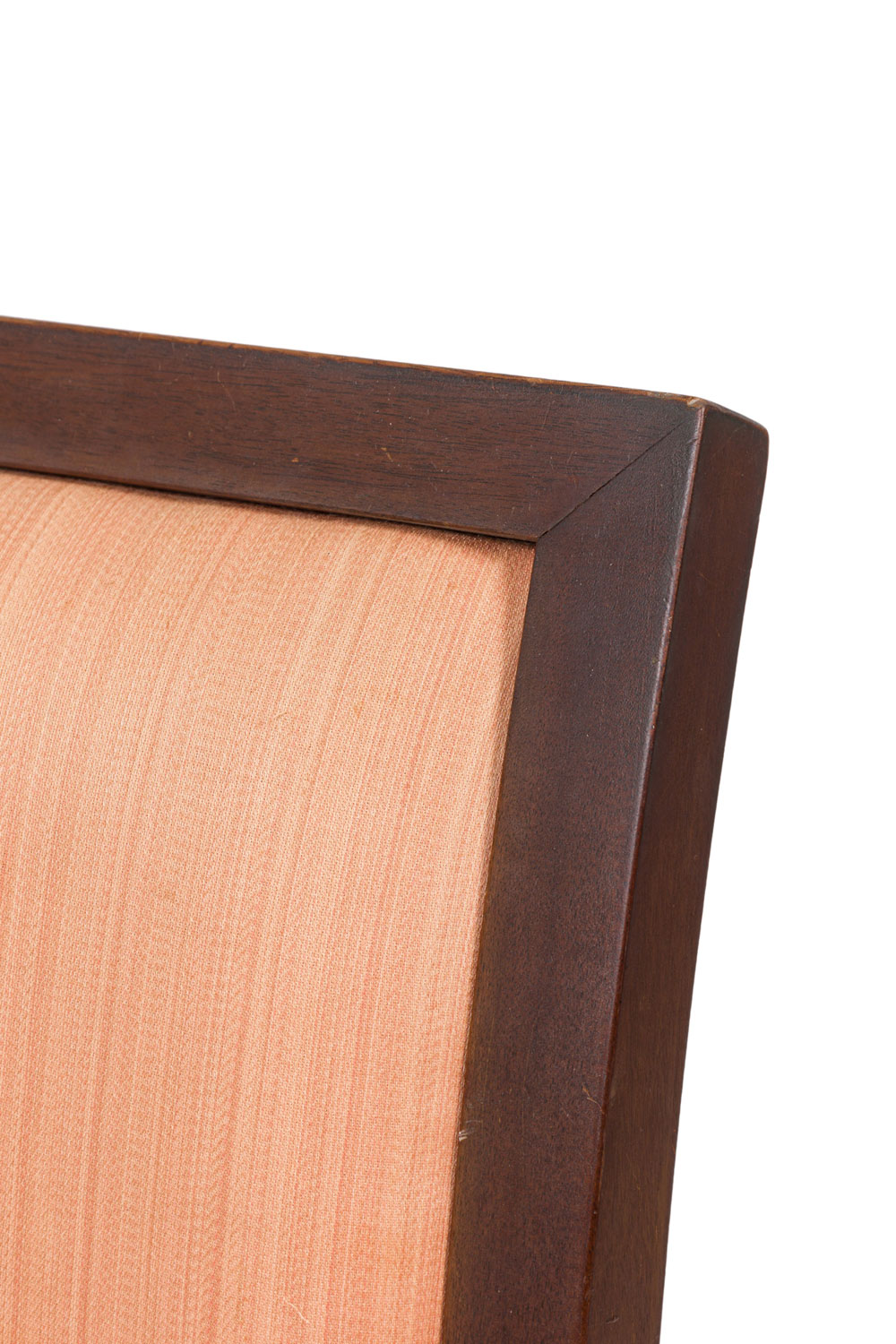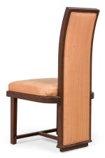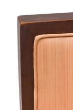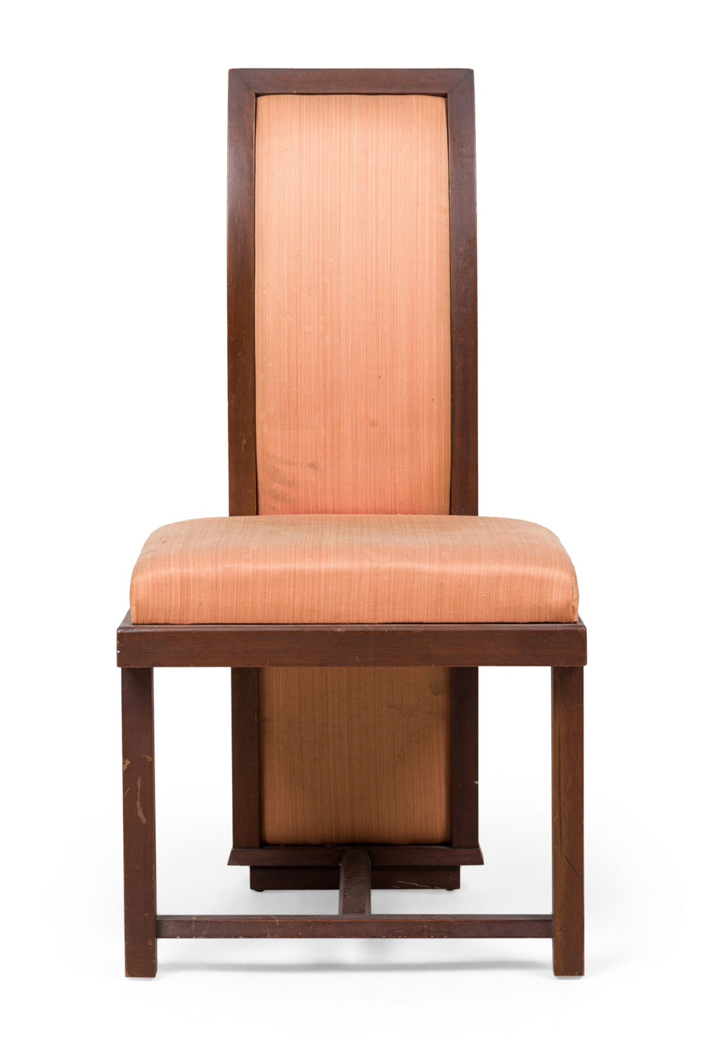 SET of 6 American Mid-Century mahogany high back dining side chairs with champagne colored upholstered seat and back and front "H" stretcher (Taliesin Collection-FRANK LLOYD WRIGHT) (PRICED AS SET) (NOTE: 6 identical in Florida showroom).