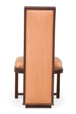 SET of 6 American Mid-Century mahogany high back dining chairs (2 armchairs, 4 side chairs) with champagne colored upholstered seat and back and front "H" stretcher (Taliesin Collection-Frank Lloyd Wright) (NOTE: 6 identical in Long Island City warehouse) (PRICED AS SET).