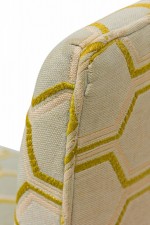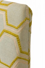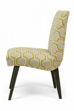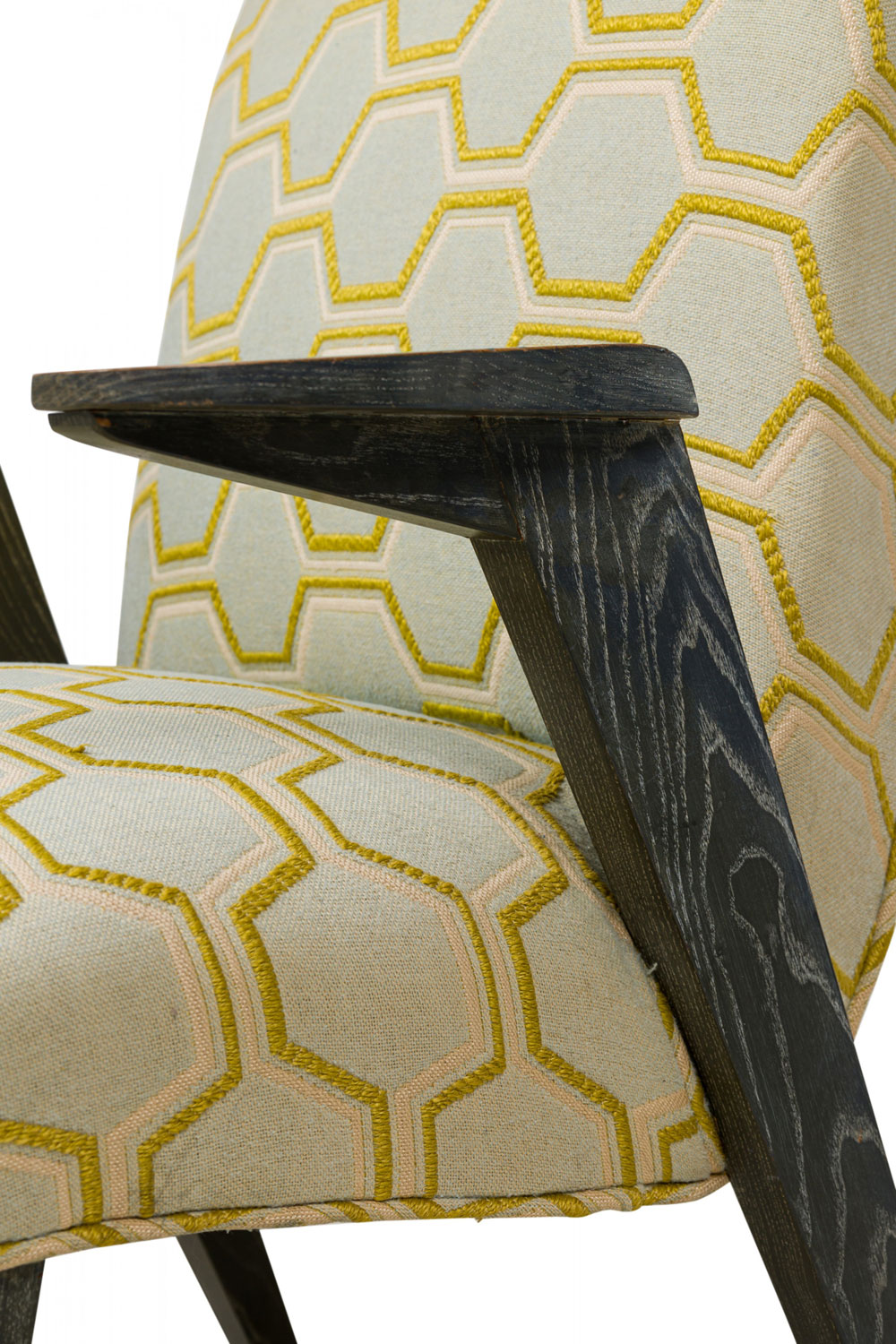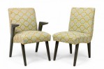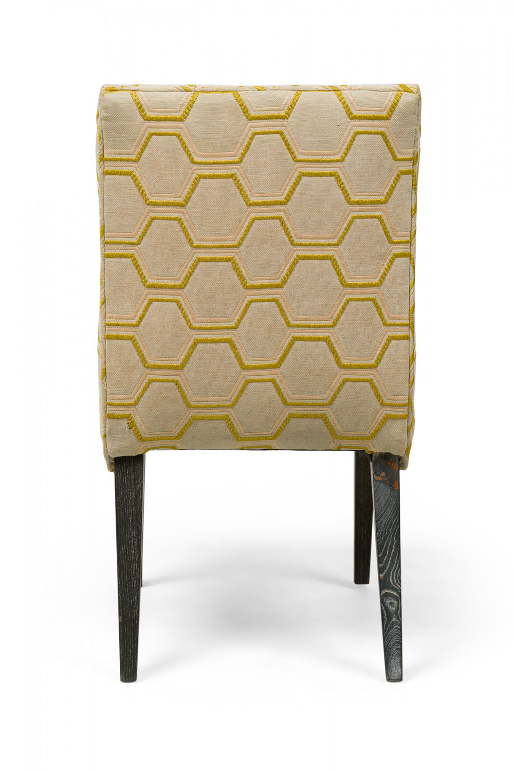 SET of 6 Mid-Century (1950s) American Modern matte gray cerused oak dining chairs, 2 armchairs, 4 side chairs, the back and seat upholstered in a textured geometric pattern with gold trim, the arms unified into the back legs' design. (JAMES MONT) (PRICED AS SET)