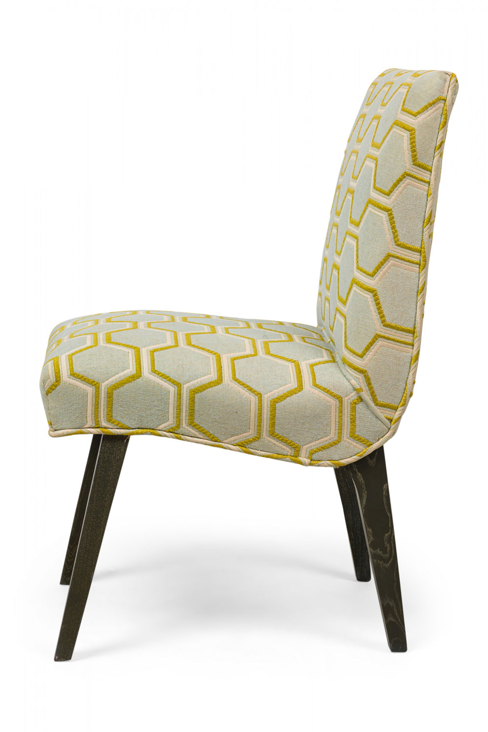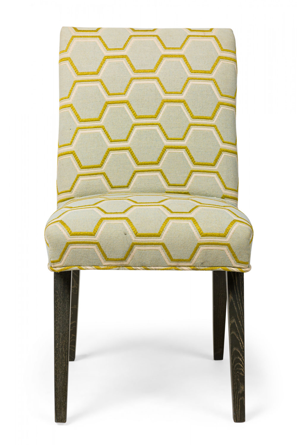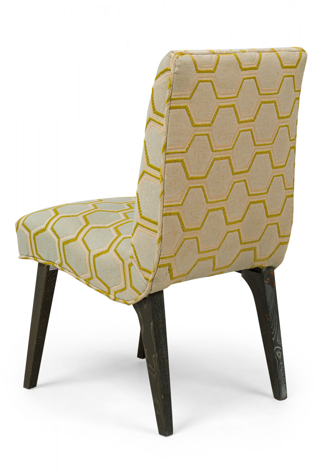 SET of 6 Mid-Century (1950s) American Modern matte gray cerused oak dining chairs, 2 armchairs, 4 side chairs, the back and seat upholstered in a textured geometric pattern with gold trim, the arms unified into the back legs' design. (JAMES MONT) (PRICED AS SET).