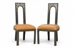 SET of 6 Mid-Century (1940s) American Modern dining chairs with cerused gray frames, narrow rectangular openwork backrests featuring an arched interior, carved in a wing design with silver leaf accents, with seats upholstered in a textured gold fabric, standing on 2 straight front legs and slightly splayed back legs. (PRICED AS SET) (JAMES MONT).