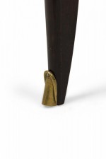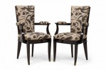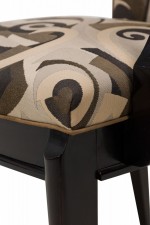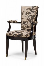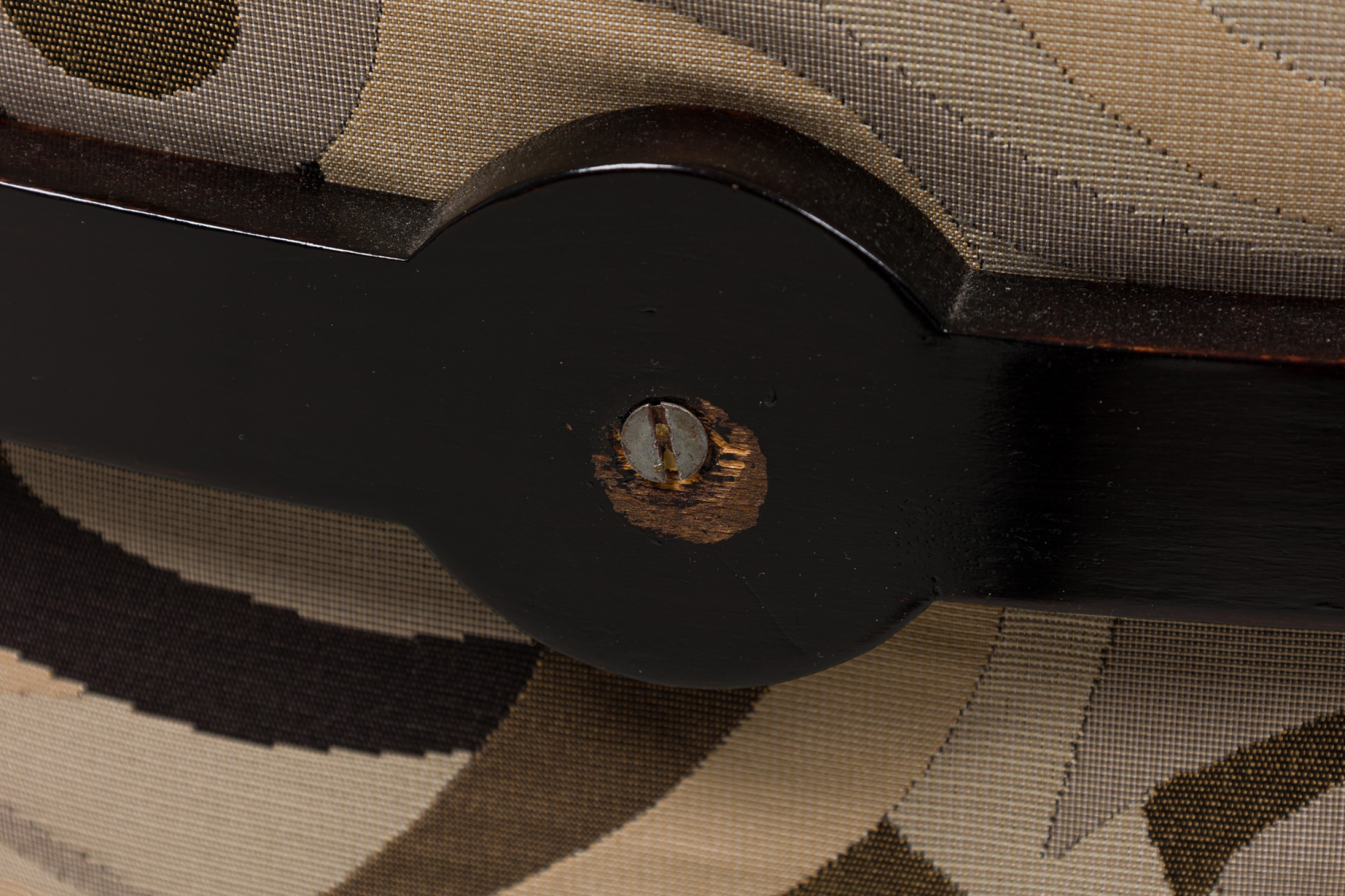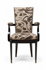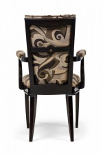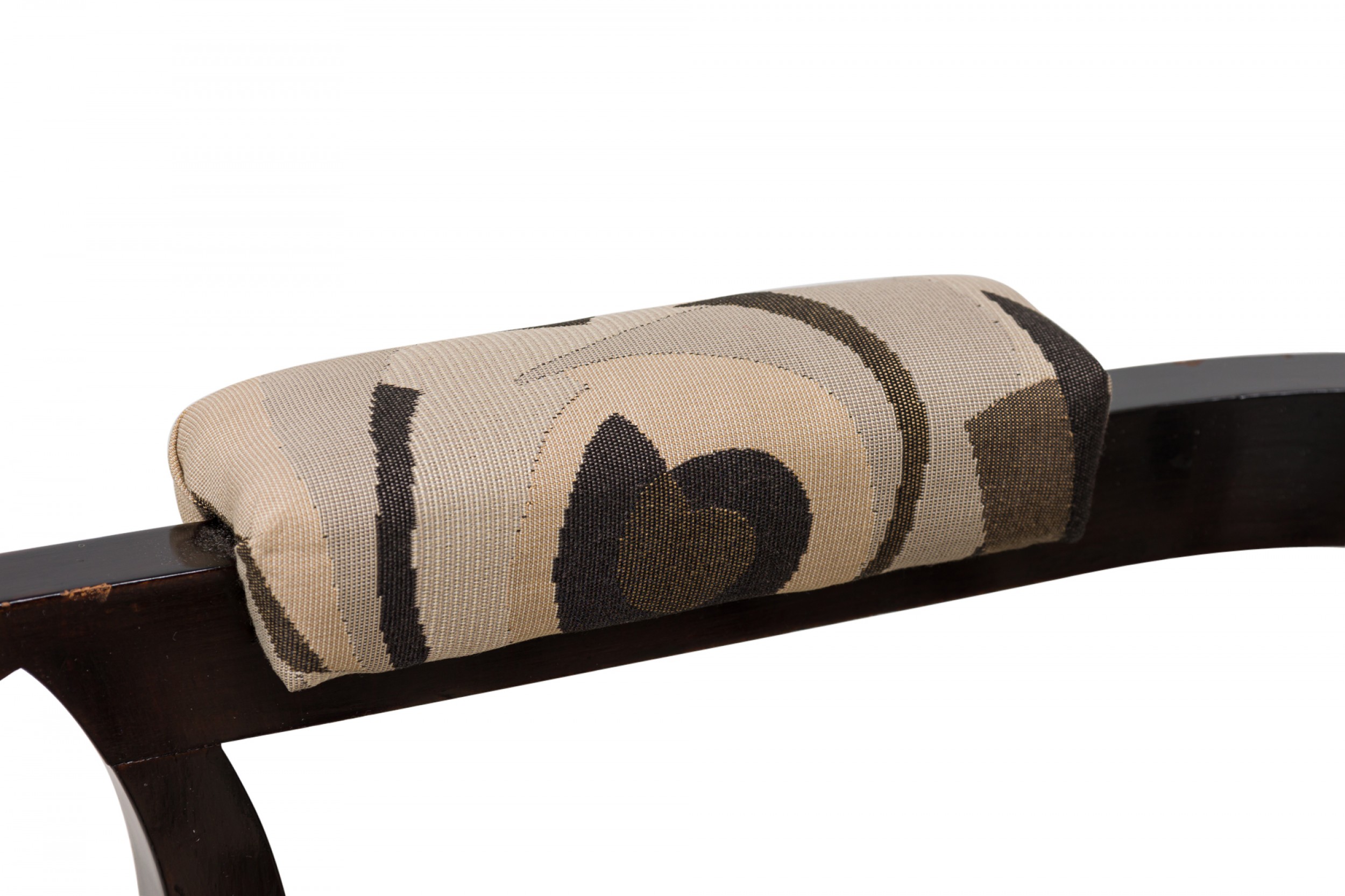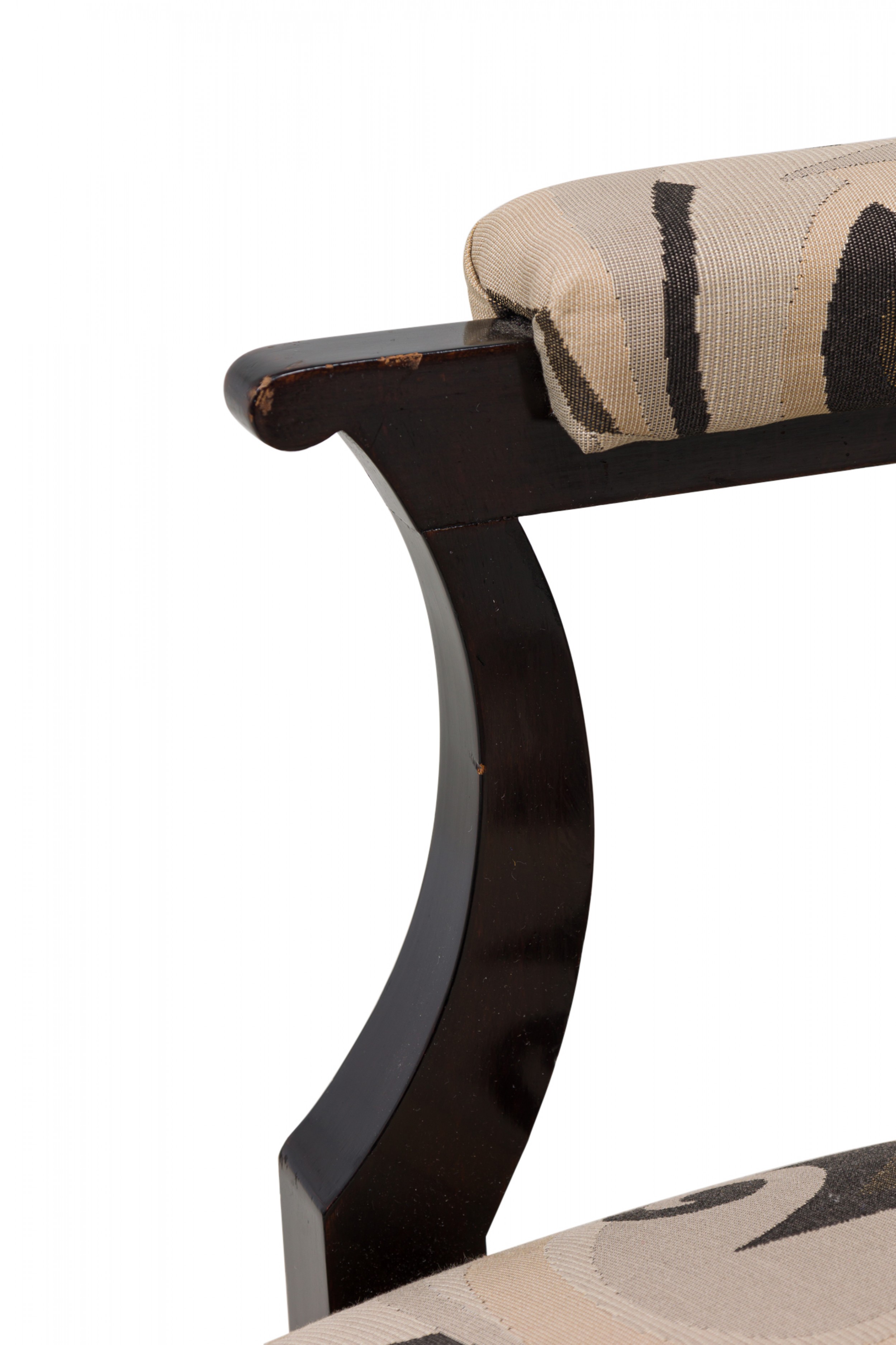 Style: Art Deco Materials & Techniques: Ebonized, fabric, upholstered, wood Category: Seating, Dining Room Condition: 1 broken armrest. 2 loose sabots. Some intermittent wear on legs. Good; Wear consistent with age and use