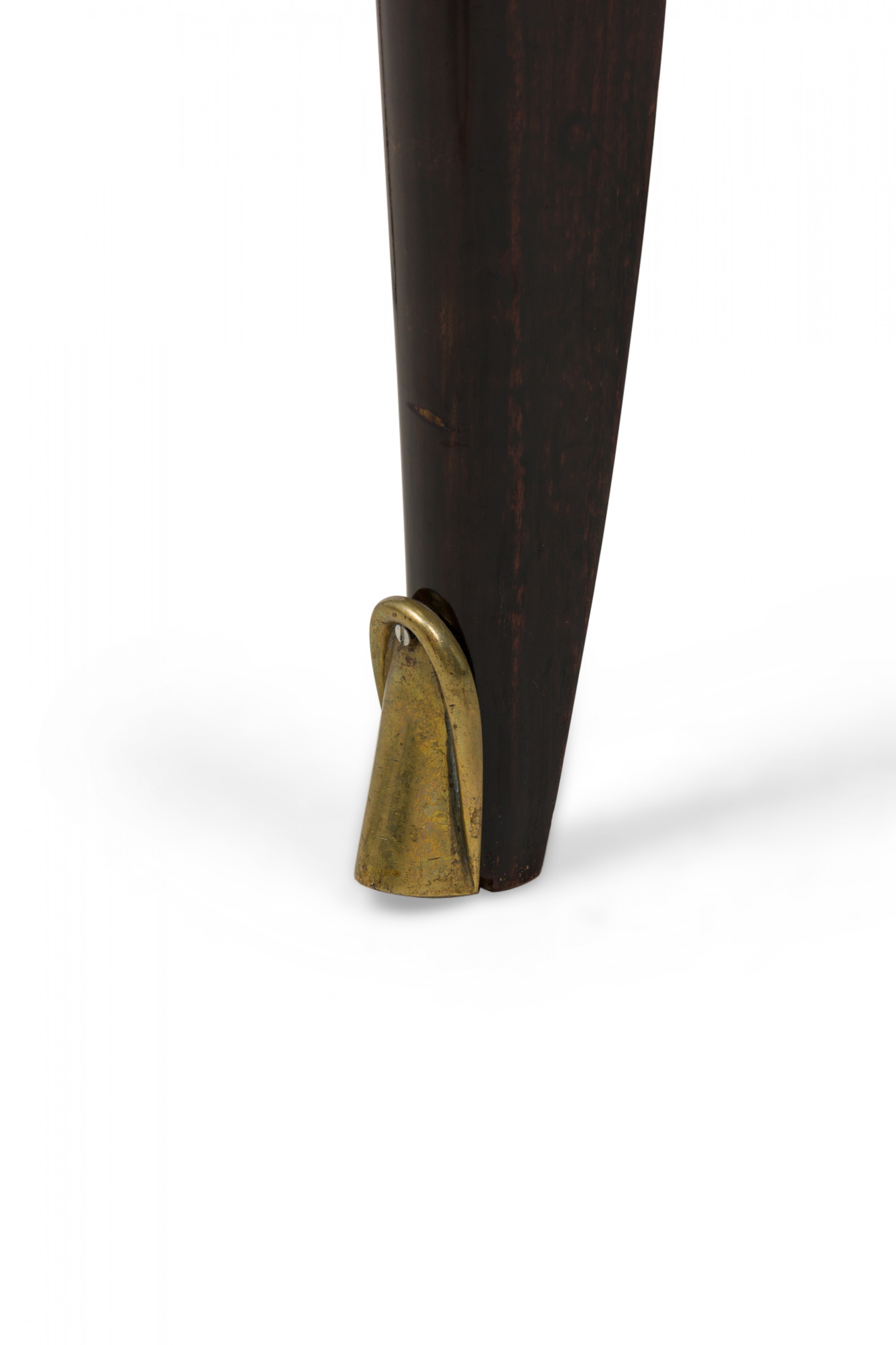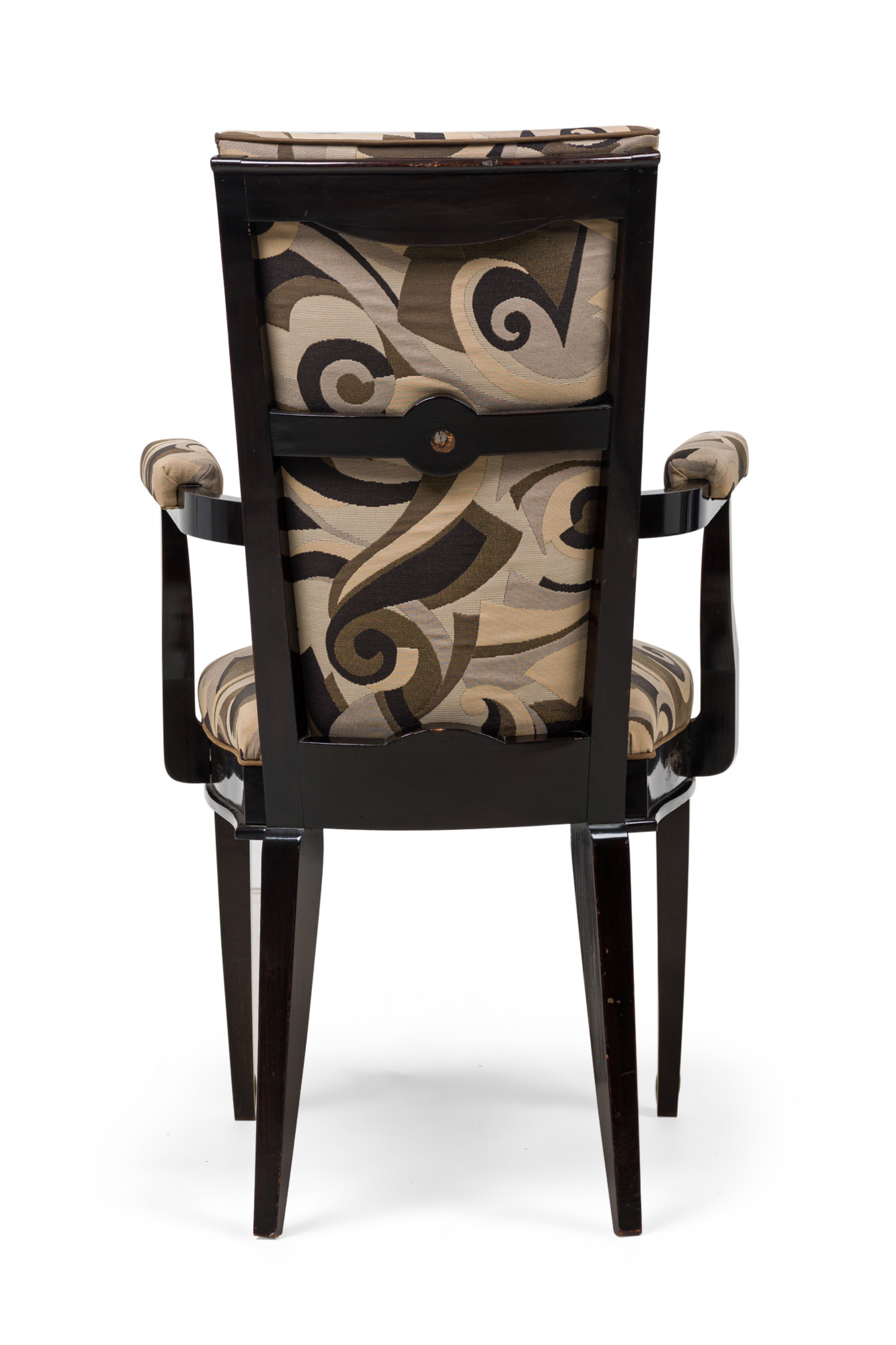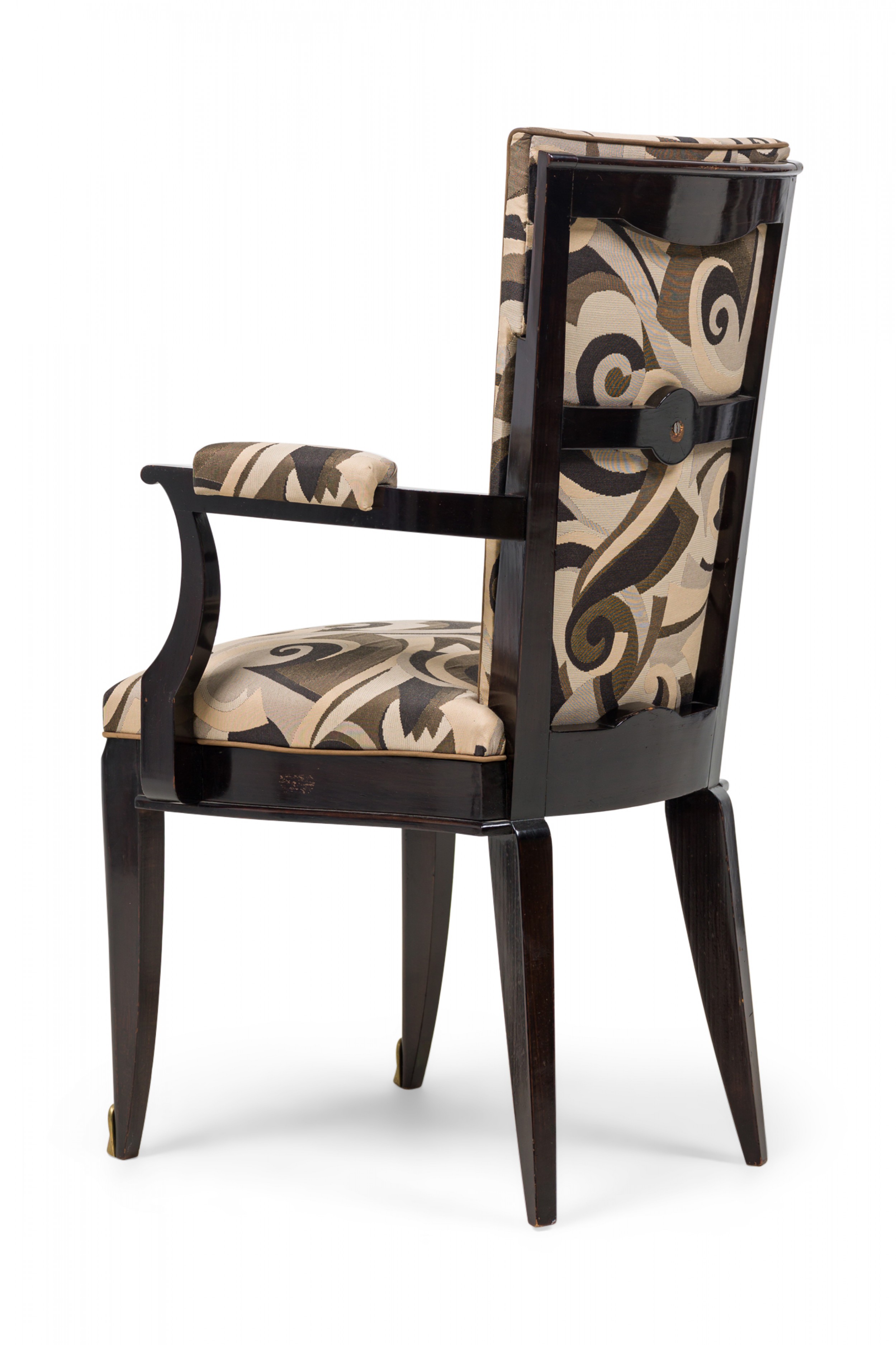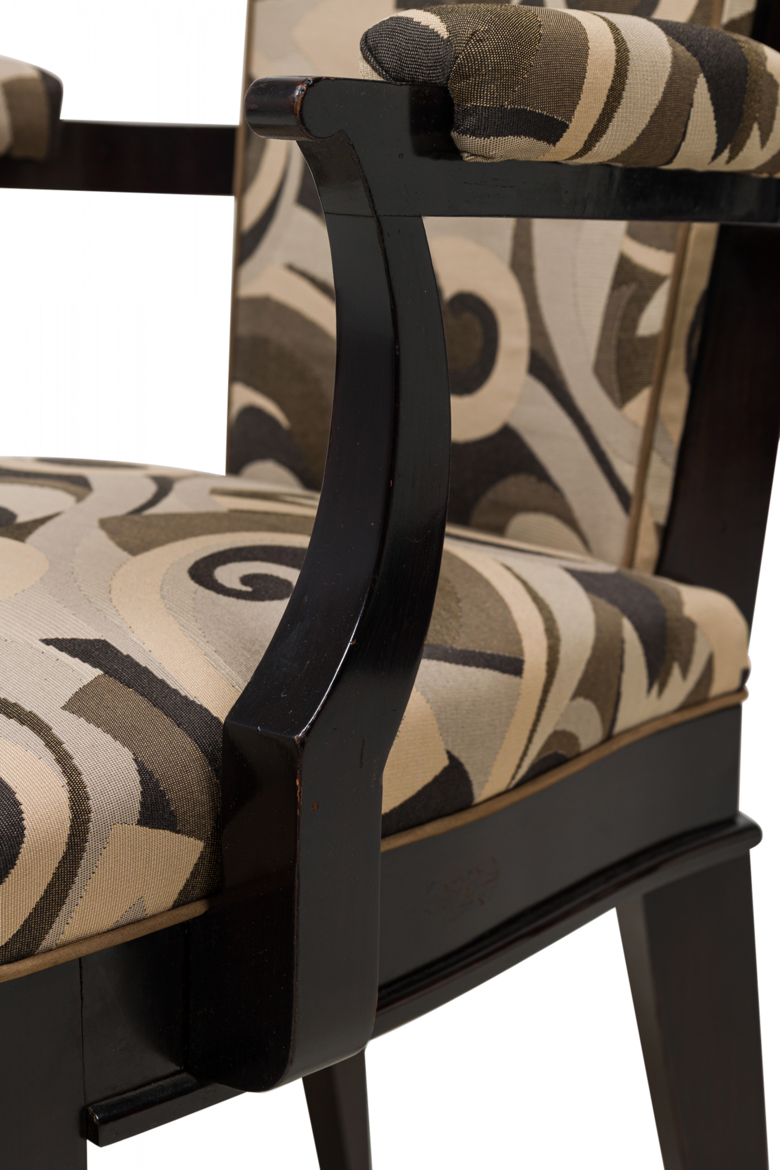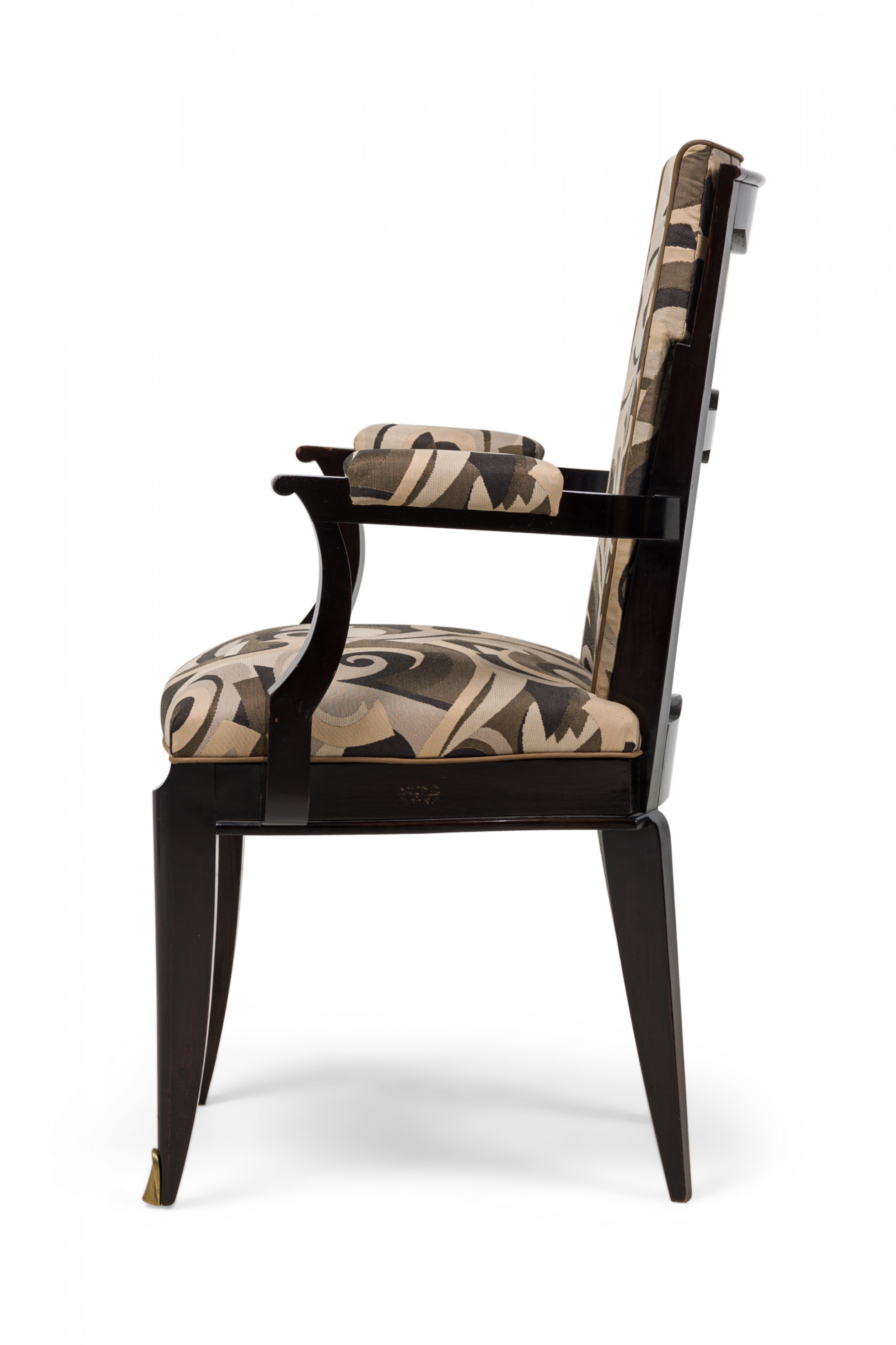 SET of 6 French Art Deco Ebony de Macassar armchairs featuring a tapered rectangular back, scroll arms with armrests, upholstered in an earth tone geometric patterned fabric with piping, molded frieze, the 2 front legs splayed with brass sabots. (Attributed to DOMINIQUE) (PRICED AS SET)