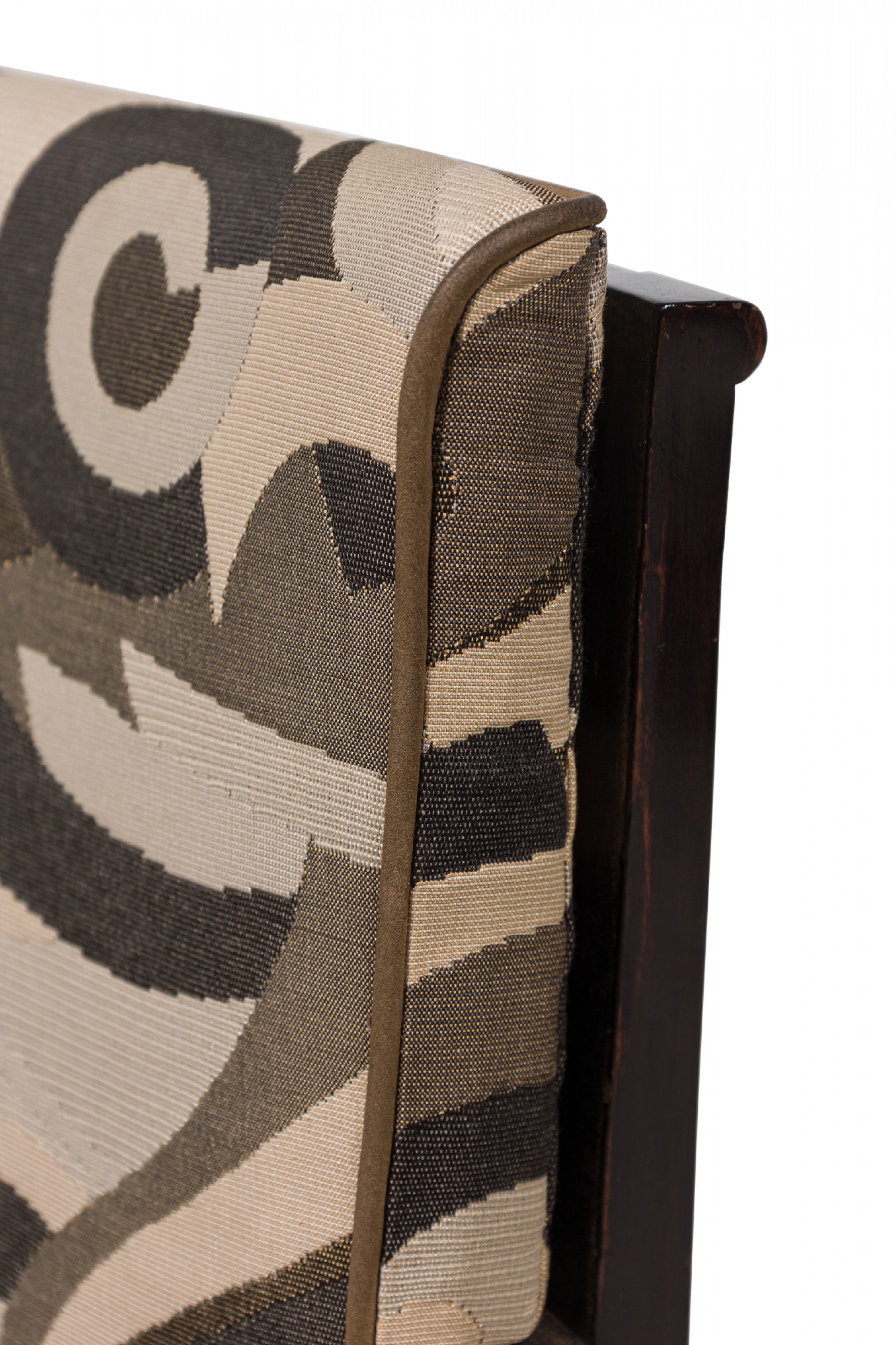 SET of 6 French Art Deco Ebony de Macassar armchairs featuring a tapered rectangular back, scroll arms with armrests, upholstered in an earth tone geometric patterned fabric with piping, molded frieze, the 2 front legs splayed with brass sabots. (Attributed to DOMINIQUE) (PRICED AS SET).