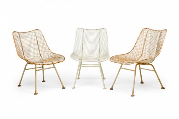 Style: Mid-Century Materials & Techniques: Iron, metal, steel Category: Seating, Office/Library, Dining Room Condition: One chair restored, remainder have losses to paint and some rust. Good; Minor losses