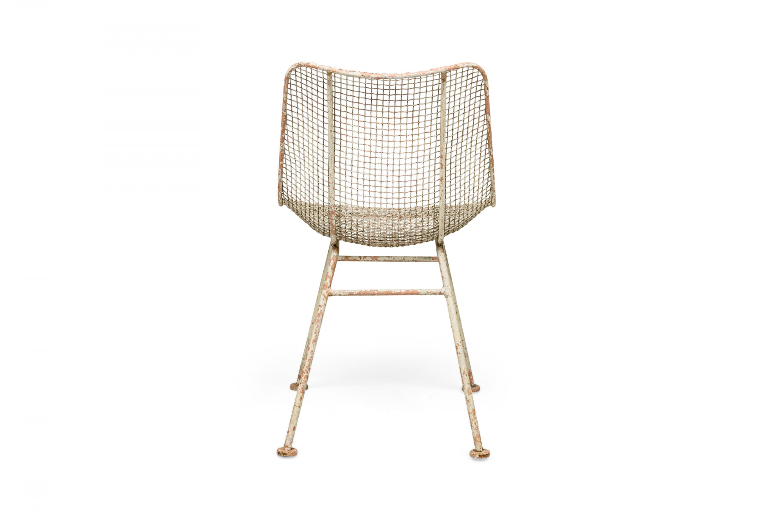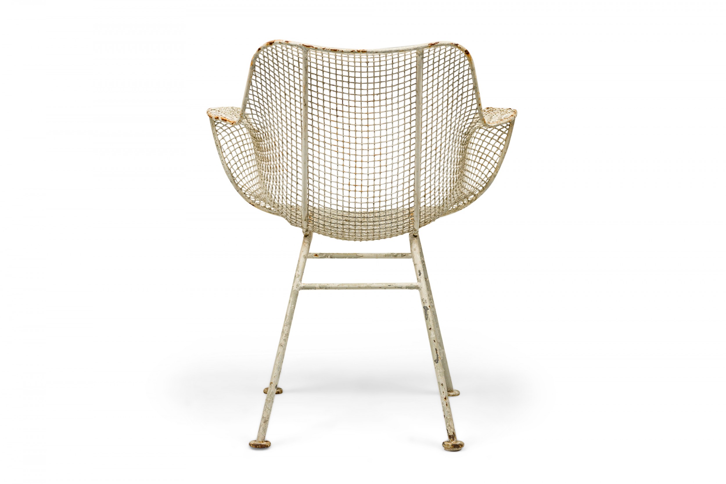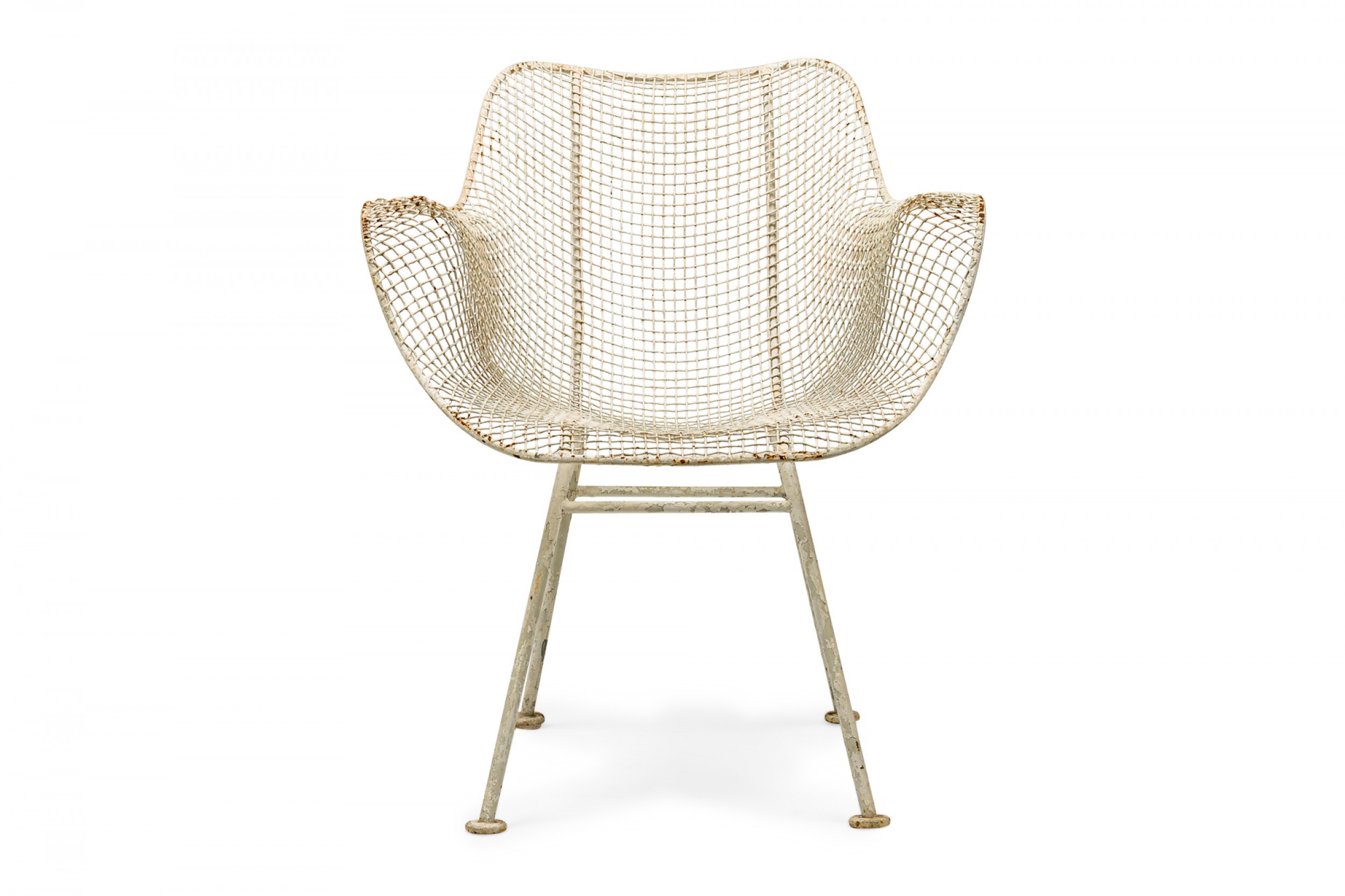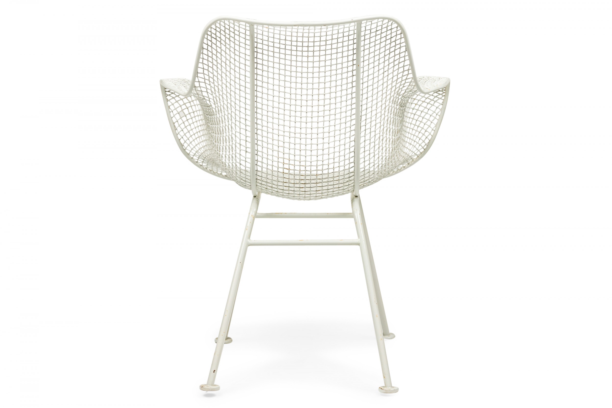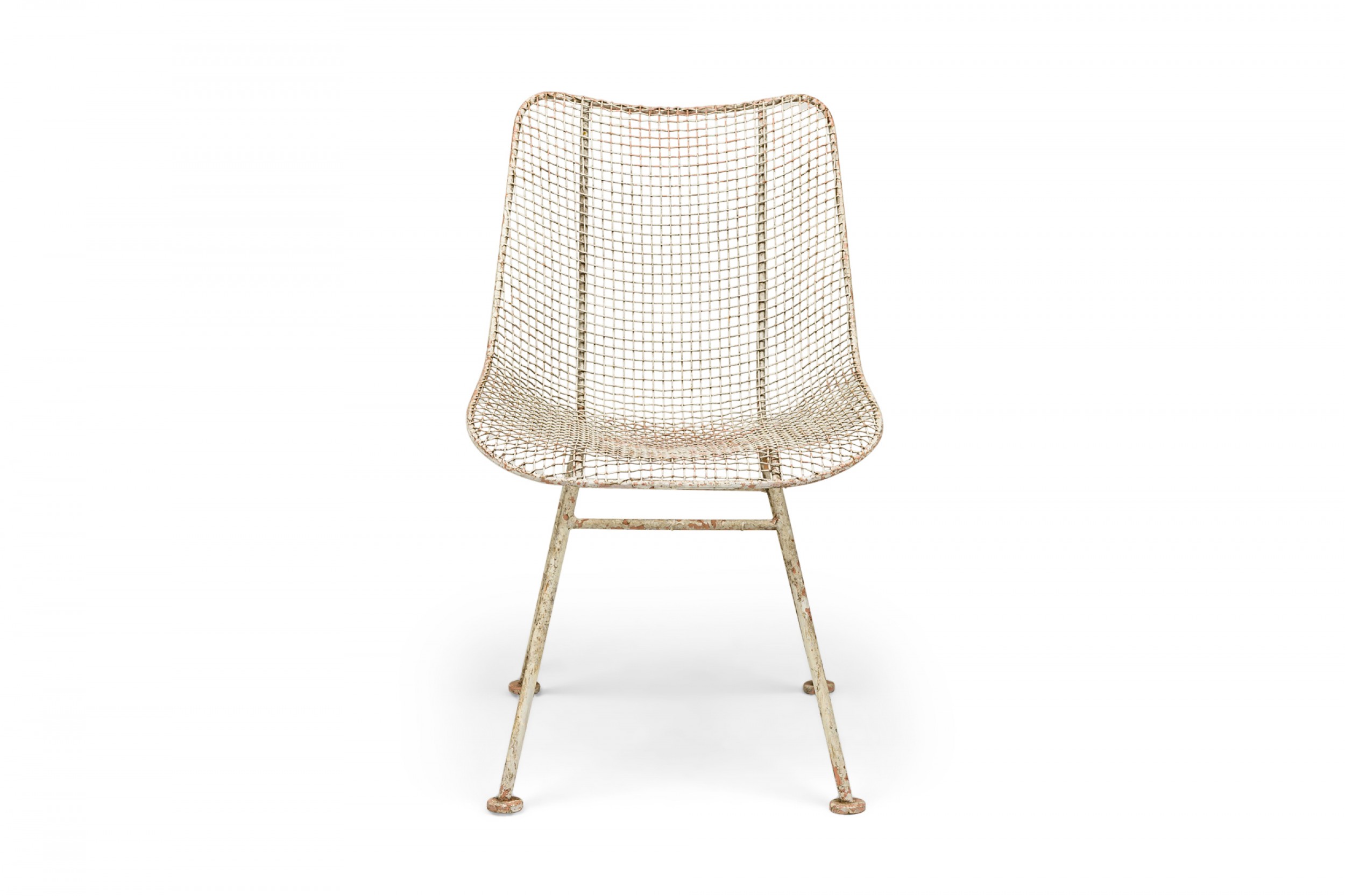 SET of 6 Mid-Century American white mesh dining chairs, 2 with arms, 4 sides made from wrought iron and woven steel for indoor and/or outdoor use (RUSSELL WOODARD)(PRICED AS SET)(Other examples as set of 7 low side chairs: DUF0813).