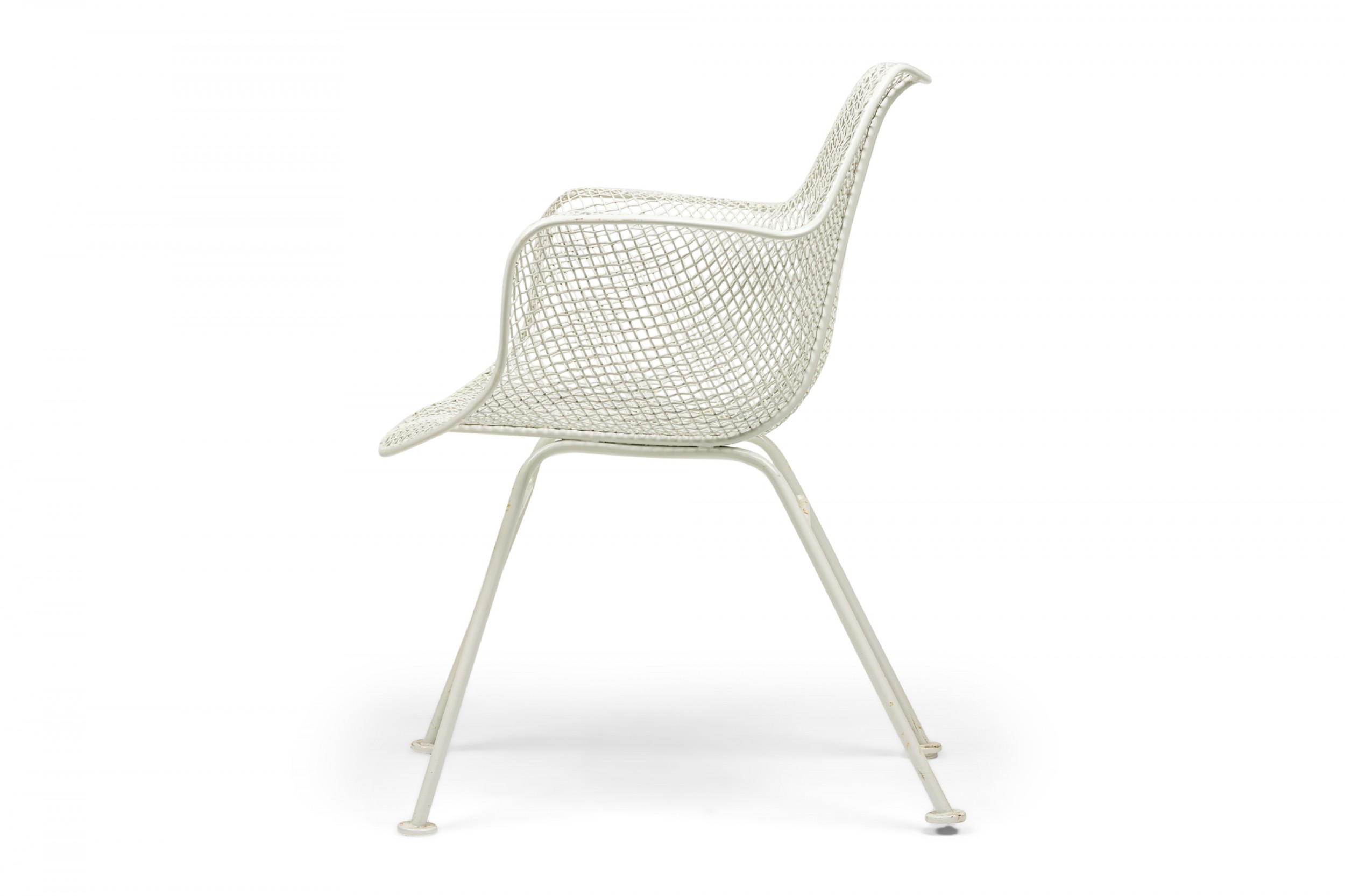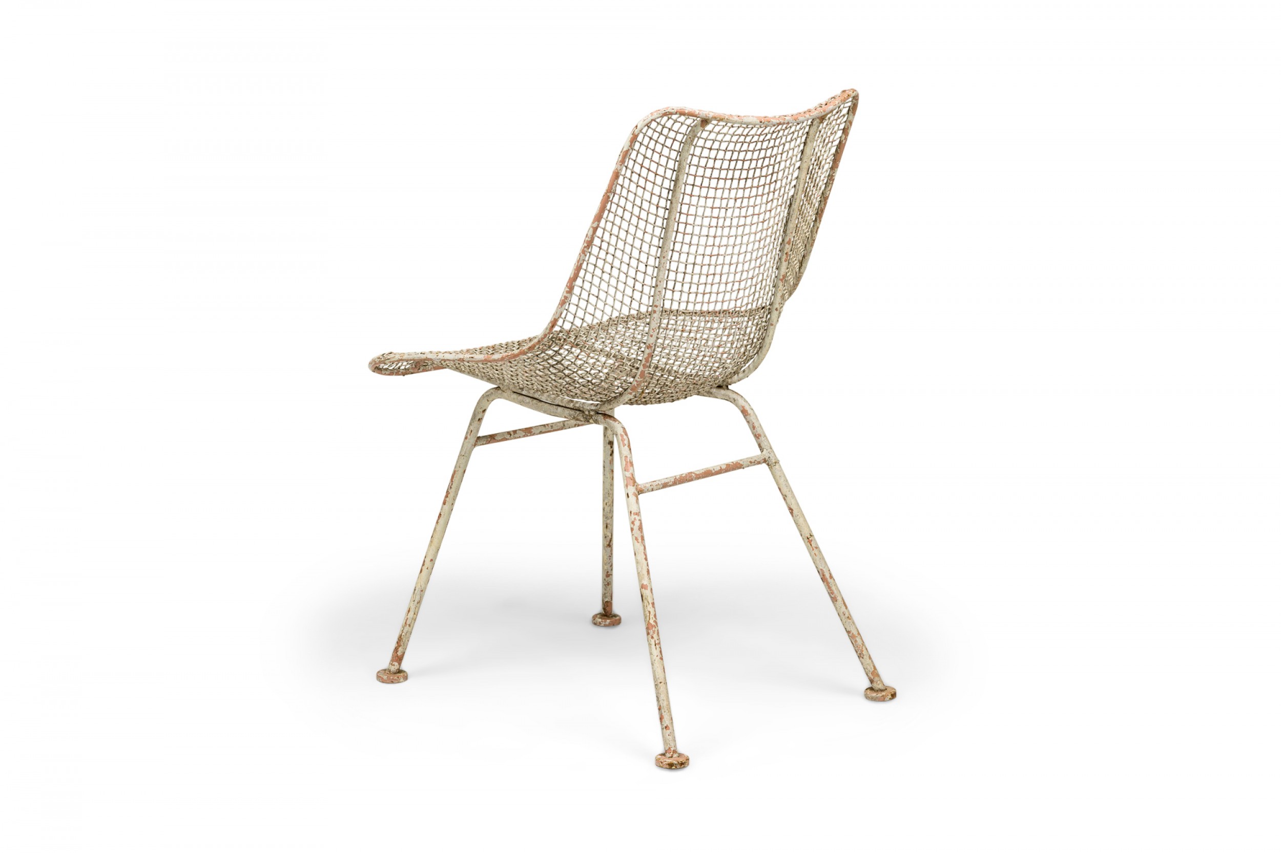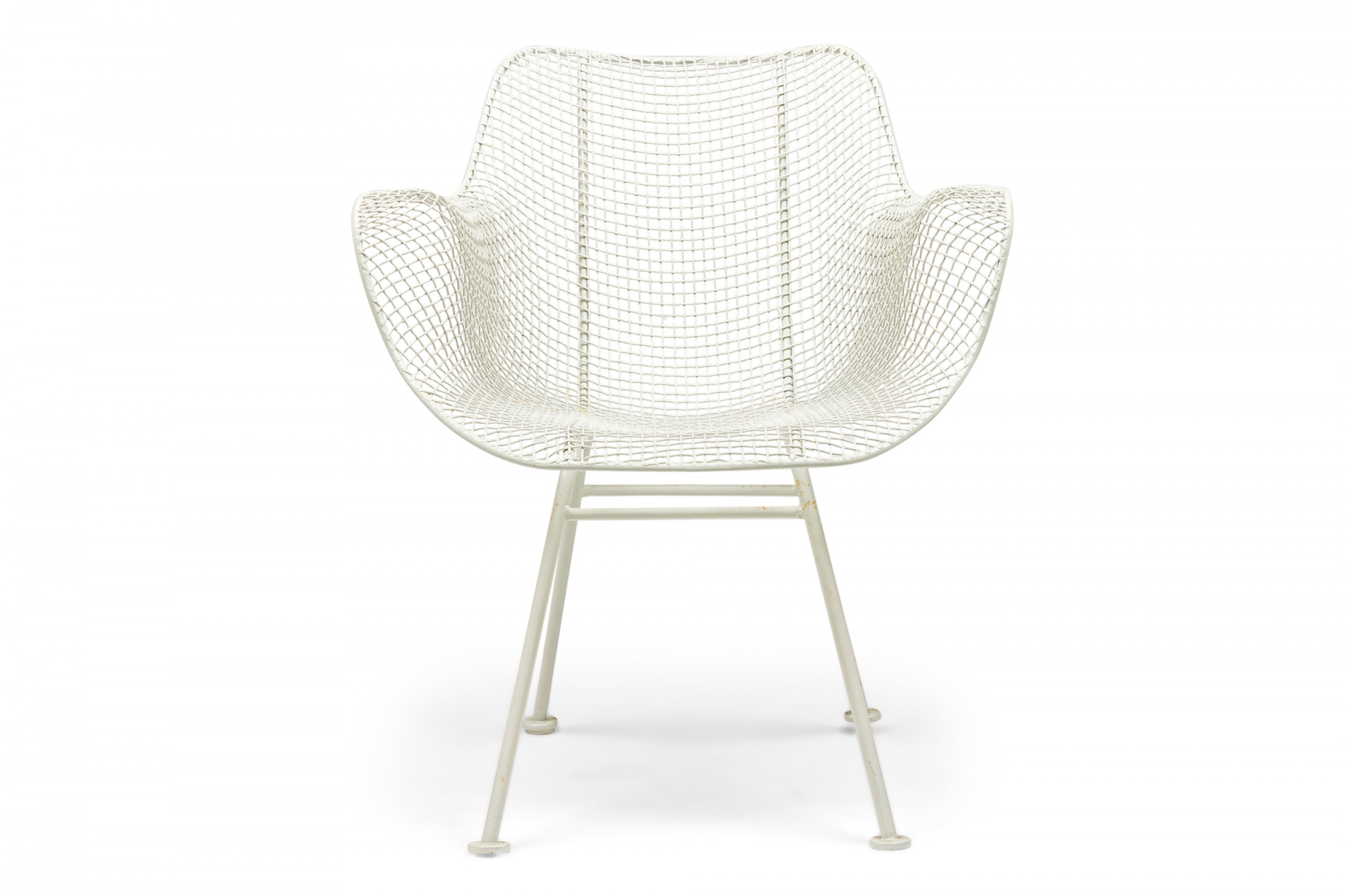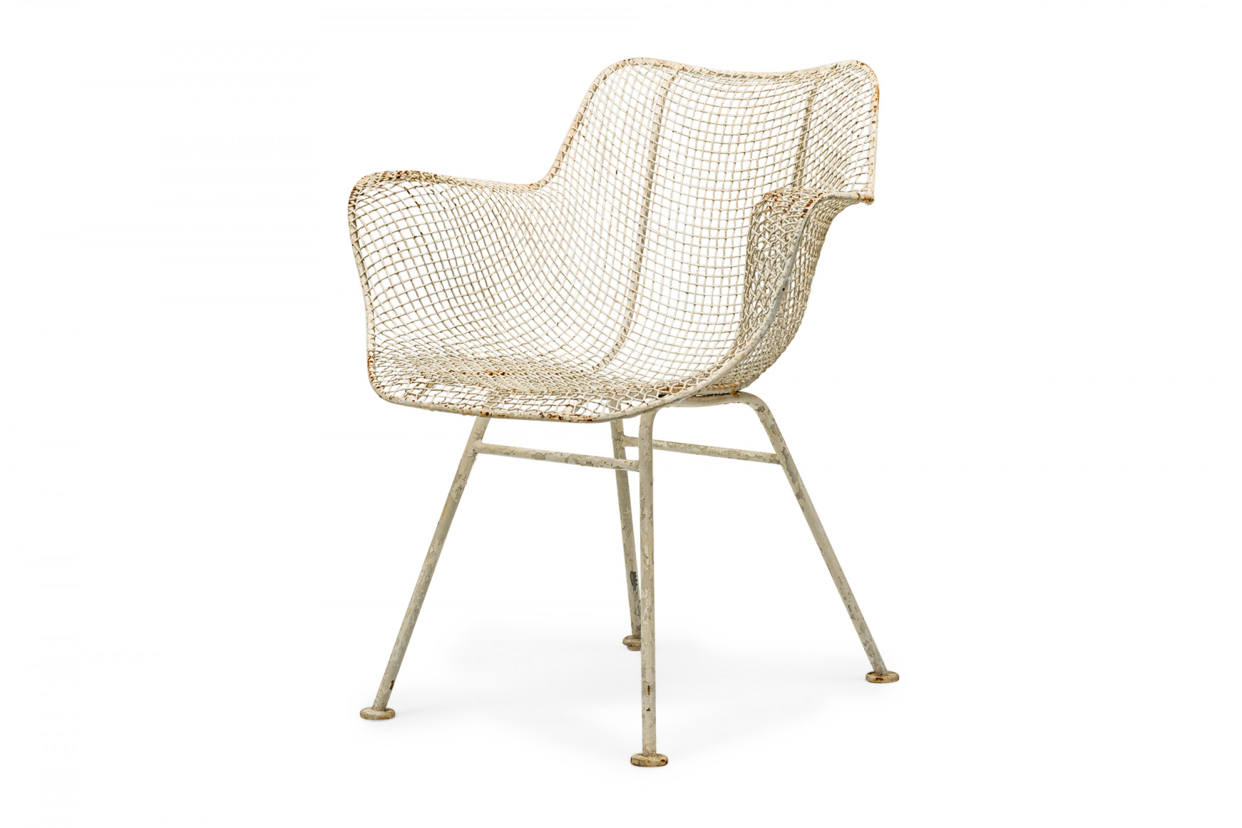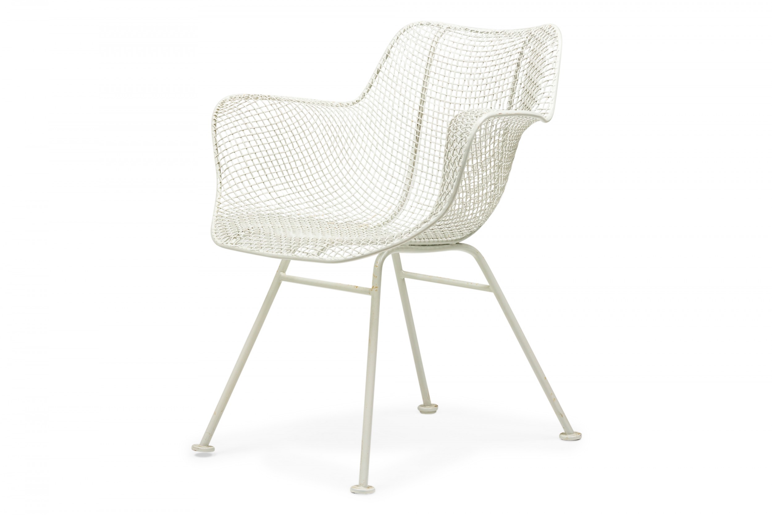 SET of 6 Mid-Century American white mesh dining chairs, 2 with arms, 4 sides made from wrought iron and woven steel for indoor and/or outdoor use (RUSSELL WOODARD)(PRICED AS SET)(Other examples as set of 7 low side chairs: DUF0813).