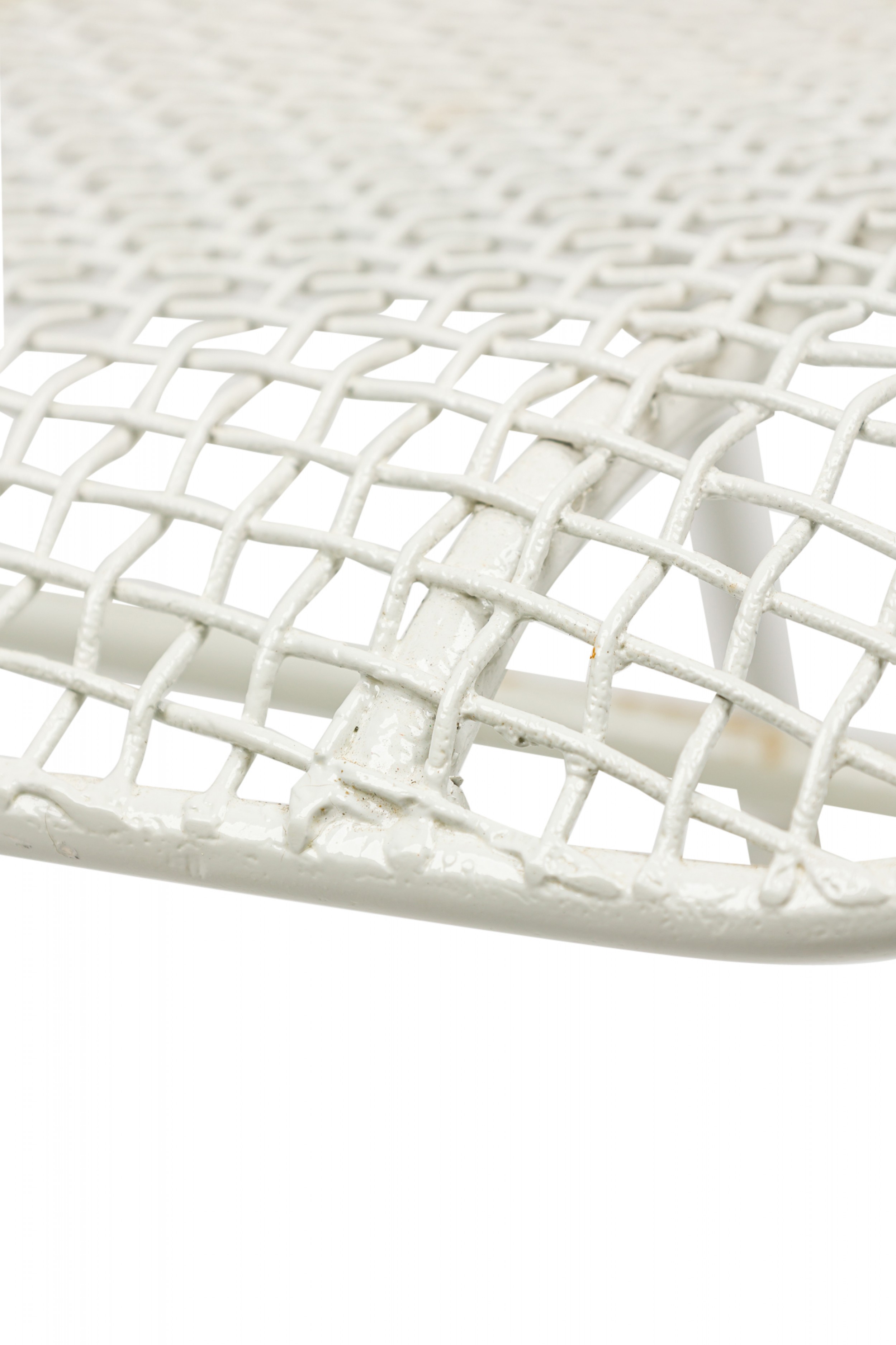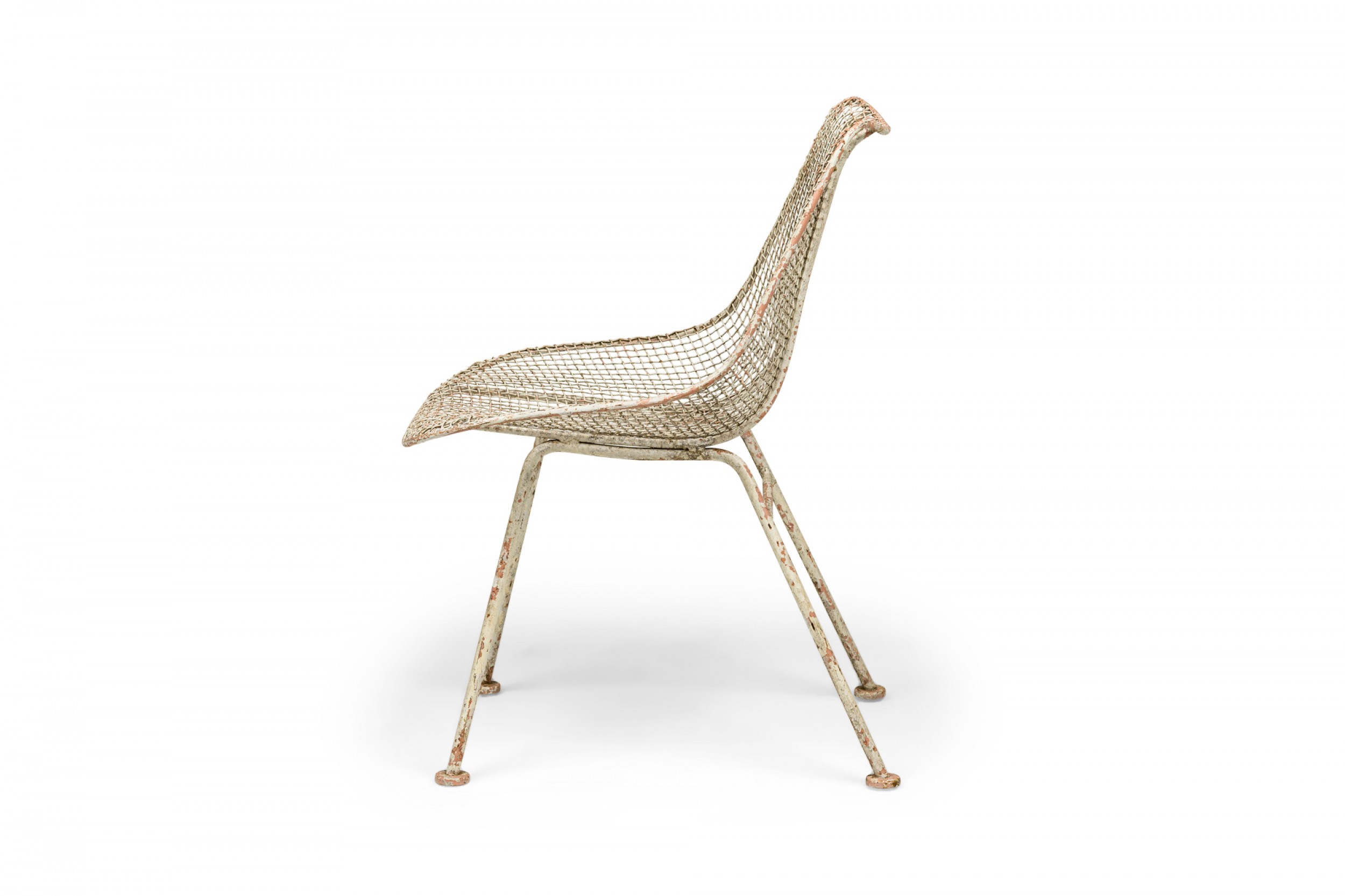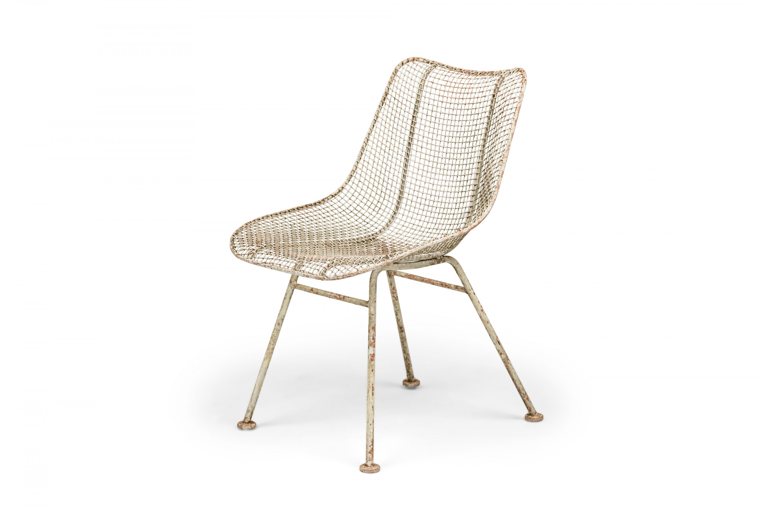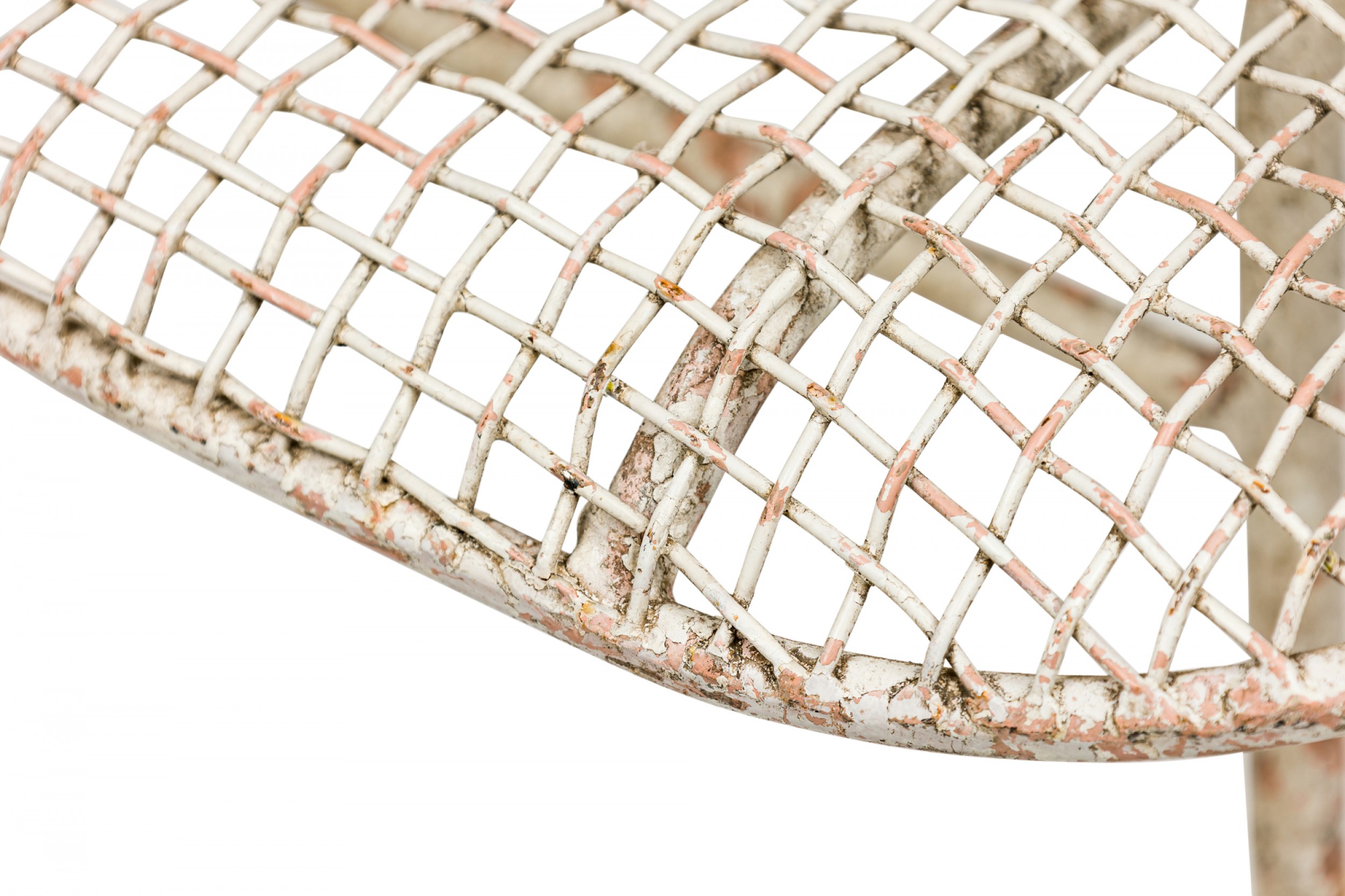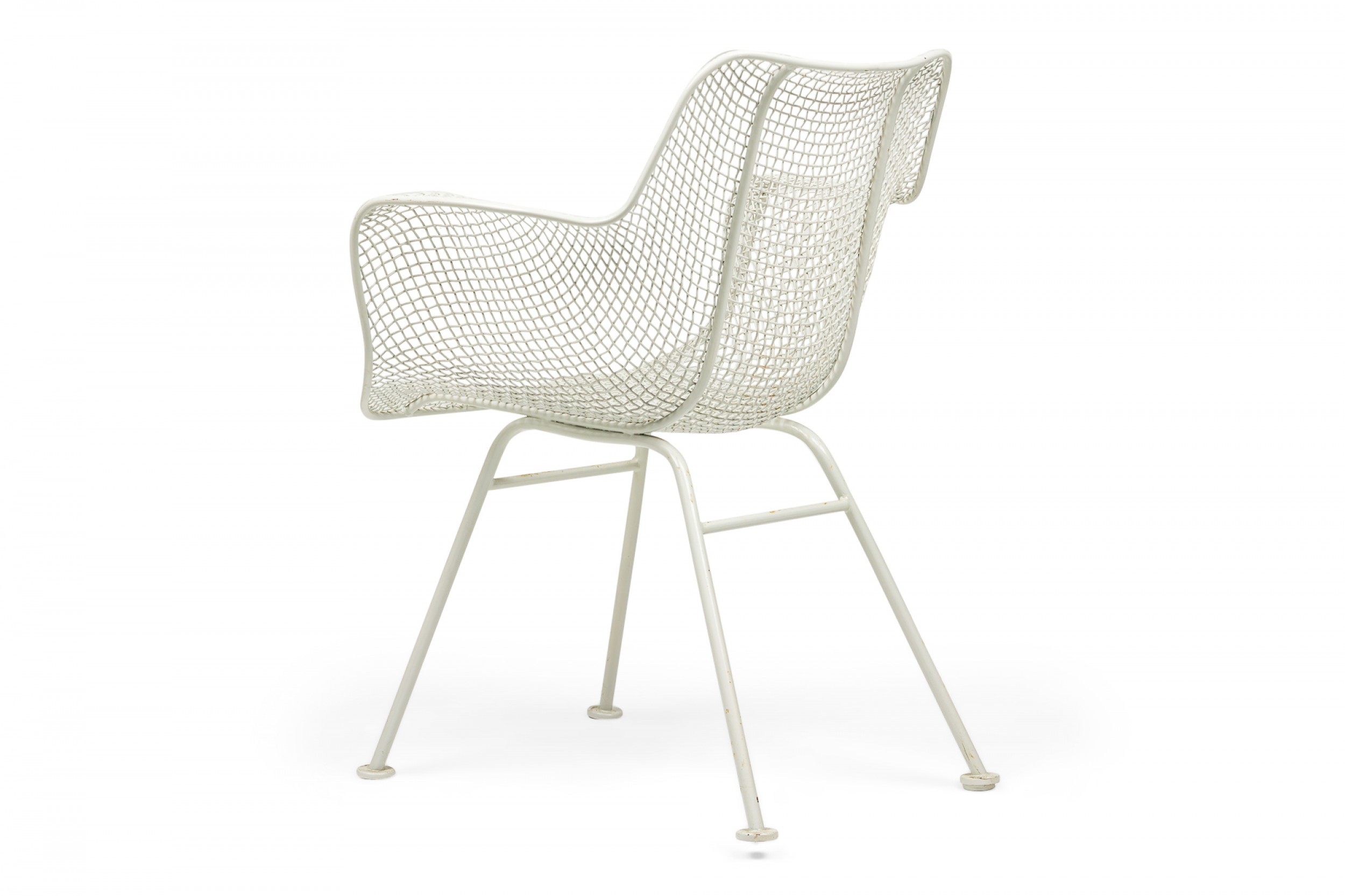 SET of 6 Mid-Century American white mesh dining chairs, 2 with arms, 4 sides made from wrought iron and woven steel for indoor and/or outdoor use (RUSSELL WOODARD)(PRICED AS SET)(Other examples as set of 7 low side chairs: DUF0813).
