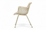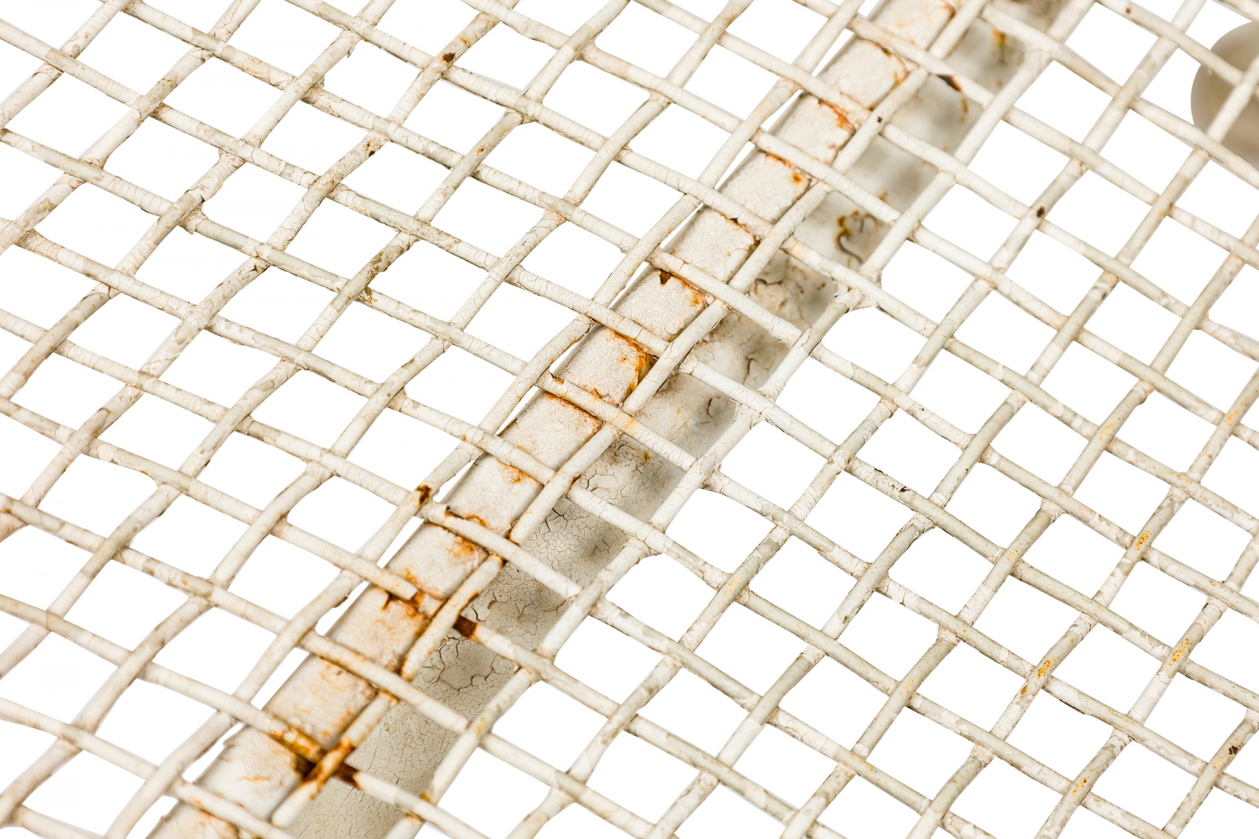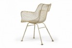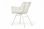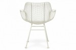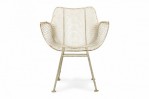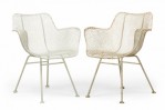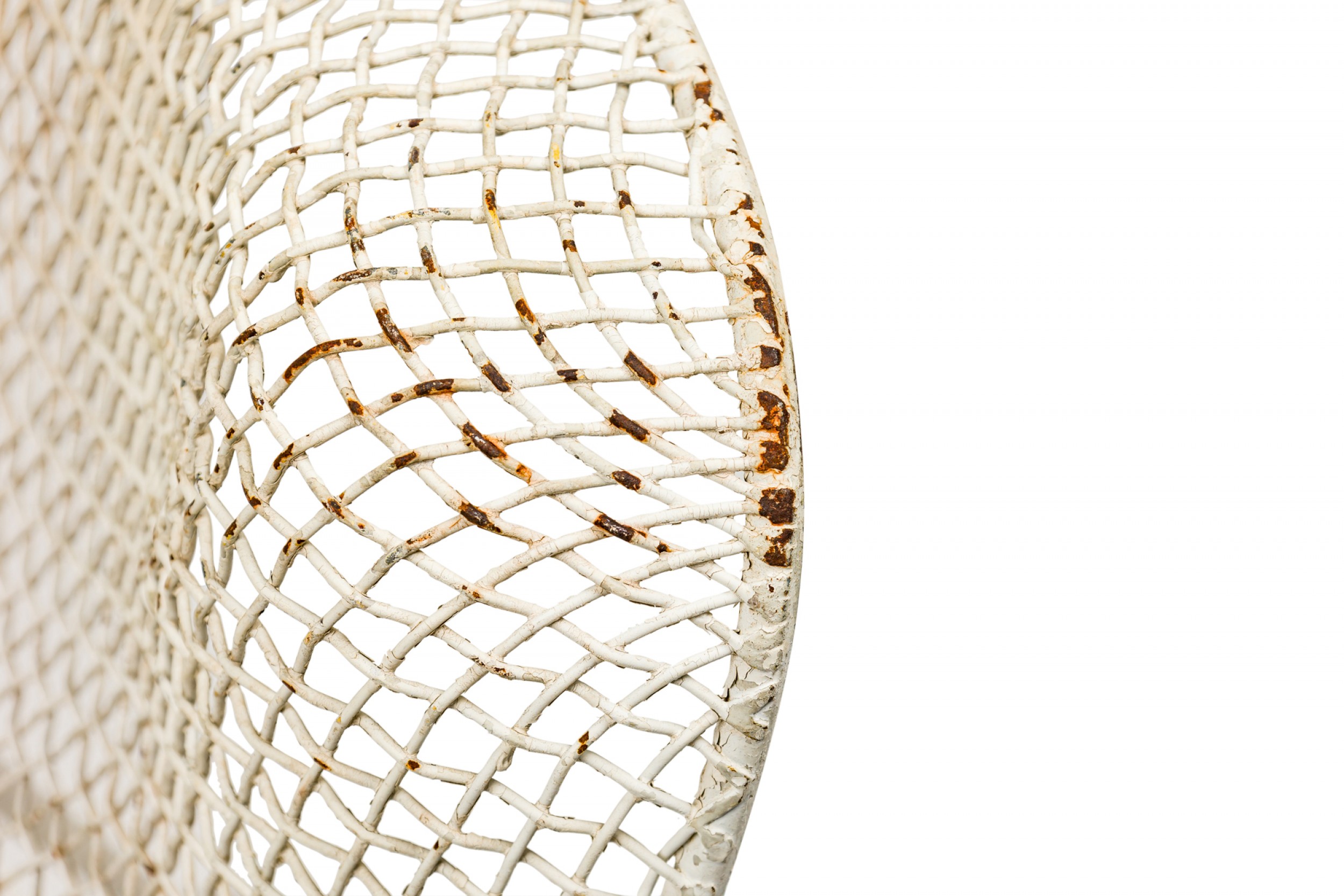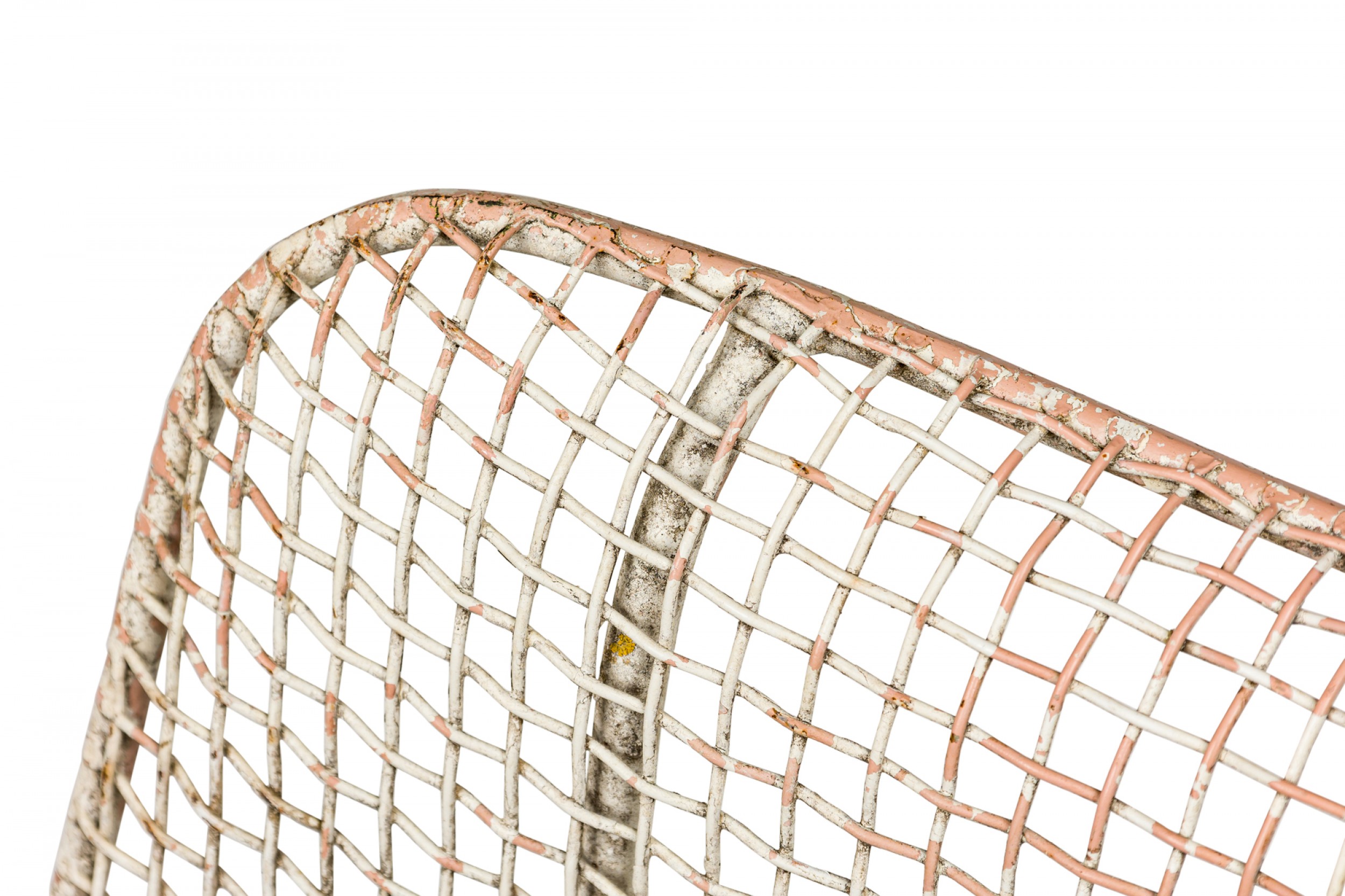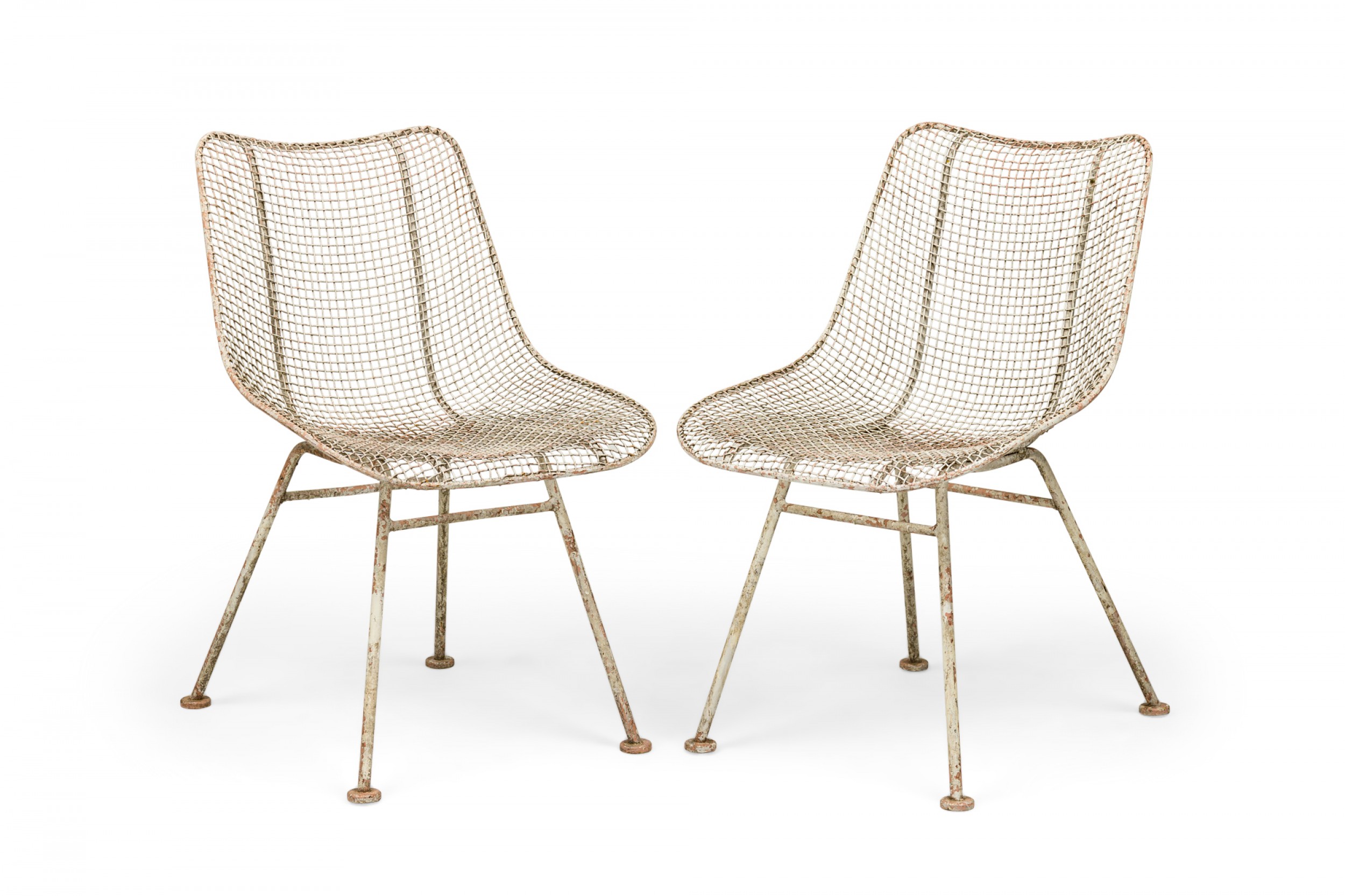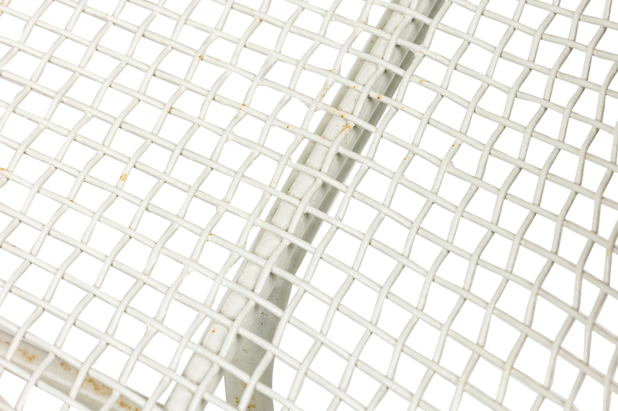SET of 6 Mid-Century American white mesh dining chairs, 2 with arms, 4 sides made from wrought iron and woven steel for indoor and/or outdoor use (RUSSELL WOODARD)(PRICED AS SET)(Other examples as set of 7 low side chairs: DUF0813).