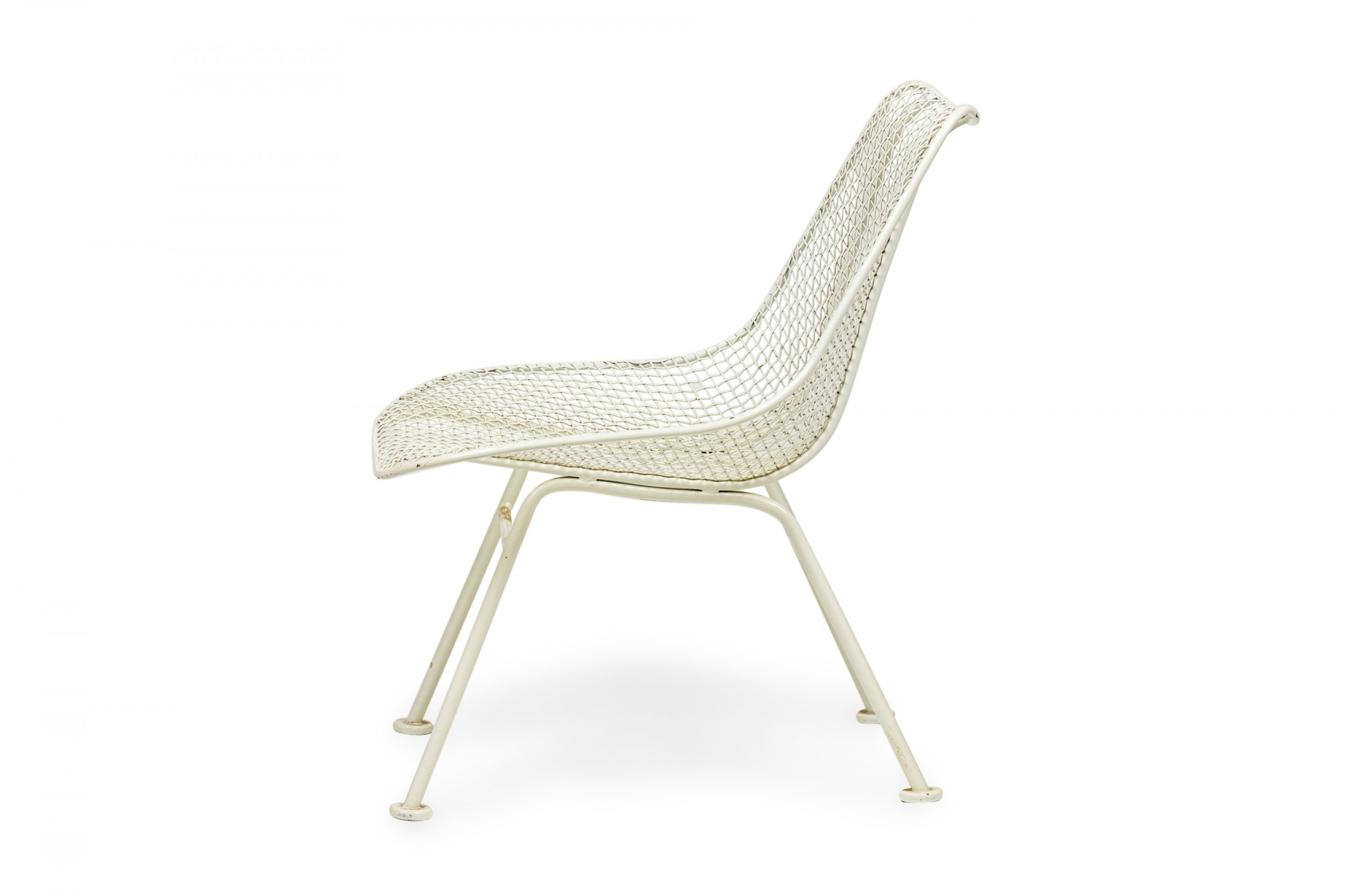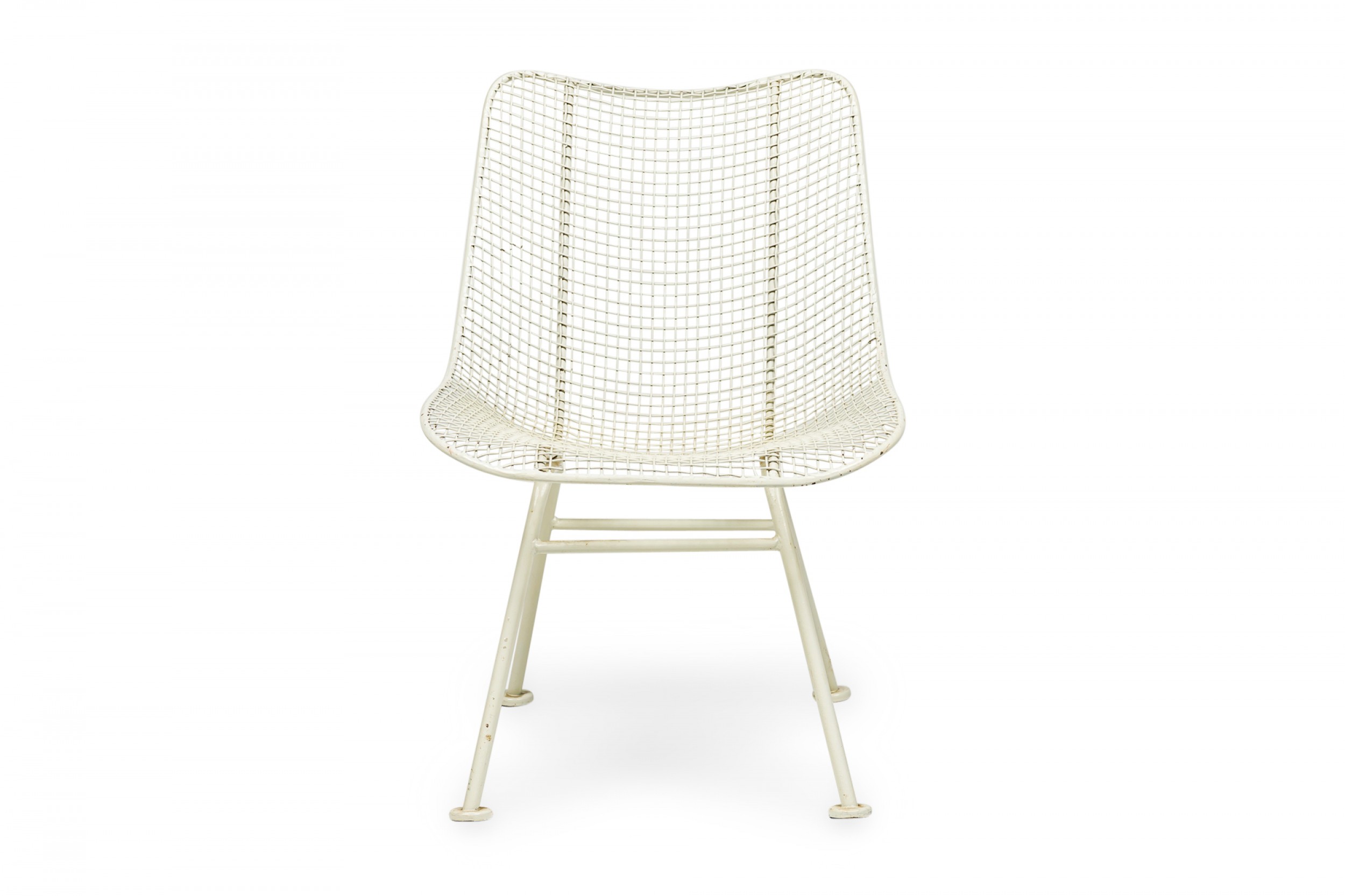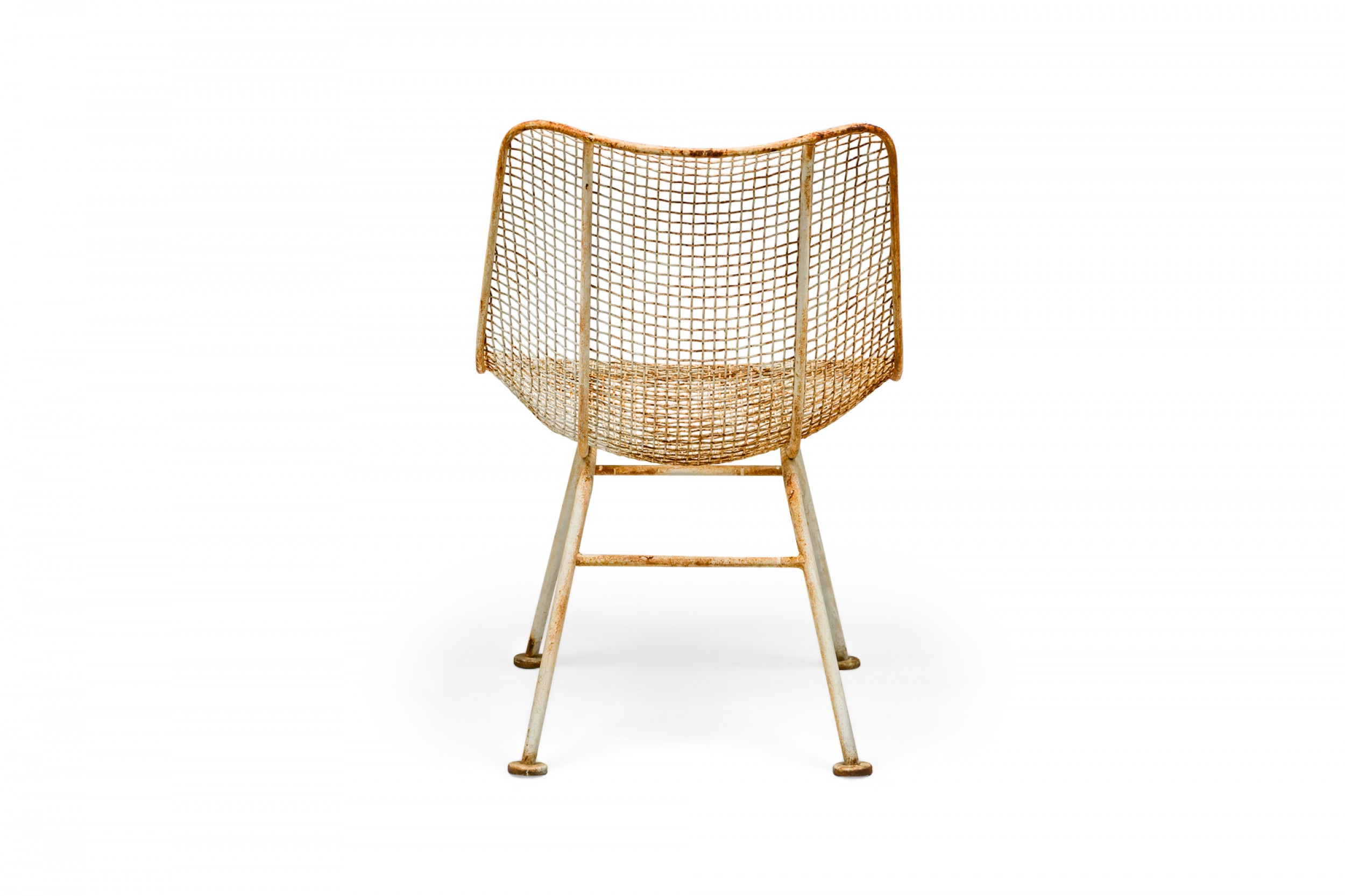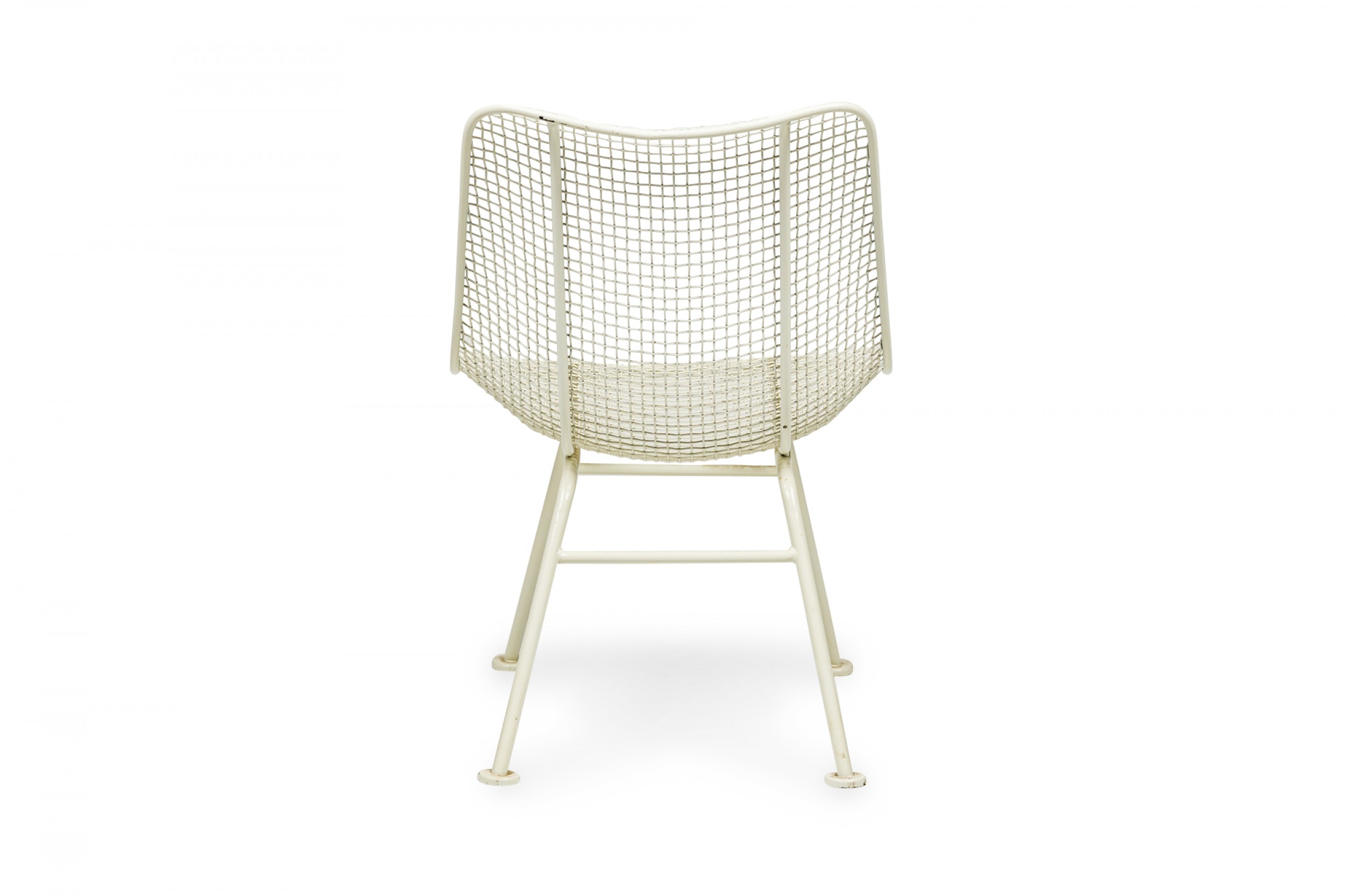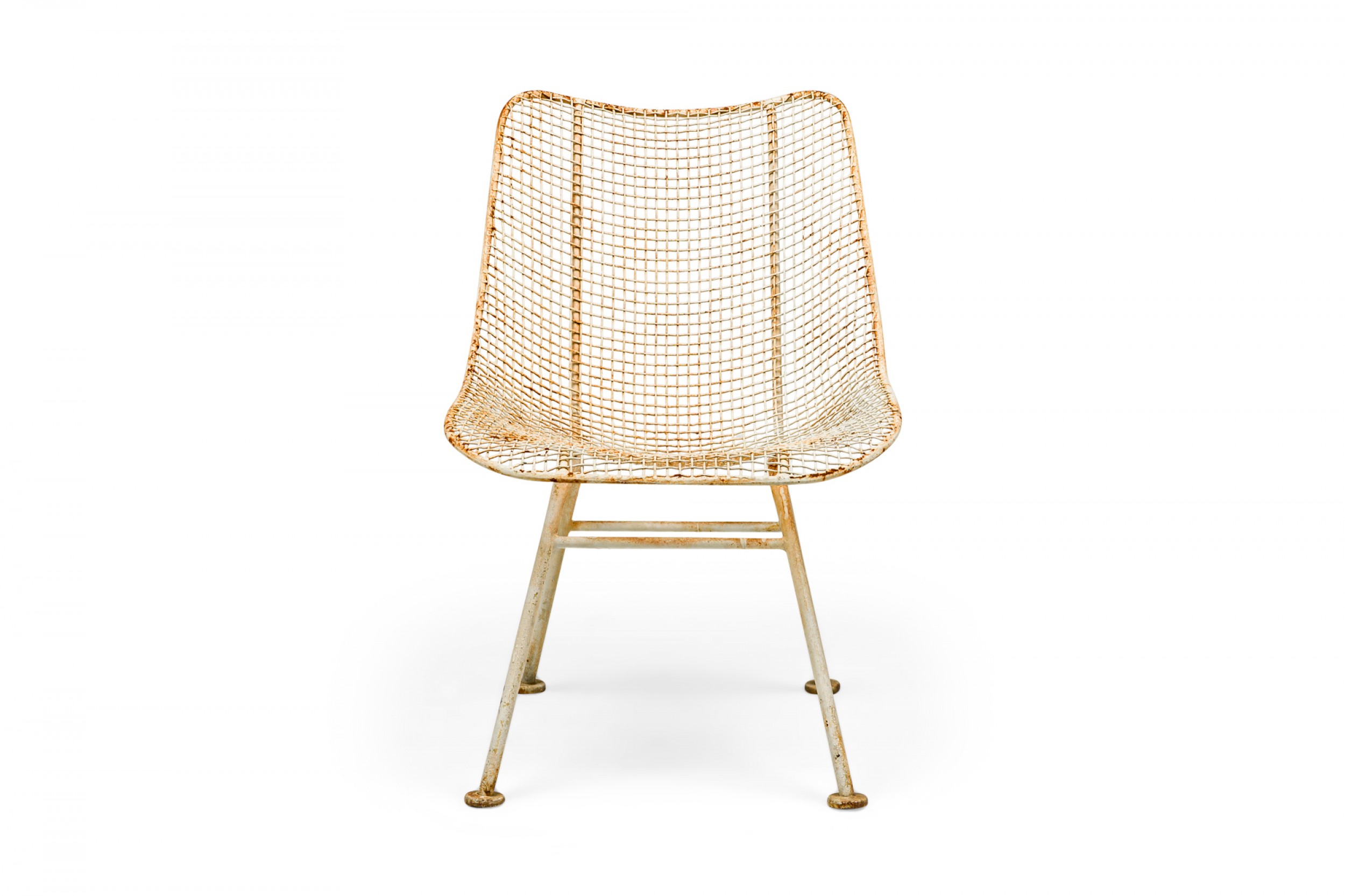 SET of 7 Mid-Century American white mesh low dining chairs made from wrought iron and woven steel for indoor and/or outdoor use (RUSSELL WOODARD)(PRICED AS SET)(Other examples as set of 6 with 2 arms: DUF0815).