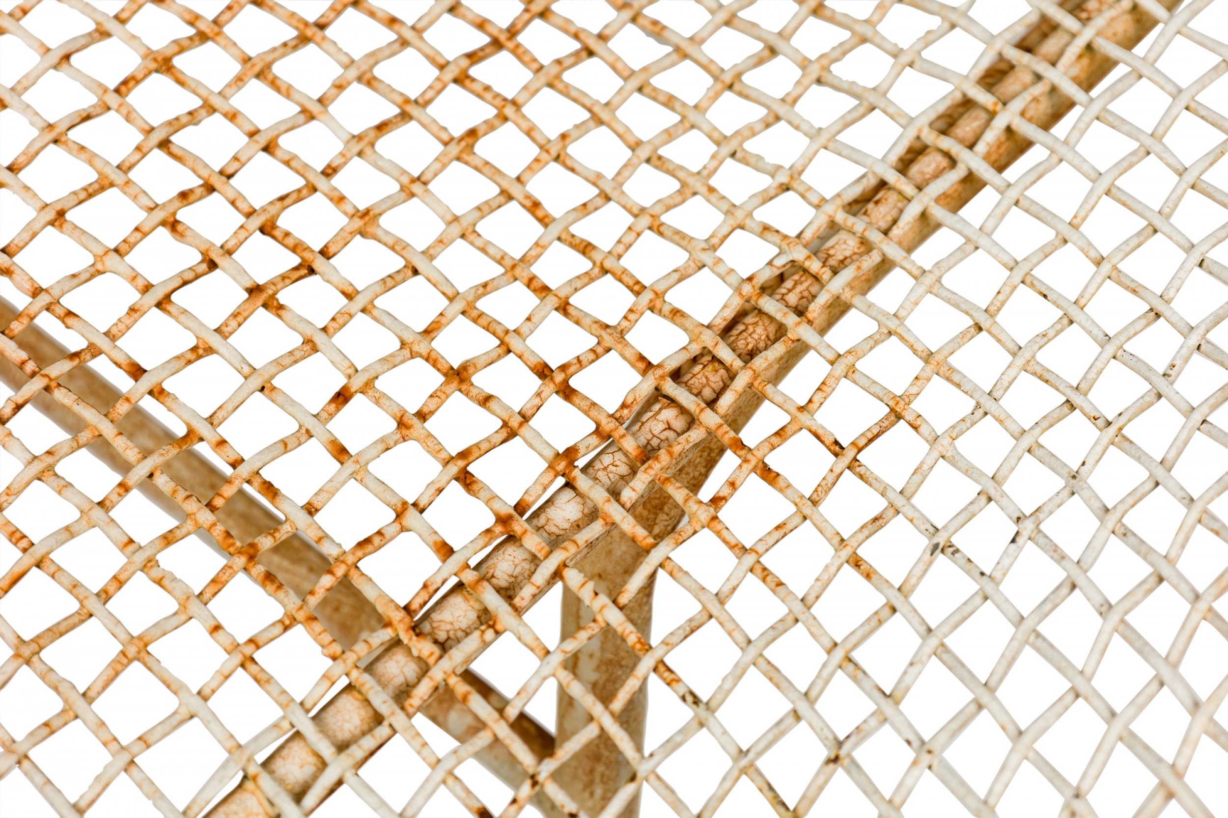 Set of 7 Russell Woodard Mid-Century "Sculptura" White Wrought Iron and Steel Mesh Low Dining Chairs