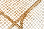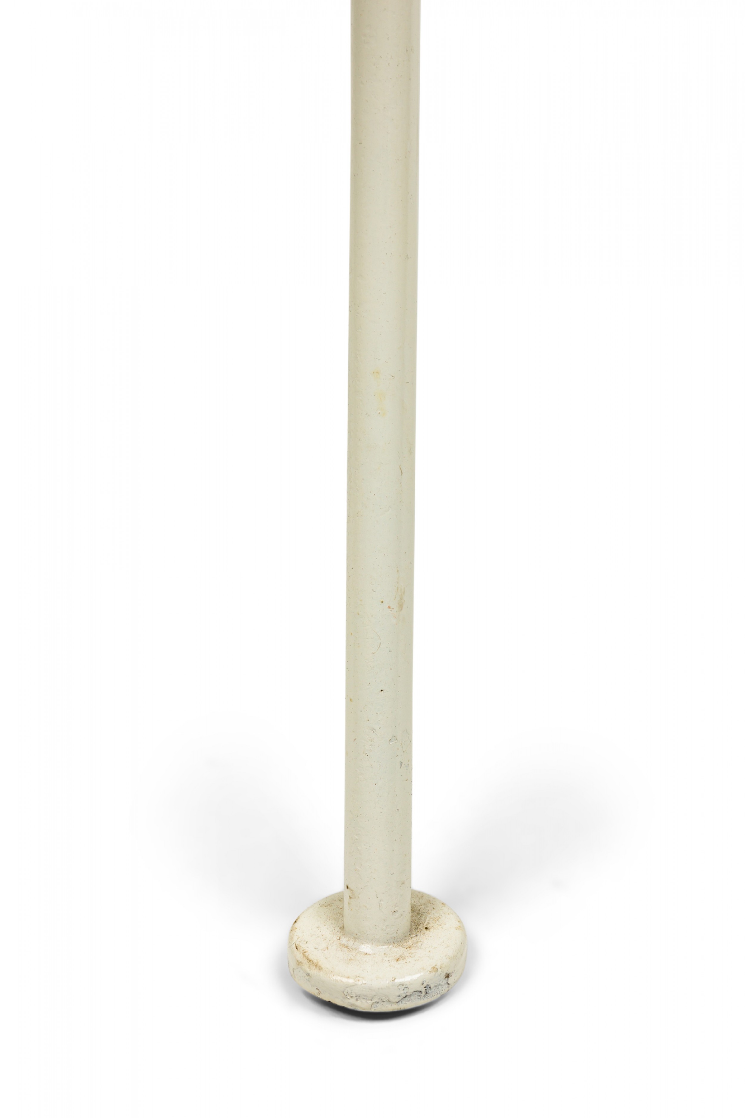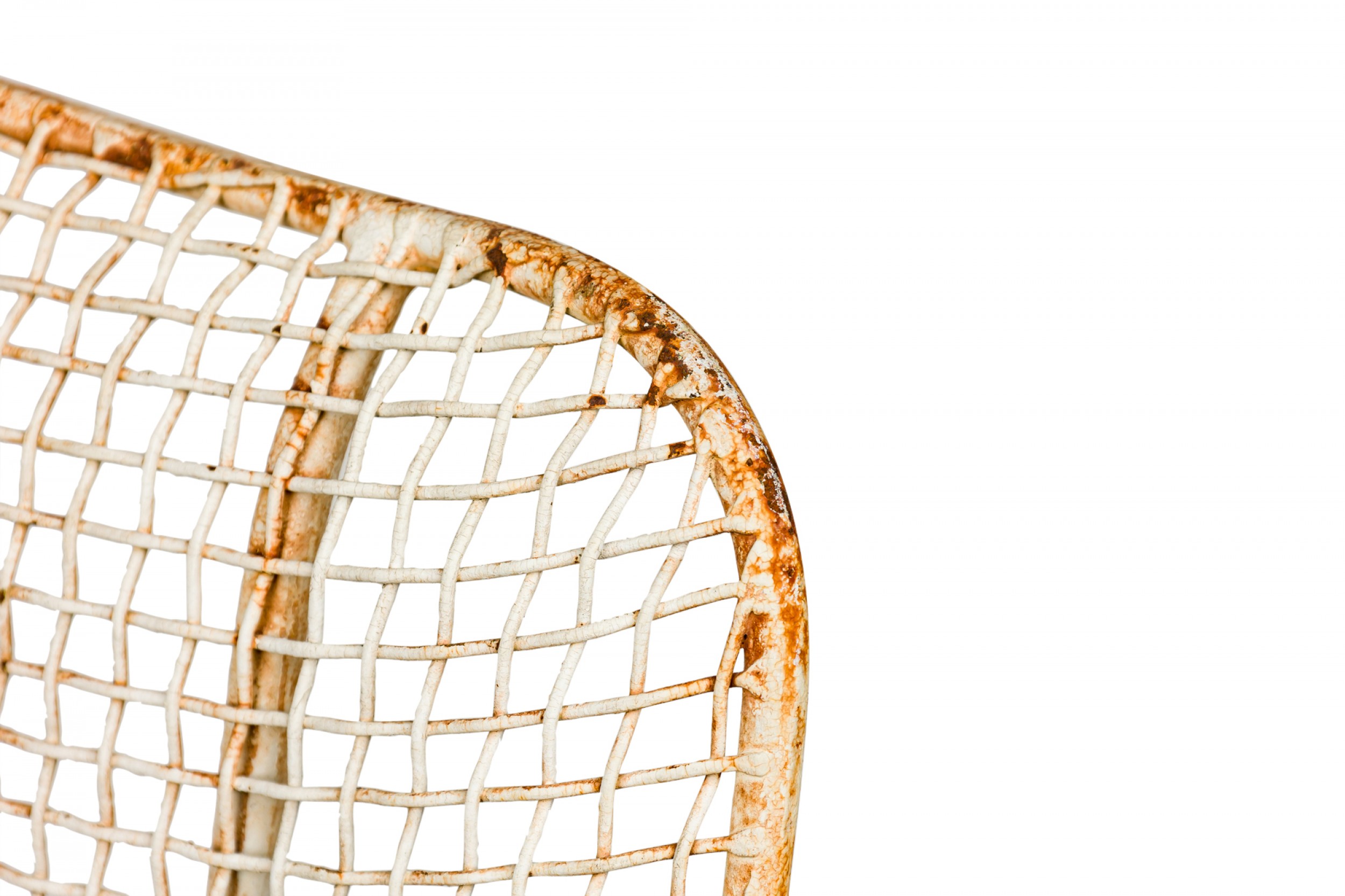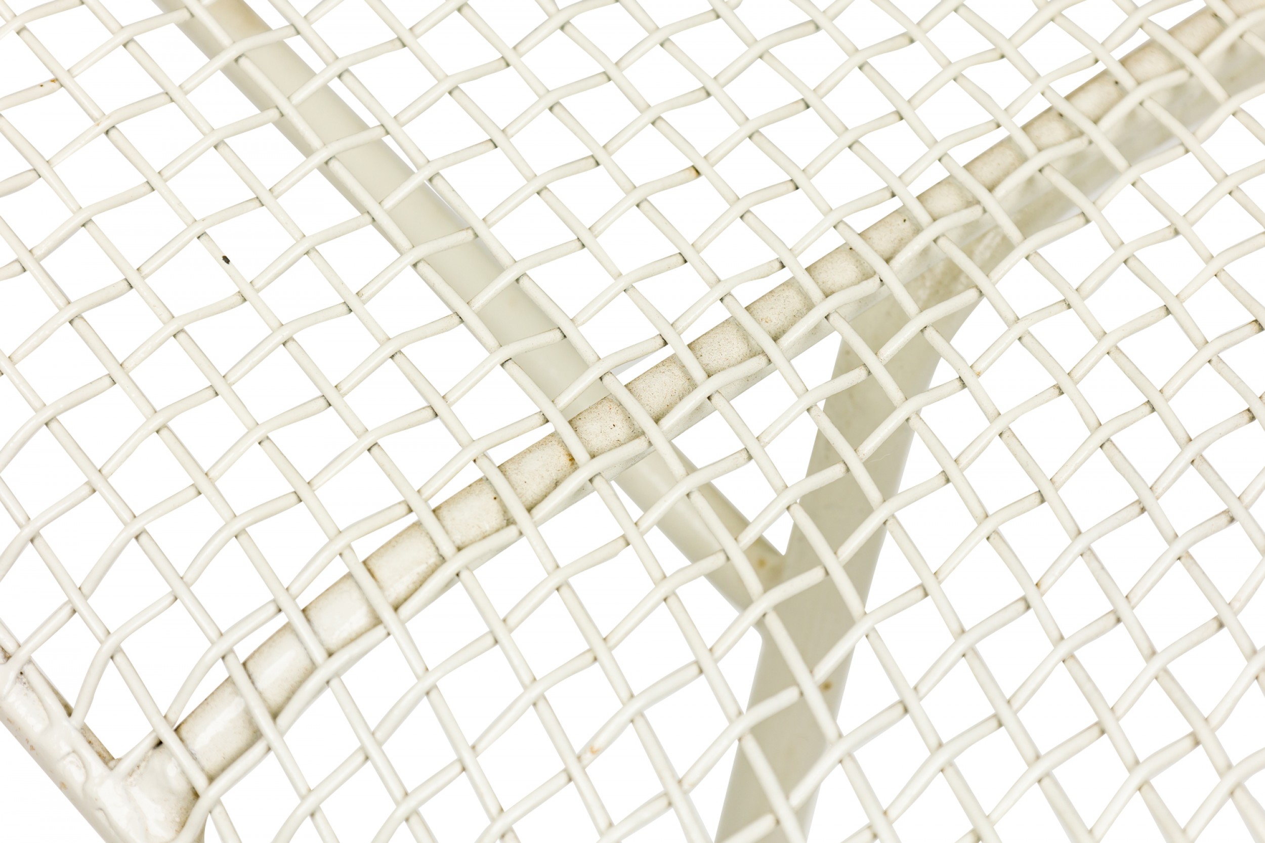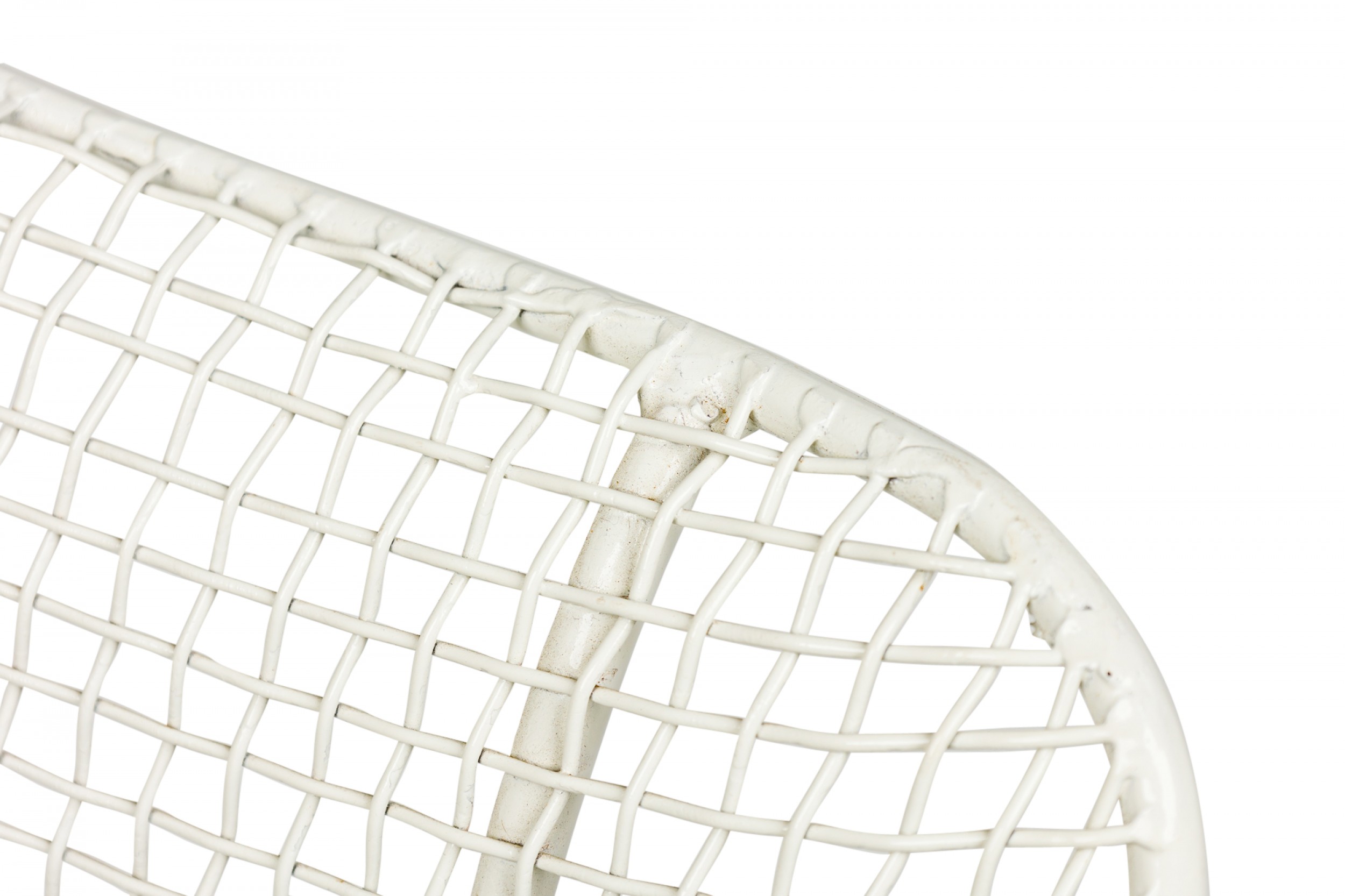 SET of 7 Mid-Century American white mesh low dining chairs made from wrought iron and woven steel for indoor and/or outdoor use (RUSSELL WOODARD)(PRICED AS SET)(Other examples as set of 6 with 2 arms: DUF0815)