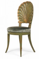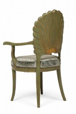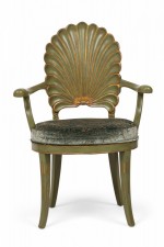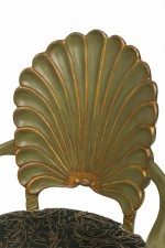 SET of 8 Italian Grotto Mid-Century carved wood dining chairs (2 arm / 6 sides) in shell form, painted green with gold leafed detailing, upholstered in a velvety green fabric with a gold embroidered seaweed outline pattern, standing on four slightly splayed legs. (PRICED AS SET).
