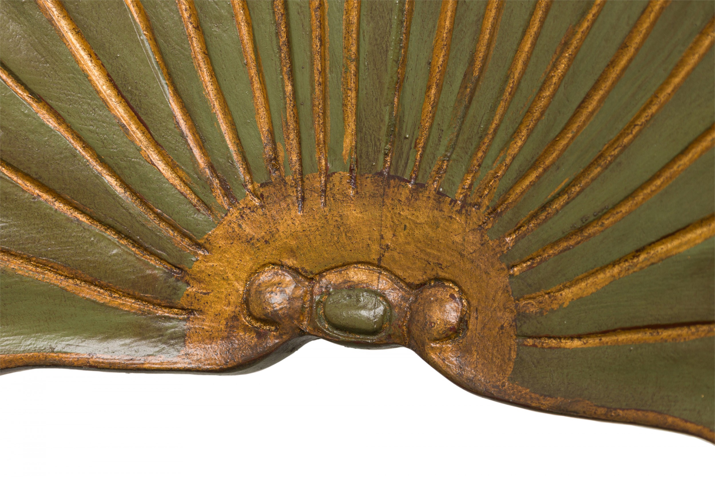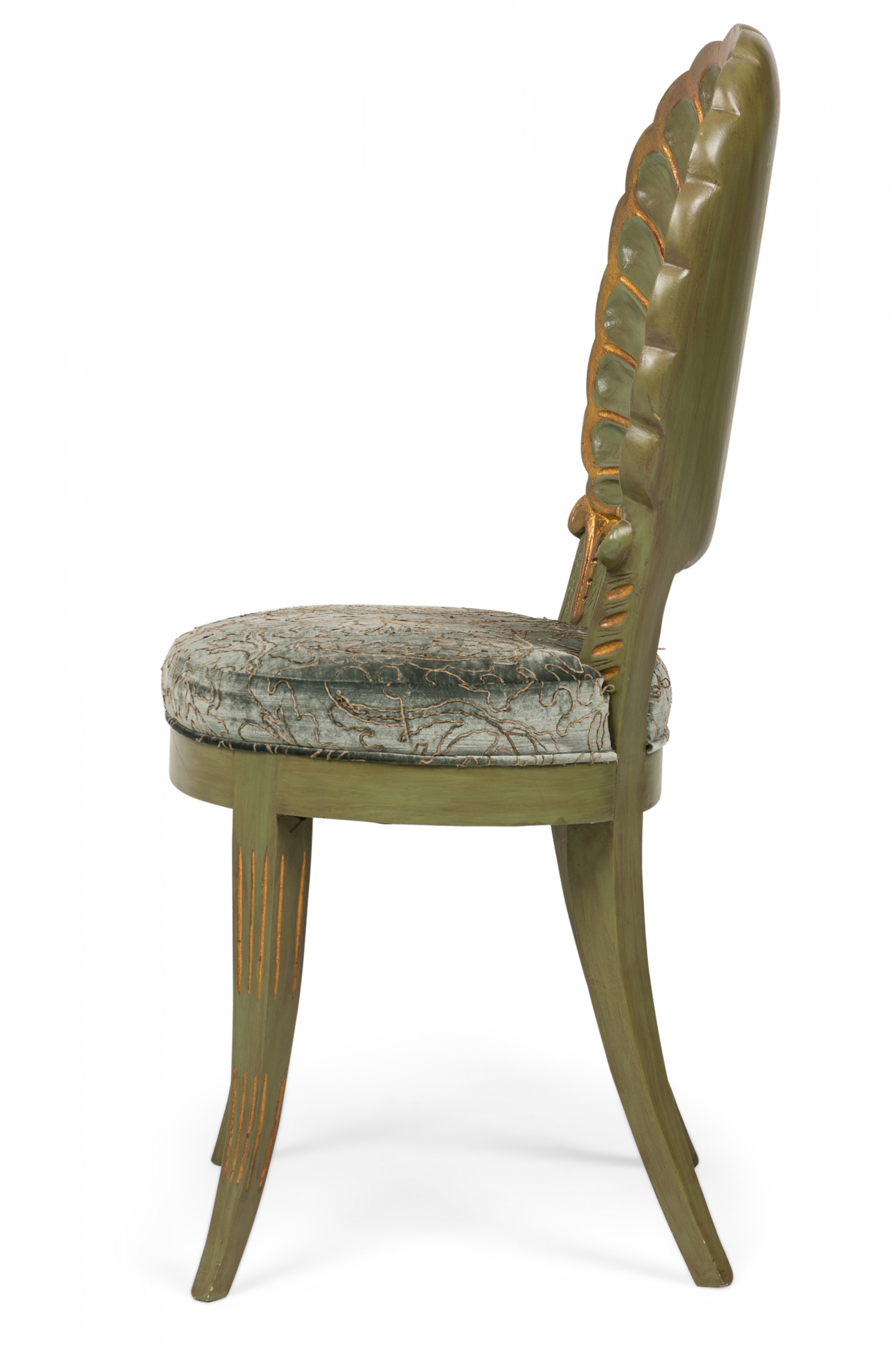 SET of 8 Italian Grotto Mid-Century carved wood dining chairs (2 arm / 6 sides) in shell form, painted green with gold leafed detailing, upholstered in a velvety green fabric with a gold embroidered seaweed outline pattern, standing on four slightly splayed legs. (PRICED AS SET)