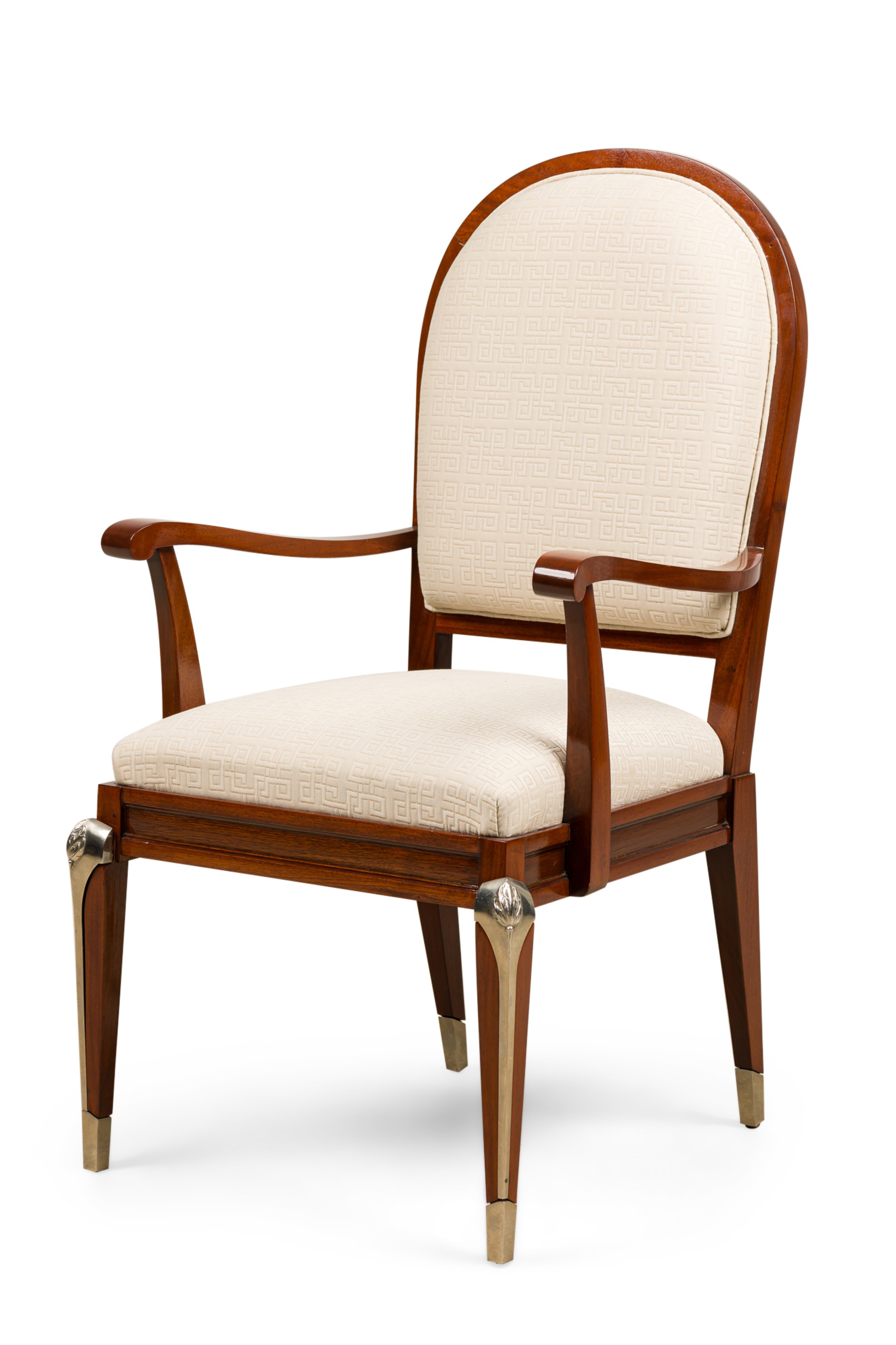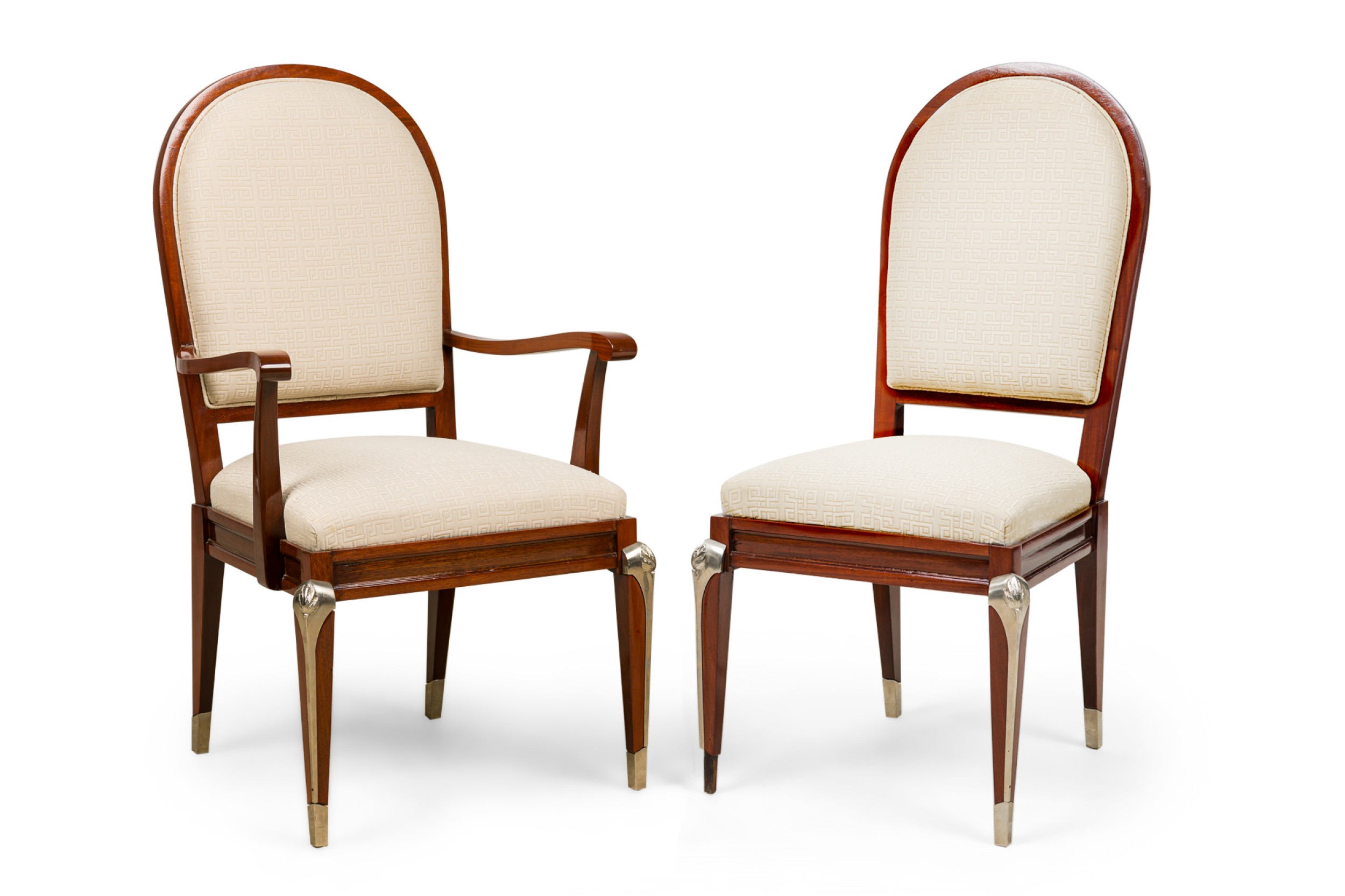 SET of 8 French Mid-Century mahogany dining chairs (2 armchairs, 6 side chairs) with rounded backs and tapered square legs with decorative silvered bronze mounts and sabots, upholstered in a lightly geometrically patterned off-white fabric. (JEAN PASCAUD) (PRICED AS SET).