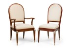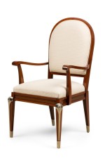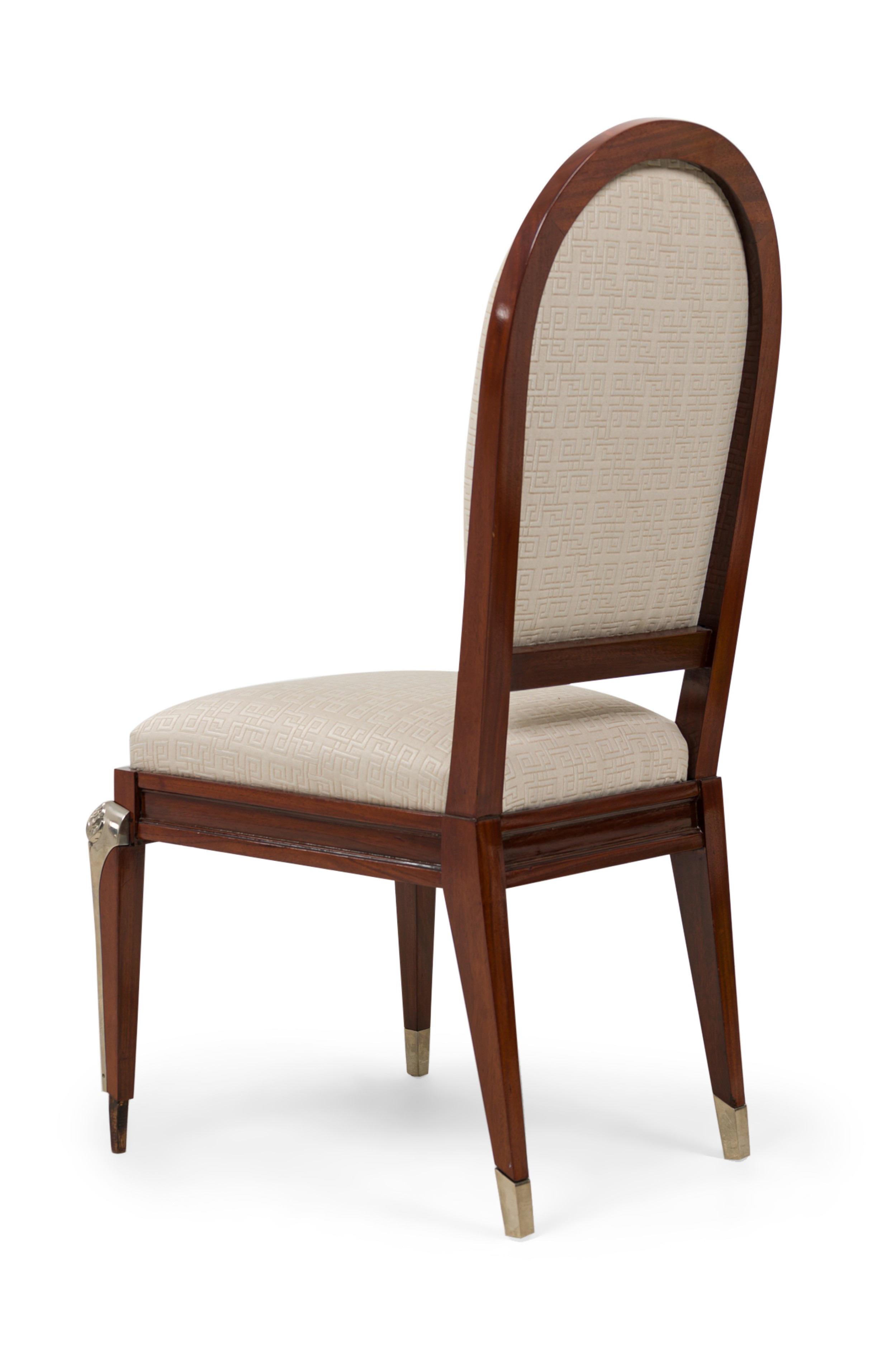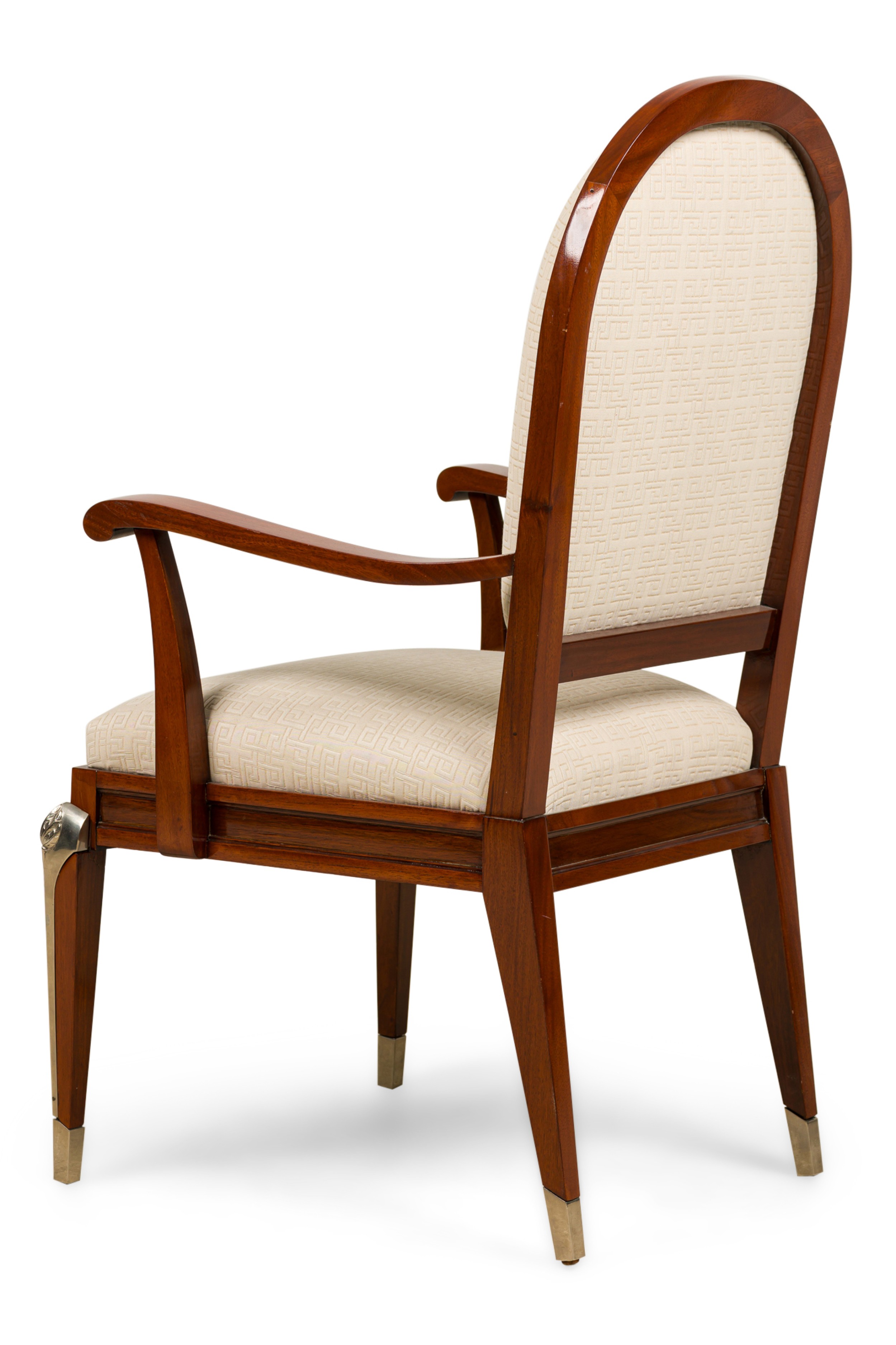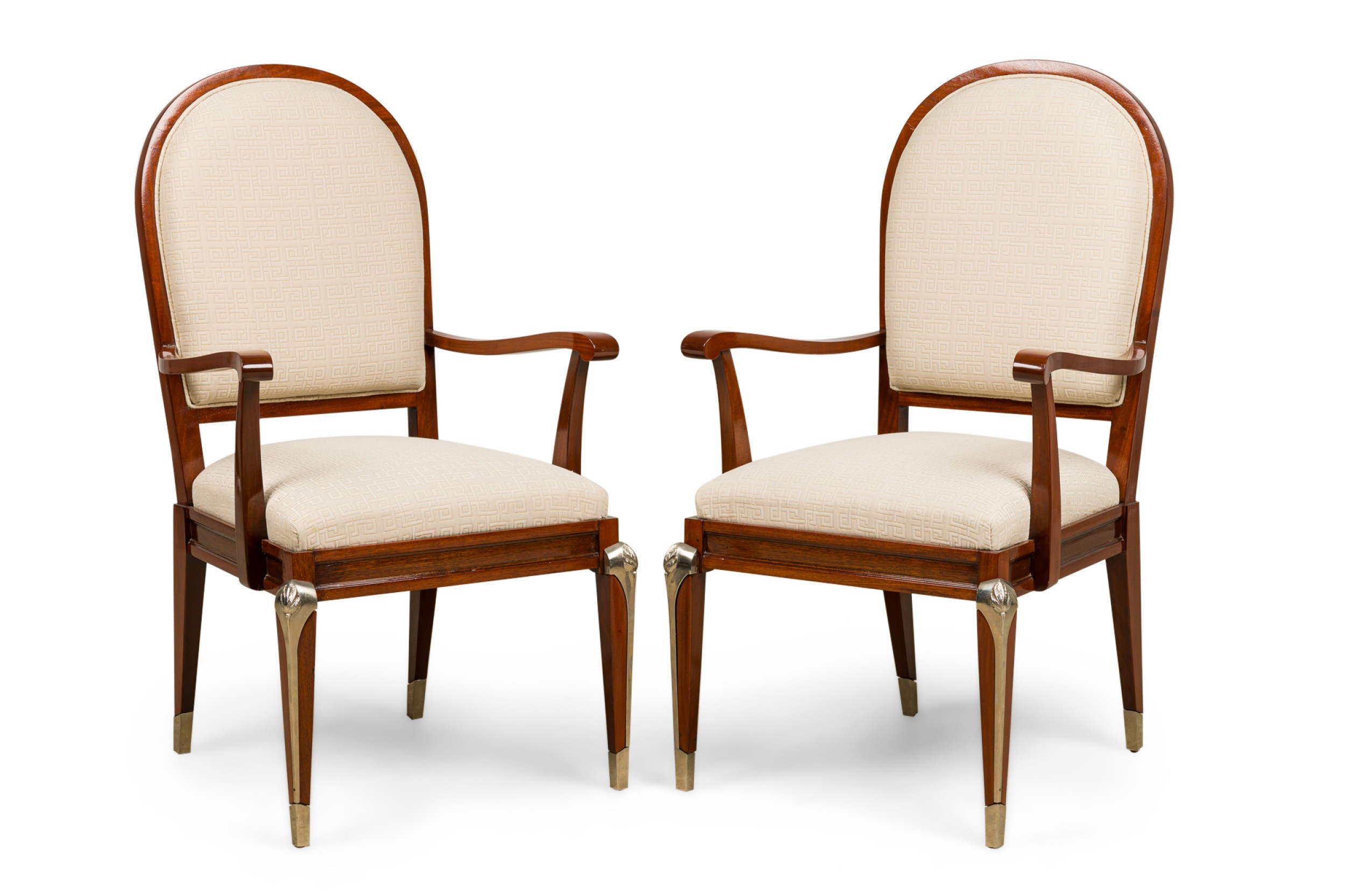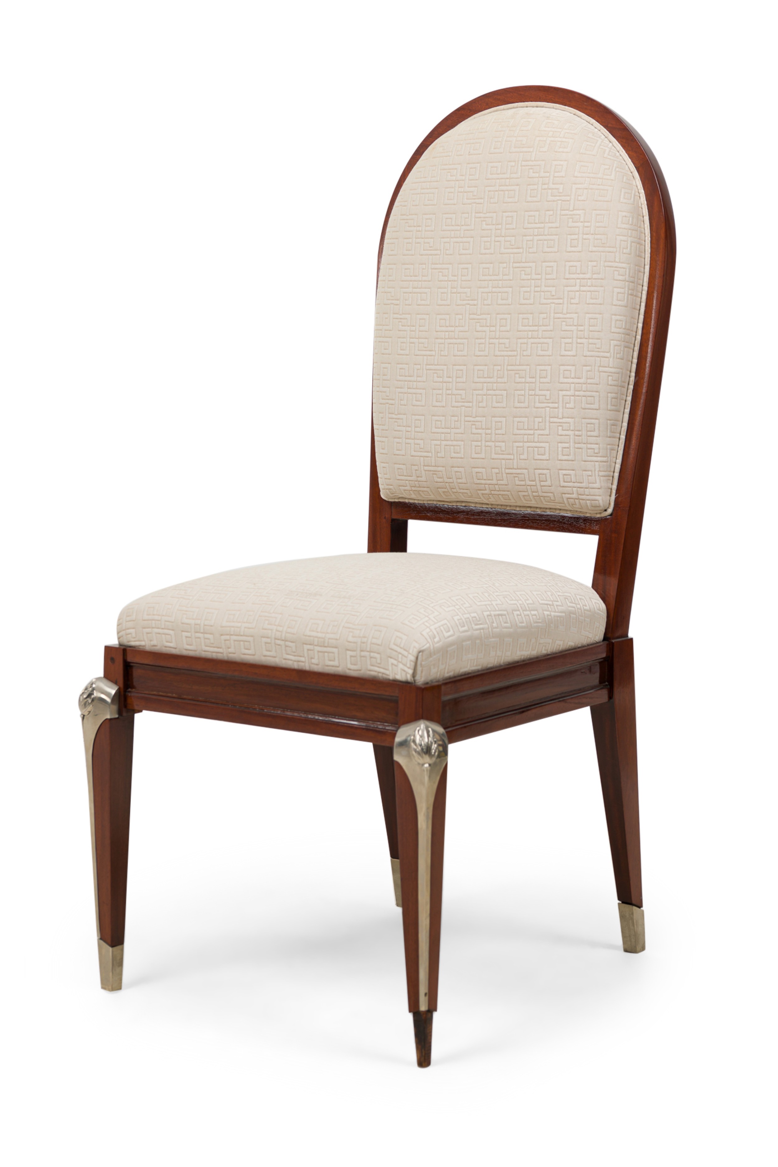 SET of 8 French Mid-Century mahogany dining chairs (2 armchairs, 6 side chairs) with rounded backs and tapered square legs with decorative silvered bronze mounts and sabots, upholstered in a lightly geometrically patterned off-white fabric. (JEAN PASCAUD) (PRICED AS SET)