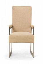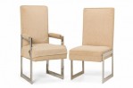 SET of 8 American Mid-Century dining chairs comprised of two armchairs and six side chairs upholstered in beige fabric with matching seat covers, and resting on square polished aluminum legs.(PACE COLLECTION)(PRICED AS SET)(Available individually: Armchairs: DUF0578A, Side Chairs: DUF0578B).