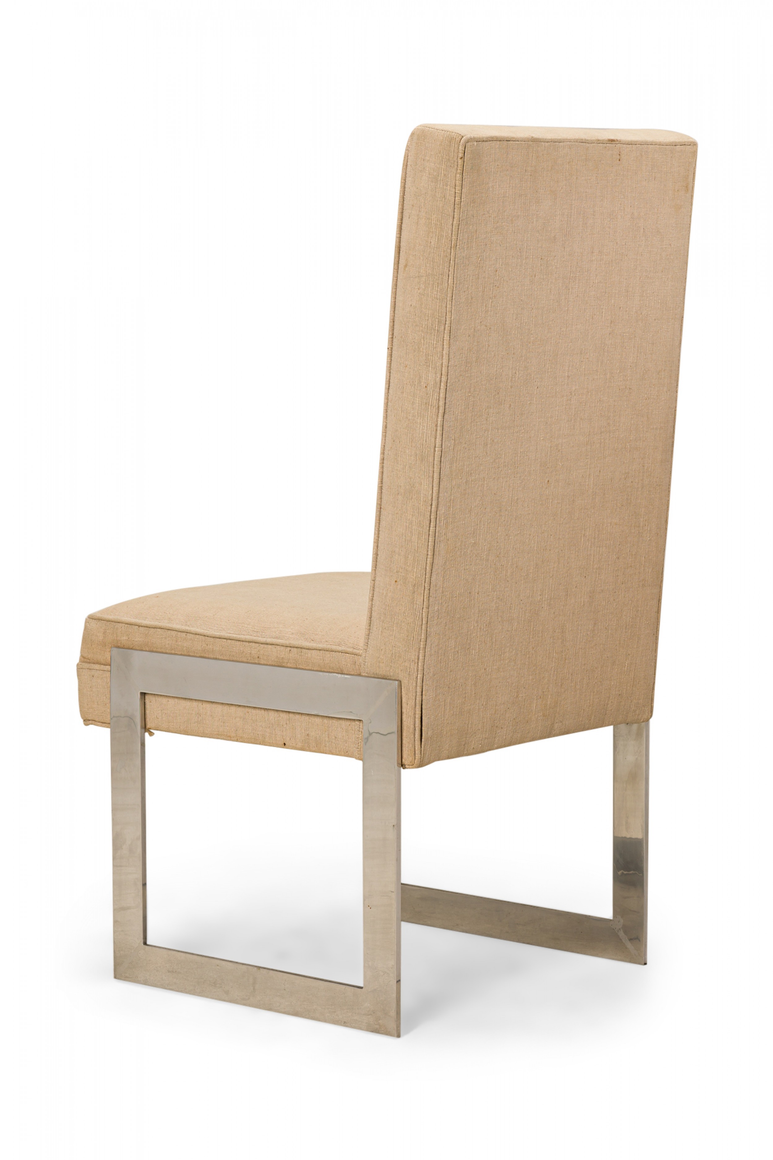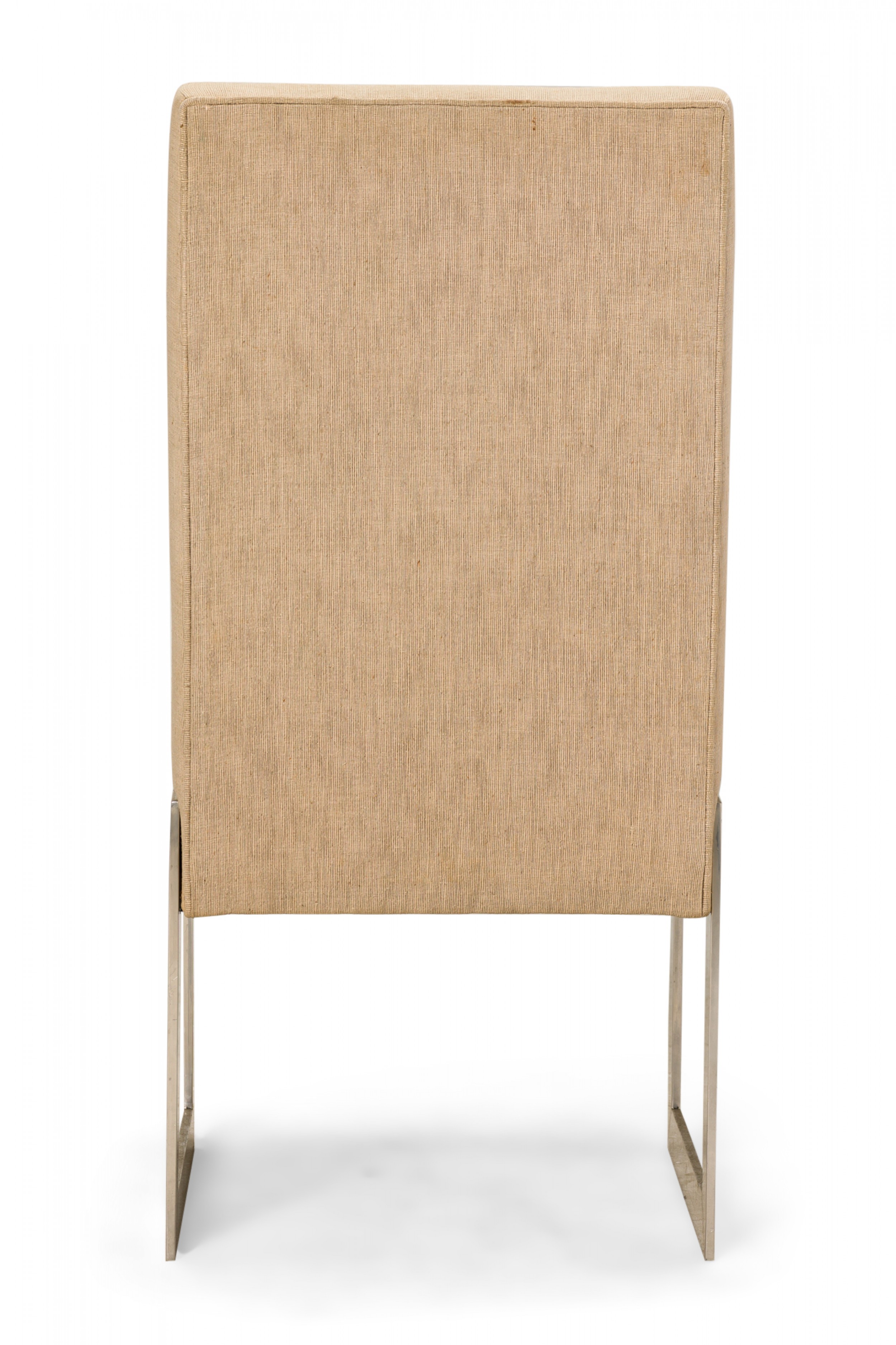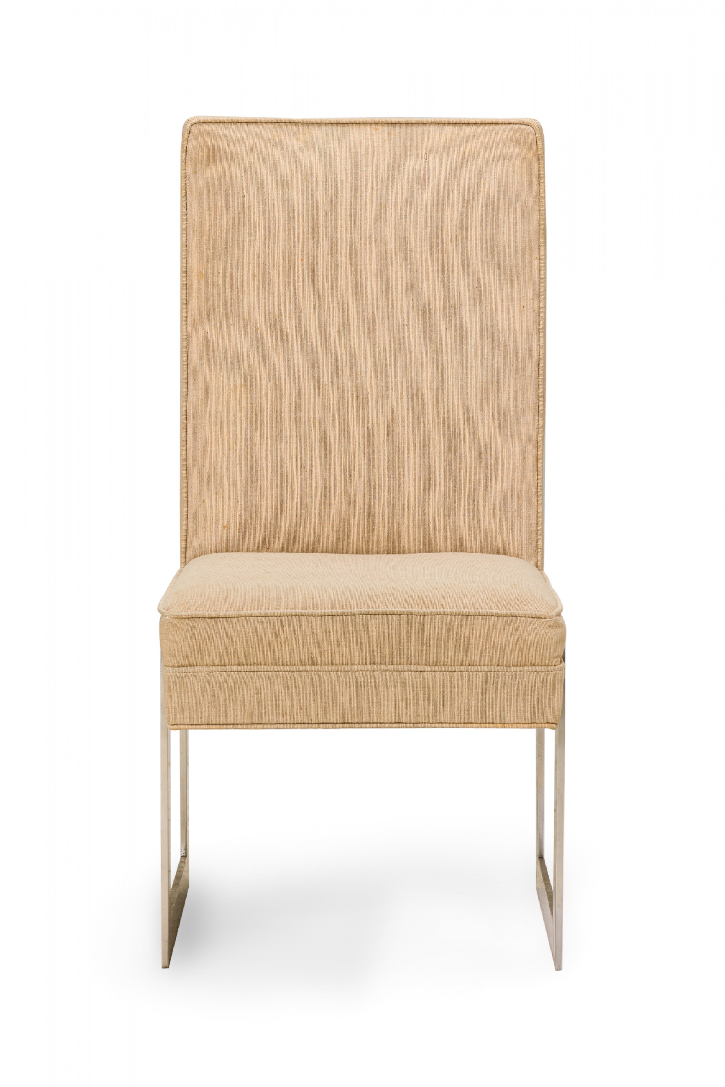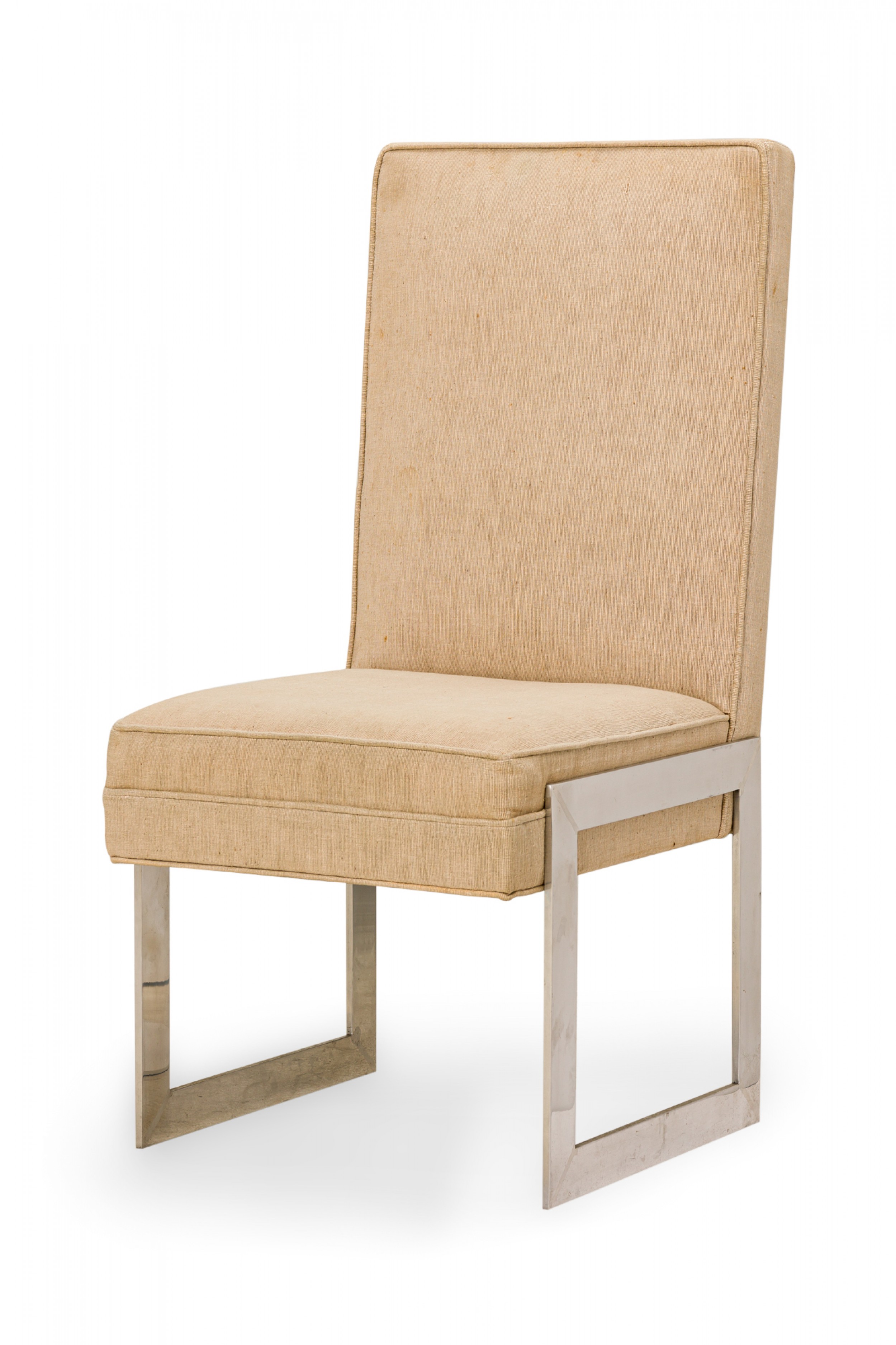 SET of 8 American Mid-Century dining chairs comprised of two armchairs and six side chairs upholstered in beige fabric with matching seat covers, and resting on square polished aluminum legs.(PACE COLLECTION)(PRICED AS SET)(Available individually: Armchairs: DUF0578A, Side Chairs: DUF0578B)