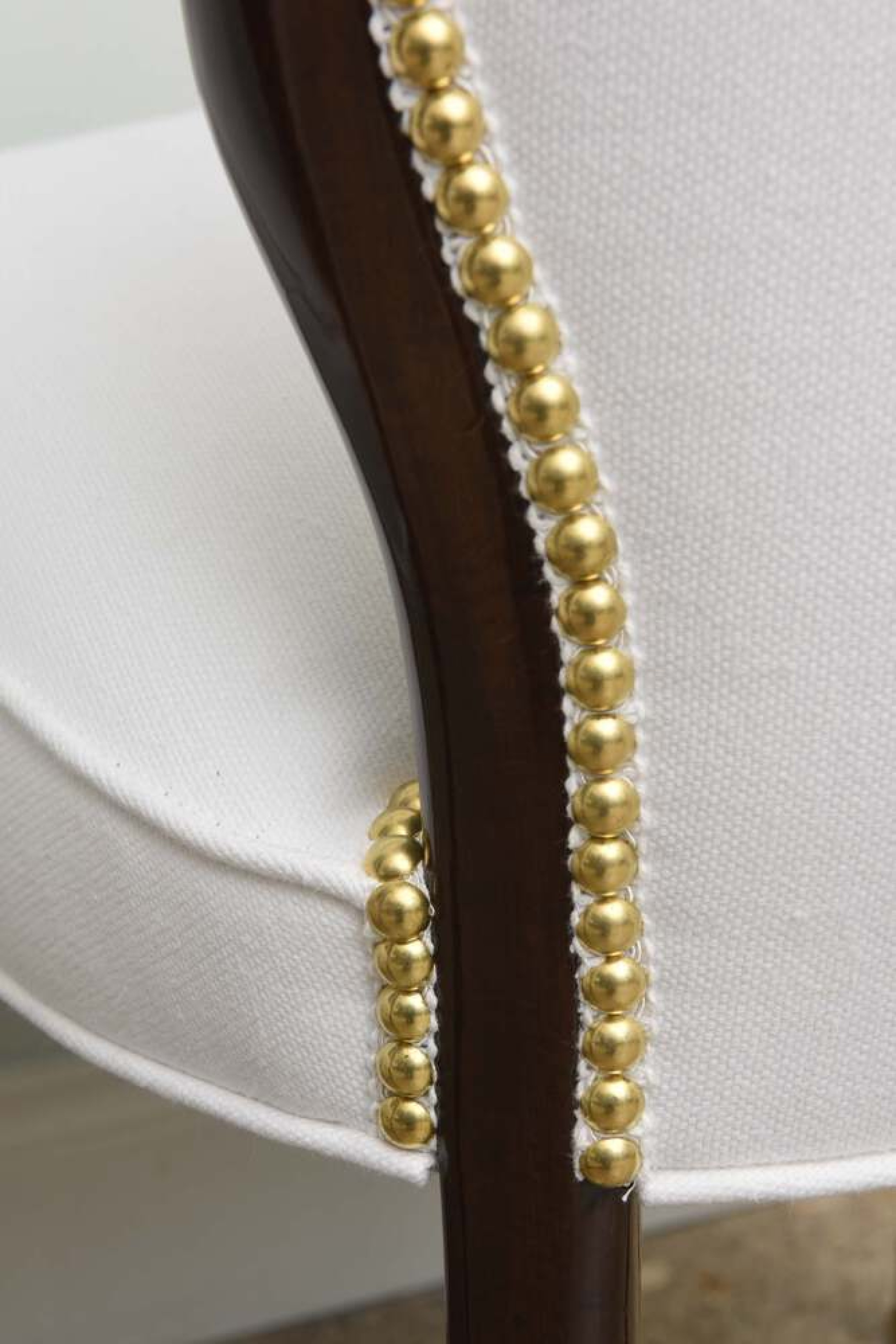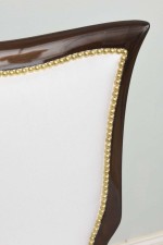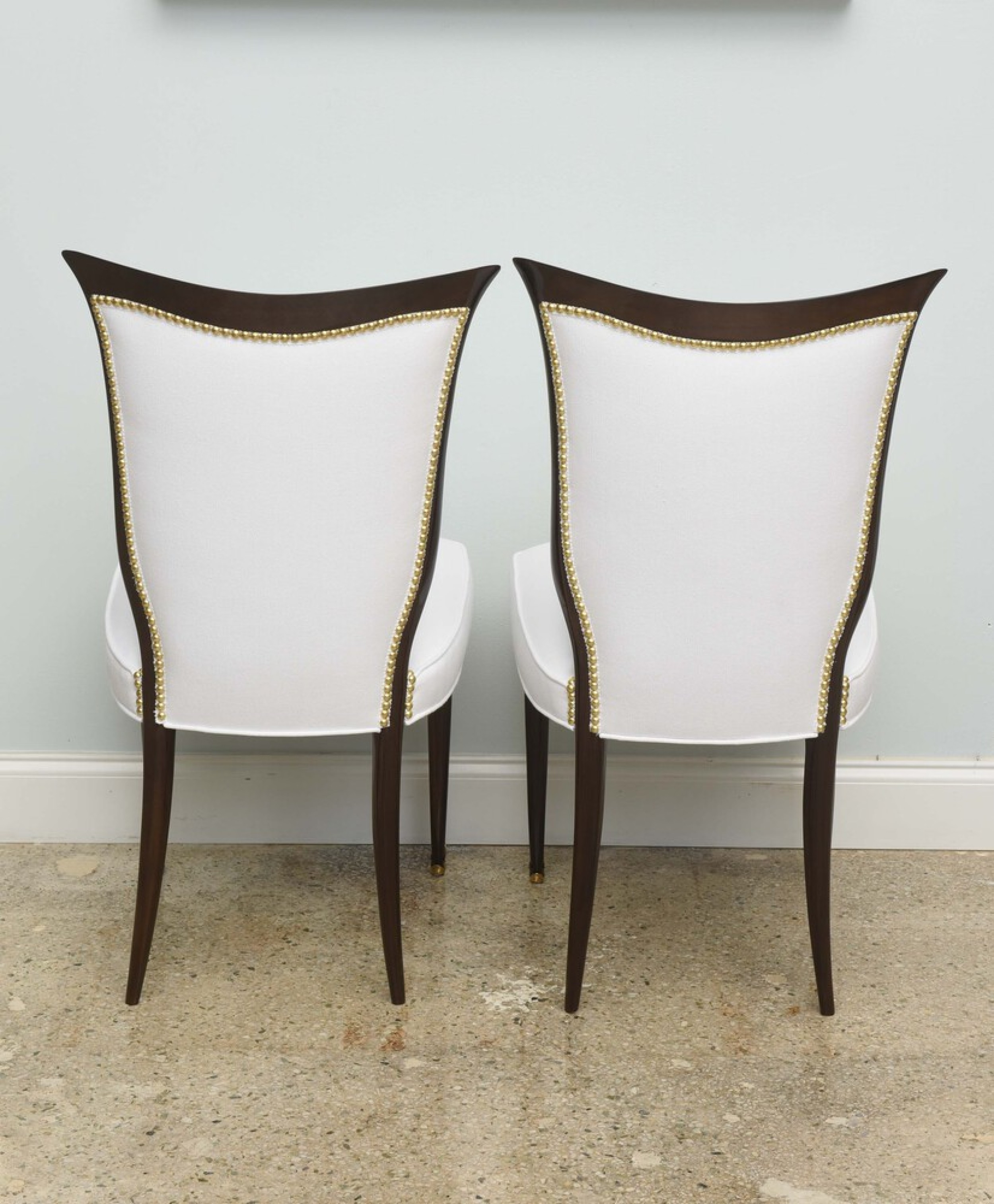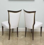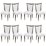 8 Italian Mid-Century modern mahogany dining side chairs with brass sabot and white upholstered seat and shaped back with nailhead trim, (OSVALDO B ORSANI)