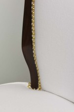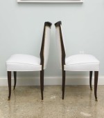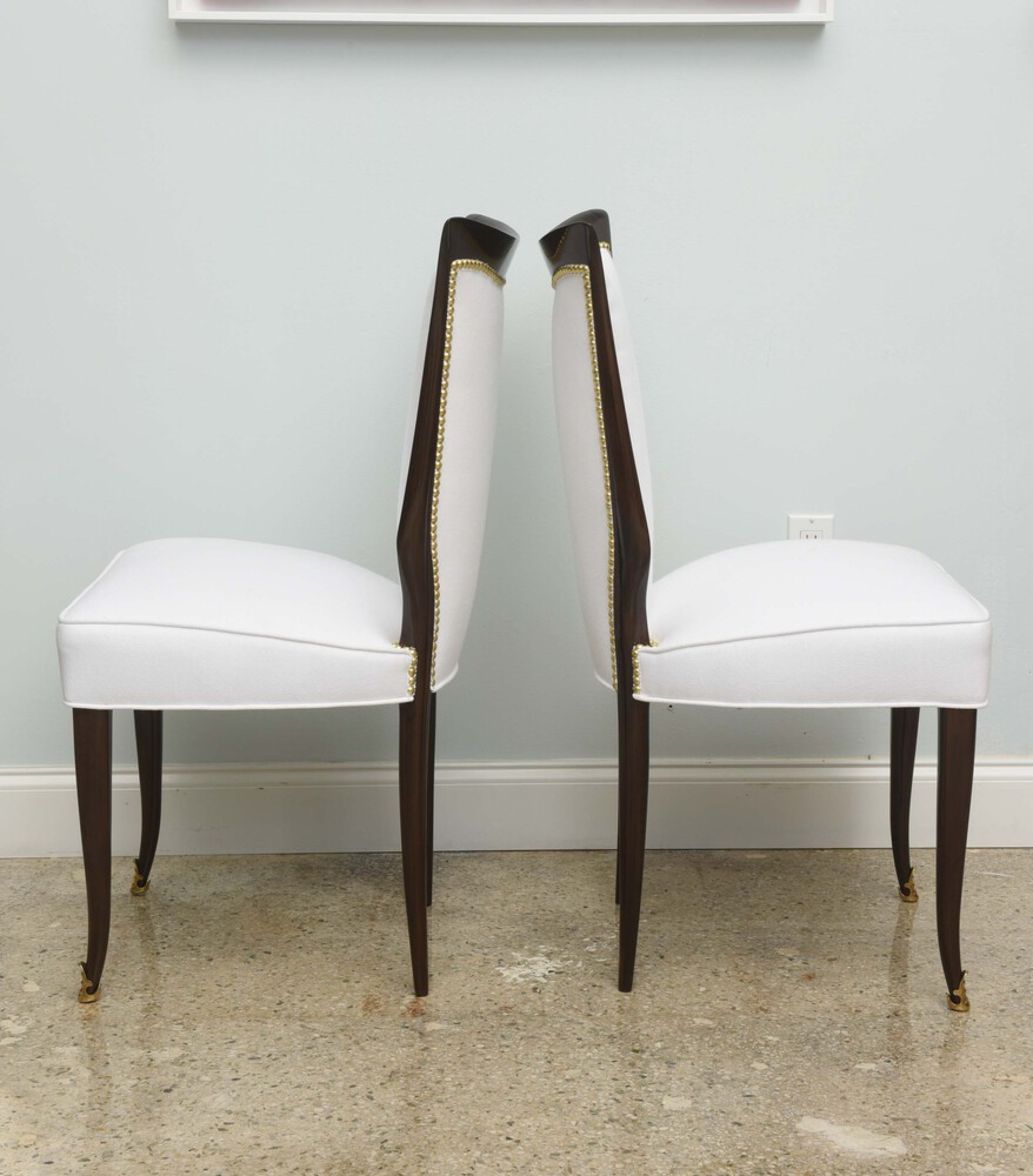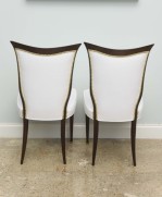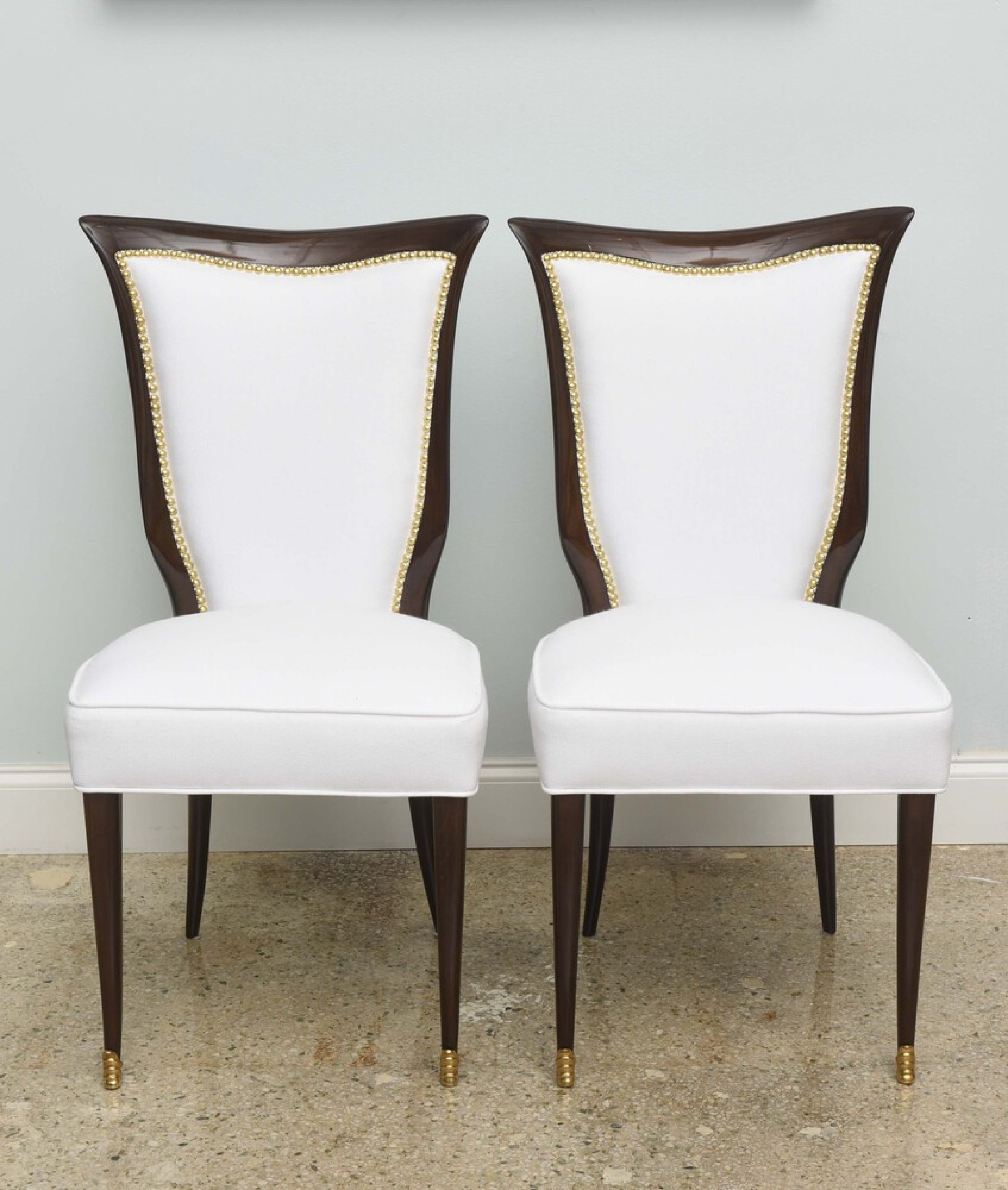 8 Italian Mid-Century modern mahogany dining side chairs with brass sabot and white upholstered seat and shaped back with nailhead trim, (OSVALDO B ORSANI).