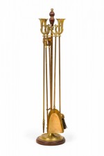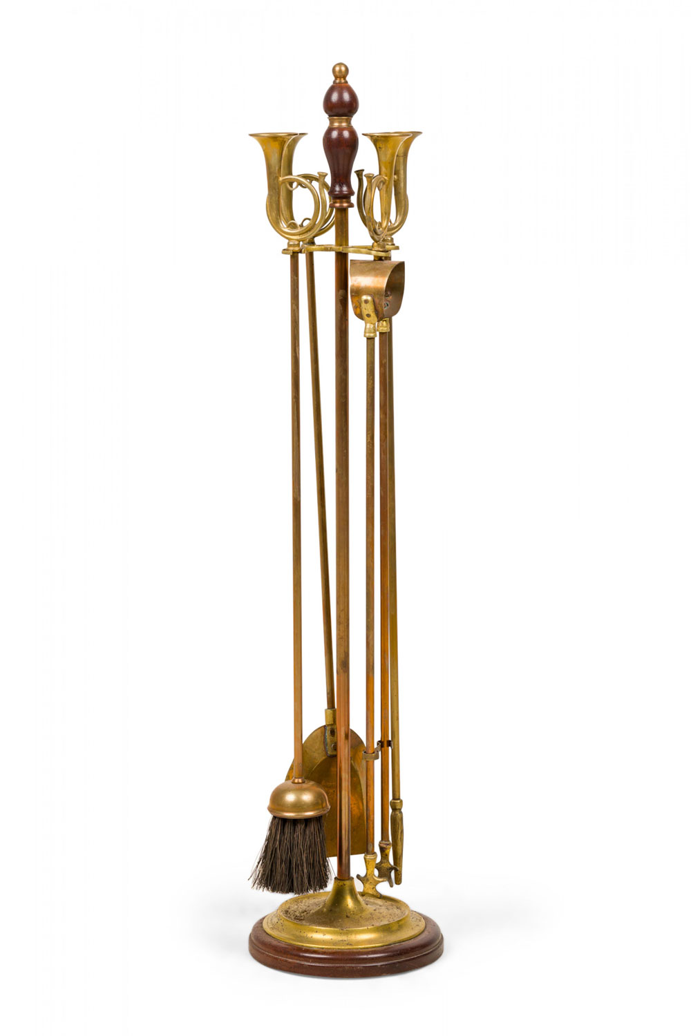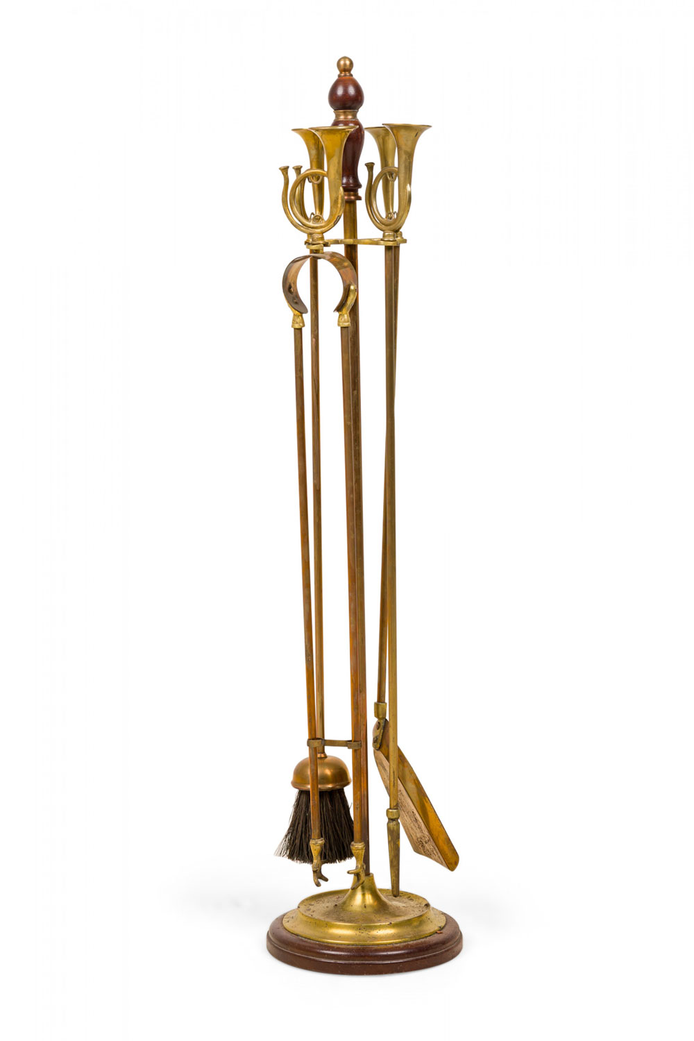 SET of English Country-style brass fire tools including a brush, shovel, poker, and tongs, all topped with finials in the shape of hunting horns, held in a brass stand with a circular foot..